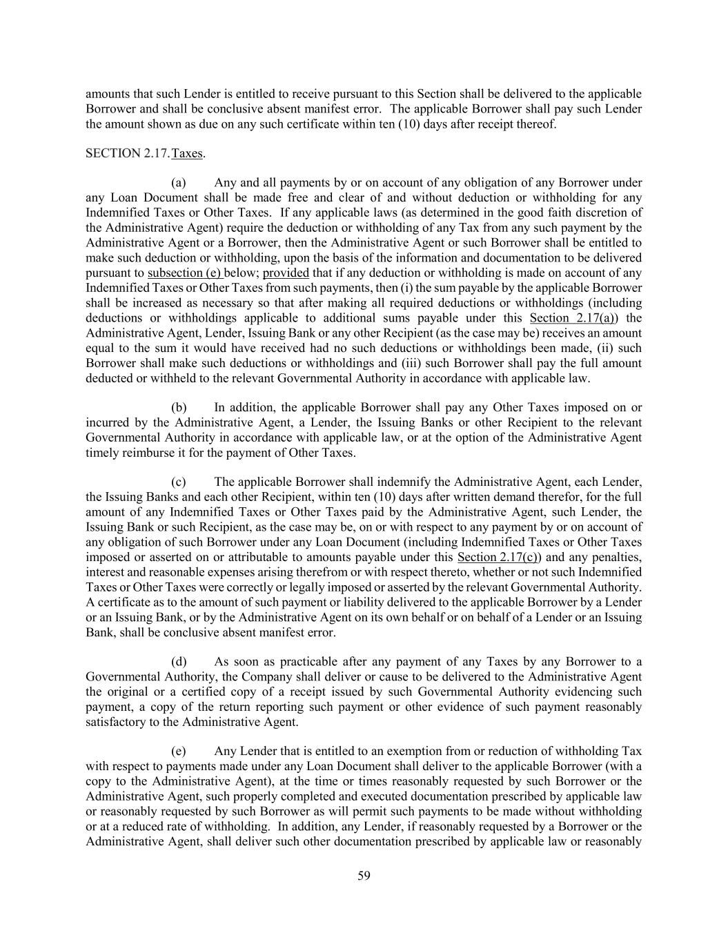 59 amounts that such Lender is entitled to receive pursuant to this Section shall be delivered to the applicable Borrower and shall be conclusive absent manifest error. The applicable Borrower shall pay such Lender the amount shown as due on any such certificate within ten (10) days after receipt thereof. Taxes. (a) Any and all payments by or on account of any obligation of any Borrower under any Loan Document shall be made free and clear of and without deduction or withholding for any Indemnified Taxes or Other Taxes. If any applicable laws (as determined in the good faith discretion of the Administrative Agent) require the deduction or withholding of any Tax from any such payment by the Administrative Agent or a Borrower, then the Administrative Agent or such Borrower shall be entitled to make such deduction or withholding, upon the basis of the information and documentation to be delivered pursuant to subsection (e) below; provided that if any deduction or withholding is made on account of any Indemnified Taxes or Other Taxes from such payments, then (i) the sum payable by the applicable Borrower shall be increased as necessary so that after making all required deductions or withholdings (including deductions or withholdings applicable to additional sums payable under this Section 2.17(a)) the Administrative Agent, Lender, Issuing Bank or any other Recipient (as the case may be) receives an amount equal to the sum it would have received had no such deductions or withholdings been made, (ii) such Borrower shall make such deductions or withholdings and (iii) such Borrower shall pay the full amount deducted or withheld to the relevant Governmental Authority in accordance with applicable law. (b) In addition, the applicable Borrower shall pay any Other Taxes imposed on or incurred by the Administrative Agent, a Lender, the Issuing Banks or other Recipient to the relevant Governmental Authority in accordance with applicable law, or at the option of the Administrative Agent timely reimburse it for the payment of Other Taxes. (c) The applicable Borrower shall indemnify the Administrative Agent, each Lender, the Issuing Banks and each other Recipient, within ten (10) days after written demand therefor, for the full amount of any Indemnified Taxes or Other Taxes paid by the Administrative Agent, such Lender, the Issuing Bank or such Recipient, as the case may be, on or with respect to any payment by or on account of any obligation of such Borrower under any Loan Document (including Indemnified Taxes or Other Taxes imposed or asserted on or attributable to amounts payable under this Section 2.17(c)) and any penalties, interest and reasonable expenses arising therefrom or with respect thereto, whether or not such Indemnified Taxes or Other Taxes were correctly or legally imposed or asserted by the relevant Governmental Authority. A certificate as to the amount of such payment or liability delivered to the applicable Borrower by a Lender or an Issuing Bank, or by the Administrative Agent on its own behalf or on behalf of a Lender or an Issuing Bank, shall be conclusive absent manifest error. (d) As soon as practicable after any payment of any Taxes by any Borrower to a Governmental Authority, the Company shall deliver or cause to be delivered to the Administrative Agent the original or a certified copy of a receipt issued by such Governmental Authority evidencing such payment, a copy of the return reporting such payment or other evidence of such payment reasonably satisfactory to the Administrative Agent. (e) Any Lender that is entitled to an exemption from or reduction of withholding Tax with respect to payments made under any Loan Document shall deliver to the applicable Borrower (with a copy to the Administrative Agent), at the time or times reasonably requested by such Borrower or the Administrative Agent, such properly completed and executed documentation prescribed by applicable law or reasonably requested by such Borrower as will permit such payments to be made without withholding or at a reduced rate of withholding. In addition, any Lender, if reasonably requested by a Borrower or the Administrative Agent, shall deliver such other documentation prescribed by applicable law or reasonably