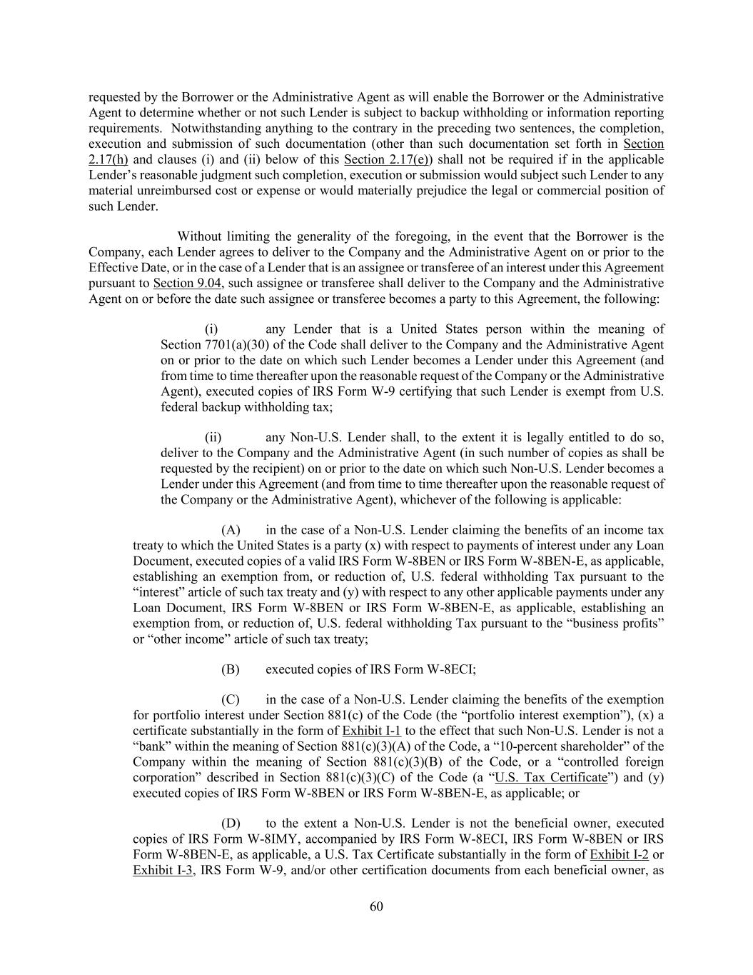 60 requested by the Borrower or the Administrative Agent as will enable the Borrower or the Administrative Agent to determine whether or not such Lender is subject to backup withholding or information reporting requirements. Notwithstanding anything to the contrary in the preceding two sentences, the completion, execution and submission of such documentation (other than such documentation set forth in Section 2.17(h) and clauses (i) and (ii) below of this Section 2.17(e)) shall not be required if in the applicable Lender’s reasonable judgment such completion, execution or submission would subject such Lender to any material unreimbursed cost or expense or would materially prejudice the legal or commercial position of such Lender. Without limiting the generality of the foregoing, in the event that the Borrower is the Company, each Lender agrees to deliver to the Company and the Administrative Agent on or prior to the Effective Date, or in the case of a Lender that is an assignee or transferee of an interest under this Agreement pursuant to Section 9.04, such assignee or transferee shall deliver to the Company and the Administrative Agent on or before the date such assignee or transferee becomes a party to this Agreement, the following: (i) any Lender that is a United States person within the meaning of Section 7701(a)(30) of the Code shall deliver to the Company and the Administrative Agent on or prior to the date on which such Lender becomes a Lender under this Agreement (and from time to time thereafter upon the reasonable request of the Company or the Administrative Agent), executed copies of IRS Form W-9 certifying that such Lender is exempt from U.S. federal backup withholding tax; (ii) any Non-U.S. Lender shall, to the extent it is legally entitled to do so, deliver to the Company and the Administrative Agent (in such number of copies as shall be requested by the recipient) on or prior to the date on which such Non-U.S. Lender becomes a Lender under this Agreement (and from time to time thereafter upon the reasonable request of the Company or the Administrative Agent), whichever of the following is applicable: (A) in the case of a Non-U.S. Lender claiming the benefits of an income tax treaty to which the United States is a party (x) with respect to payments of interest under any Loan Document, executed copies of a valid IRS Form W-8BEN or IRS Form W-8BEN-E, as applicable, establishing an exemption from, or reduction of, U.S. federal withholding Tax pursuant to the “interest” article of such tax treaty and (y) with respect to any other applicable payments under any Loan Document, IRS Form W-8BEN or IRS Form W-8BEN-E, as applicable, establishing an exemption from, or reduction of, U.S. federal withholding Tax pursuant to the “business profits” or “other income” article of such tax treaty; (B) executed copies of IRS Form W-8ECI; (C) in the case of a Non-U.S. Lender claiming the benefits of the exemption for portfolio interest under Section 881(c) of the Code (the “portfolio interest exemption”), (x) a certificate substantially in the form of Exhibit I-1 to the effect that such Non-U.S. Lender is not a “bank” within the meaning of Section 881(c)(3)(A) of the Code, a “10-percent shareholder” of the Company within the meaning of Section 881(c)(3)(B) of the Code, or a “controlled foreign corporation” described in Section 881(c)(3)(C) of the Code (a “U.S. Tax Certificate”) and (y) executed copies of IRS Form W-8BEN or IRS Form W-8BEN-E, as applicable; or (D) to the extent a Non-U.S. Lender is not the beneficial owner, executed copies of IRS Form W-8IMY, accompanied by IRS Form W-8ECI, IRS Form W-8BEN or IRS Form W-8BEN-E, as applicable, a U.S. Tax Certificate substantially in the form of Exhibit I-2 or Exhibit I-3, IRS Form W-9, and/or other certification documents from each beneficial owner, as