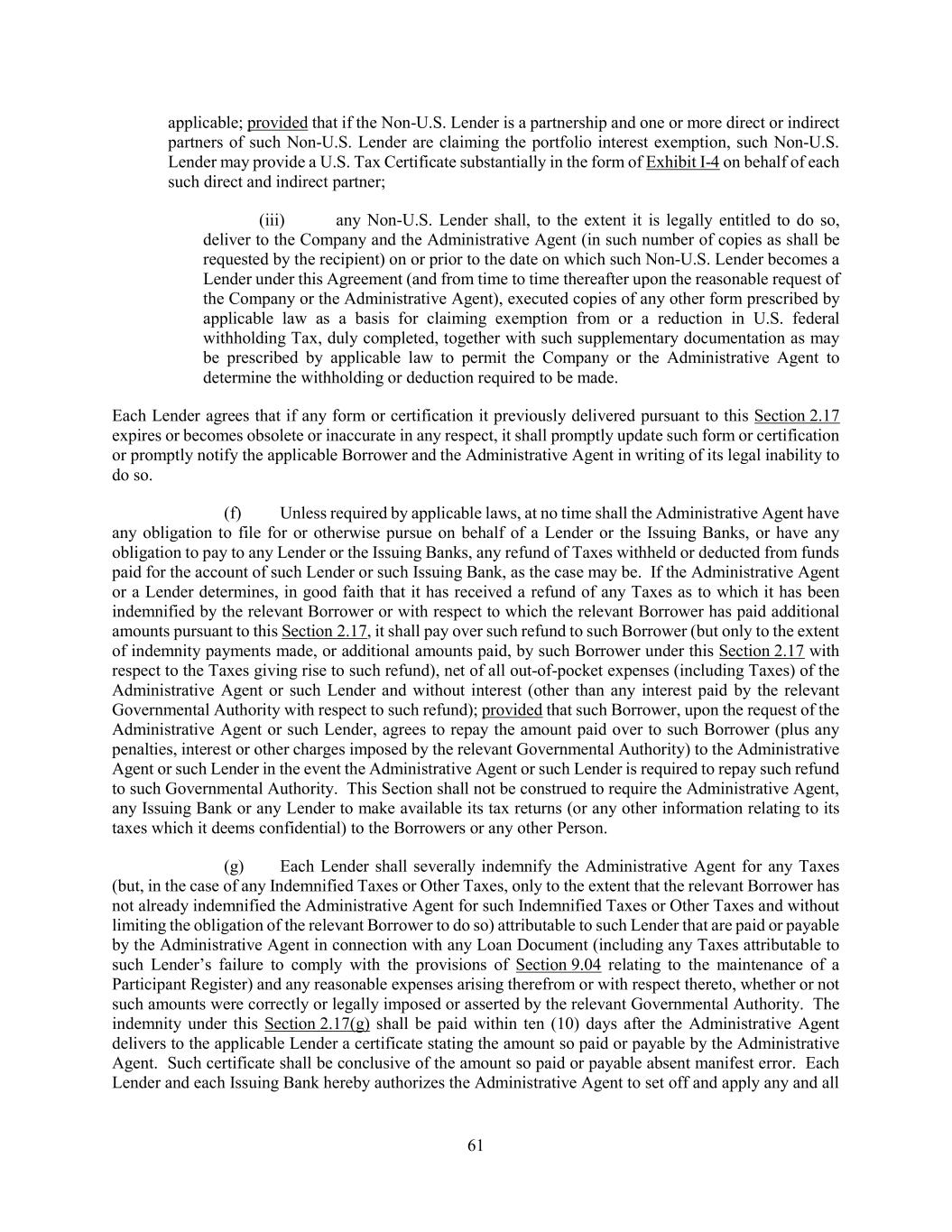 61 applicable; provided that if the Non-U.S. Lender is a partnership and one or more direct or indirect partners of such Non-U.S. Lender are claiming the portfolio interest exemption, such Non-U.S. Lender may provide a U.S. Tax Certificate substantially in the form of Exhibit I-4 on behalf of each such direct and indirect partner; (iii) any Non-U.S. Lender shall, to the extent it is legally entitled to do so, deliver to the Company and the Administrative Agent (in such number of copies as shall be requested by the recipient) on or prior to the date on which such Non-U.S. Lender becomes a Lender under this Agreement (and from time to time thereafter upon the reasonable request of the Company or the Administrative Agent), executed copies of any other form prescribed by applicable law as a basis for claiming exemption from or a reduction in U.S. federal withholding Tax, duly completed, together with such supplementary documentation as may be prescribed by applicable law to permit the Company or the Administrative Agent to determine the withholding or deduction required to be made. Each Lender agrees that if any form or certification it previously delivered pursuant to this Section 2.17 expires or becomes obsolete or inaccurate in any respect, it shall promptly update such form or certification or promptly notify the applicable Borrower and the Administrative Agent in writing of its legal inability to do so. (f) Unless required by applicable laws, at no time shall the Administrative Agent have any obligation to file for or otherwise pursue on behalf of a Lender or the Issuing Banks, or have any obligation to pay to any Lender or the Issuing Banks, any refund of Taxes withheld or deducted from funds paid for the account of such Lender or such Issuing Bank, as the case may be. If the Administrative Agent or a Lender determines, in good faith that it has received a refund of any Taxes as to which it has been indemnified by the relevant Borrower or with respect to which the relevant Borrower has paid additional amounts pursuant to this Section 2.17, it shall pay over such refund to such Borrower (but only to the extent of indemnity payments made, or additional amounts paid, by such Borrower under this Section 2.17 with respect to the Taxes giving rise to such refund), net of all out-of-pocket expenses (including Taxes) of the Administrative Agent or such Lender and without interest (other than any interest paid by the relevant Governmental Authority with respect to such refund); provided that such Borrower, upon the request of the Administrative Agent or such Lender, agrees to repay the amount paid over to such Borrower (plus any penalties, interest or other charges imposed by the relevant Governmental Authority) to the Administrative Agent or such Lender in the event the Administrative Agent or such Lender is required to repay such refund to such Governmental Authority. This Section shall not be construed to require the Administrative Agent, any Issuing Bank or any Lender to make available its tax returns (or any other information relating to its taxes which it deems confidential) to the Borrowers or any other Person. (g) Each Lender shall severally indemnify the Administrative Agent for any Taxes (but, in the case of any Indemnified Taxes or Other Taxes, only to the extent that the relevant Borrower has not already indemnified the Administrative Agent for such Indemnified Taxes or Other Taxes and without limiting the obligation of the relevant Borrower to do so) attributable to such Lender that are paid or payable by the Administrative Agent in connection with any Loan Document (including any Taxes attributable to such Lender’s failure to comply with the provisions of Section 9.04 relating to the maintenance of a Participant Register) and any reasonable expenses arising therefrom or with respect thereto, whether or not such amounts were correctly or legally imposed or asserted by the relevant Governmental Authority. The indemnity under this Section 2.17(g) shall be paid within ten (10) days after the Administrative Agent delivers to the applicable Lender a certificate stating the amount so paid or payable by the Administrative Agent. Such certificate shall be conclusive of the amount so paid or payable absent manifest error. Each Lender and each Issuing Bank hereby authorizes the Administrative Agent to set off and apply any and all