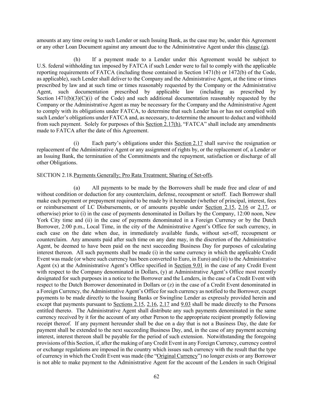 62 amounts at any time owing to such Lender or such Issuing Bank, as the case may be, under this Agreement or any other Loan Document against any amount due to the Administrative Agent under this clause (g). (h) If a payment made to a Lender under this Agreement would be subject to U.S. federal withholding tax imposed by FATCA if such Lender were to fail to comply with the applicable reporting requirements of FATCA (including those contained in Section 1471(b) or 1472(b) of the Code, as applicable), such Lender shall deliver to the Company and the Administrative Agent, at the time or times prescribed by law and at such time or times reasonably requested by the Company or the Administrative Agent, such documentation prescribed by applicable law (including as prescribed by Section 1471(b)(3)(C)(i) of the Code) and such additional documentation reasonably requested by the Company or the Administrative Agent as may be necessary for the Company and the Administrative Agent to comply with its obligations under FATCA, to determine that such Lender has or has not complied with such Lender’s obligations under FATCA and, as necessary, to determine the amount to deduct and withhold from such payment. Solely for purposes of this Section 2.17(h), “FATCA” shall include any amendments made to FATCA after the date of this Agreement. (i) Each party’s obligations under this Section 2.17 shall survive the resignation or replacement of the Administrative Agent or any assignment of rights by, or the replacement of, a Lender or an Issuing Bank, the termination of the Commitments and the repayment, satisfaction or discharge of all other Obligations. Payments Generally; Pro Rata Treatment; Sharing of Set-offs. (a) All payments to be made by the Borrowers shall be made free and clear of and without condition or deduction for any counterclaim, defense, recoupment or setoff. Each Borrower shall make each payment or prepayment required to be made by it hereunder (whether of principal, interest, fees or reimbursement of LC Disbursements, or of amounts payable under Section 2.15, 2.16 or 2.17, or otherwise) prior to (i) in the case of payments denominated in Dollars by the Company, 12:00 noon, New York City time and (ii) in the case of payments denominated in a Foreign Currency or by the Dutch Borrower, 2:00 p.m., Local Time, in the city of the Administrative Agent’s Office for such currency, in each case on the date when due, in immediately available funds, without set-off, recoupment or counterclaim. Any amounts paid after such time on any date may, in the discretion of the Administrative Agent, be deemed to have been paid on the next succeeding Business Day for purposes of calculating interest thereon. All such payments shall be made (i) in the same currency in which the applicable Credit Event was made (or where such currency has been converted to Euro, in Euro) and (ii) to the Administrative Agent (x) at the Administrative Agent’s Office specified in Section 9.01 in the case of any Credit Event with respect to the Company denominated in Dollars, (y) at Administrative Agent’s Office most recently designated for such purposes in a notice to the Borrower and the Lenders, in the case of a Credit Event with respect to the Dutch Borrower denominated in Dollars or (z) in the case of a Credit Event denominated in a Foreign Currency, the Administrative Agent’s Office for such currency as notified to the Borrower, except payments to be made directly to the Issuing Banks or Swingline Lender as expressly provided herein and except that payments pursuant to Sections 2.15, 2.16, 2.17 and 9.03 shall be made directly to the Persons entitled thereto. The Administrative Agent shall distribute any such payments denominated in the same currency received by it for the account of any other Person to the appropriate recipient promptly following receipt thereof. If any payment hereunder shall be due on a day that is not a Business Day, the date for payment shall be extended to the next succeeding Business Day, and, in the case of any payment accruing interest, interest thereon shall be payable for the period of such extension. Notwithstanding the foregoing provisions of this Section, if, after the making of any Credit Event in any Foreign Currency, currency control or exchange regulations are imposed in the country which issues such currency with the result that the type of currency in which the Credit Event was made (the “Original Currency”) no longer exists or any Borrower is not able to make payment to the Administrative Agent for the account of the Lenders in such Original