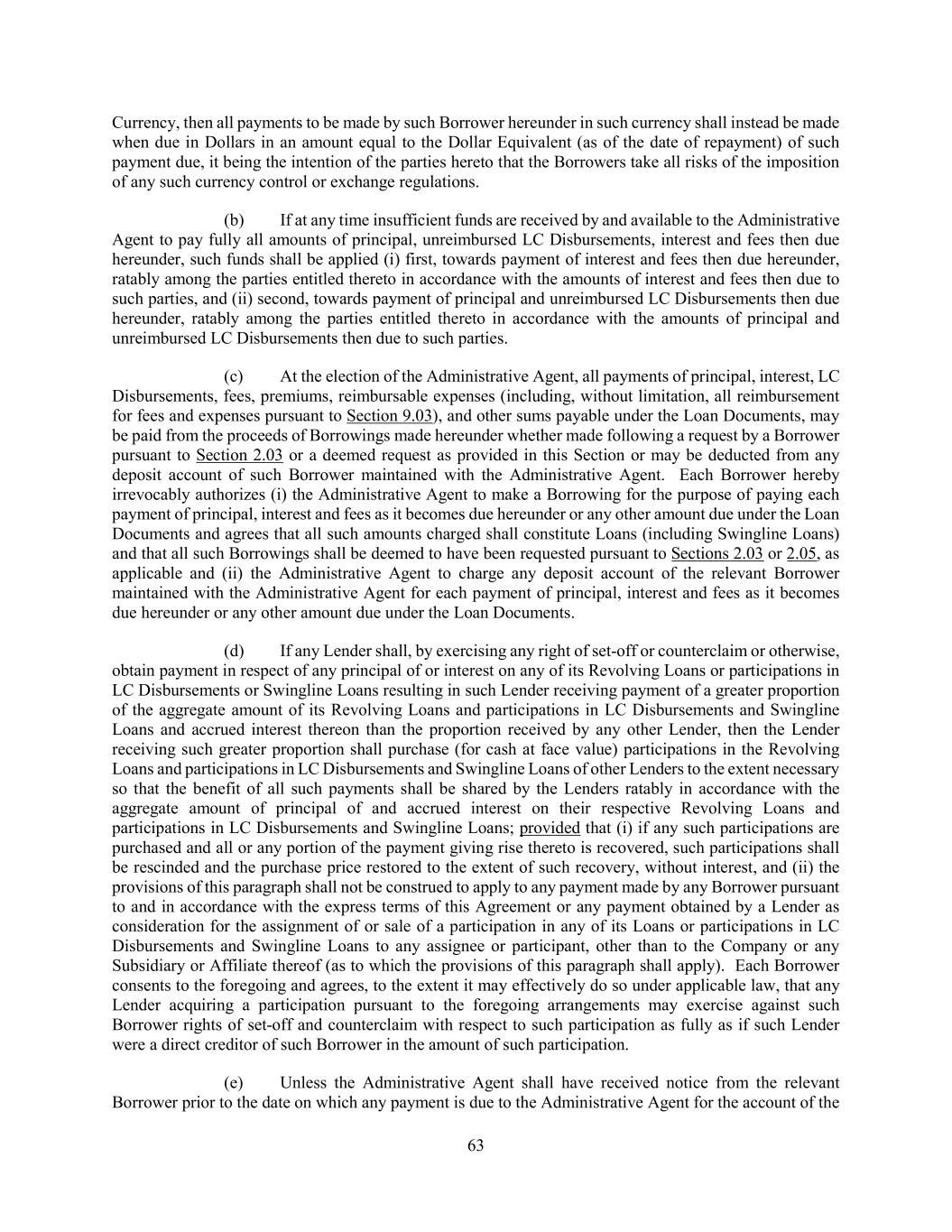 63 Currency, then all payments to be made by such Borrower hereunder in such currency shall instead be made when due in Dollars in an amount equal to the Dollar Equivalent (as of the date of repayment) of such payment due, it being the intention of the parties hereto that the Borrowers take all risks of the imposition of any such currency control or exchange regulations. (b) If at any time insufficient funds are received by and available to the Administrative Agent to pay fully all amounts of principal, unreimbursed LC Disbursements, interest and fees then due hereunder, such funds shall be applied (i) first, towards payment of interest and fees then due hereunder, ratably among the parties entitled thereto in accordance with the amounts of interest and fees then due to such parties, and (ii) second, towards payment of principal and unreimbursed LC Disbursements then due hereunder, ratably among the parties entitled thereto in accordance with the amounts of principal and unreimbursed LC Disbursements then due to such parties. (c) At the election of the Administrative Agent, all payments of principal, interest, LC Disbursements, fees, premiums, reimbursable expenses (including, without limitation, all reimbursement for fees and expenses pursuant to Section 9.03), and other sums payable under the Loan Documents, may be paid from the proceeds of Borrowings made hereunder whether made following a request by a Borrower pursuant to Section 2.03 or a deemed request as provided in this Section or may be deducted from any deposit account of such Borrower maintained with the Administrative Agent. Each Borrower hereby irrevocably authorizes (i) the Administrative Agent to make a Borrowing for the purpose of paying each payment of principal, interest and fees as it becomes due hereunder or any other amount due under the Loan Documents and agrees that all such amounts charged shall constitute Loans (including Swingline Loans) and that all such Borrowings shall be deemed to have been requested pursuant to Sections 2.03 or 2.05, as applicable and (ii) the Administrative Agent to charge any deposit account of the relevant Borrower maintained with the Administrative Agent for each payment of principal, interest and fees as it becomes due hereunder or any other amount due under the Loan Documents. (d) If any Lender shall, by exercising any right of set-off or counterclaim or otherwise, obtain payment in respect of any principal of or interest on any of its Revolving Loans or participations in LC Disbursements or Swingline Loans resulting in such Lender receiving payment of a greater proportion of the aggregate amount of its Revolving Loans and participations in LC Disbursements and Swingline Loans and accrued interest thereon than the proportion received by any other Lender, then the Lender receiving such greater proportion shall purchase (for cash at face value) participations in the Revolving Loans and participations in LC Disbursements and Swingline Loans of other Lenders to the extent necessary so that the benefit of all such payments shall be shared by the Lenders ratably in accordance with the aggregate amount of principal of and accrued interest on their respective Revolving Loans and participations in LC Disbursements and Swingline Loans; provided that (i) if any such participations are purchased and all or any portion of the payment giving rise thereto is recovered, such participations shall be rescinded and the purchase price restored to the extent of such recovery, without interest, and (ii) the provisions of this paragraph shall not be construed to apply to any payment made by any Borrower pursuant to and in accordance with the express terms of this Agreement or any payment obtained by a Lender as consideration for the assignment of or sale of a participation in any of its Loans or participations in LC Disbursements and Swingline Loans to any assignee or participant, other than to the Company or any Subsidiary or Affiliate thereof (as to which the provisions of this paragraph shall apply). Each Borrower consents to the foregoing and agrees, to the extent it may effectively do so under applicable law, that any Lender acquiring a participation pursuant to the foregoing arrangements may exercise against such Borrower rights of set-off and counterclaim with respect to such participation as fully as if such Lender were a direct creditor of such Borrower in the amount of such participation. (e) Unless the Administrative Agent shall have received notice from the relevant Borrower prior to the date on which any payment is due to the Administrative Agent for the account of the