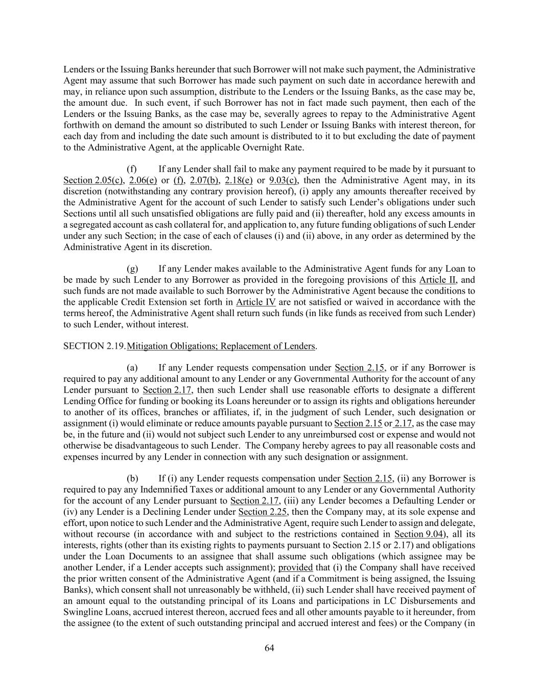 64 Lenders or the Issuing Banks hereunder that such Borrower will not make such payment, the Administrative Agent may assume that such Borrower has made such payment on such date in accordance herewith and may, in reliance upon such assumption, distribute to the Lenders or the Issuing Banks, as the case may be, the amount due. In such event, if such Borrower has not in fact made such payment, then each of the Lenders or the Issuing Banks, as the case may be, severally agrees to repay to the Administrative Agent forthwith on demand the amount so distributed to such Lender or Issuing Banks with interest thereon, for each day from and including the date such amount is distributed to it to but excluding the date of payment to the Administrative Agent, at the applicable Overnight Rate. (f) If any Lender shall fail to make any payment required to be made by it pursuant to Section 2.05(c), 2.06(e) or (f), 2.07(b), 2.18(e) or 9.03(c), then the Administrative Agent may, in its discretion (notwithstanding any contrary provision hereof), (i) apply any amounts thereafter received by the Administrative Agent for the account of such Lender to satisfy such Lender’s obligations under such Sections until all such unsatisfied obligations are fully paid and (ii) thereafter, hold any excess amounts in a segregated account as cash collateral for, and application to, any future funding obligations of such Lender under any such Section; in the case of each of clauses (i) and (ii) above, in any order as determined by the Administrative Agent in its discretion. (g) If any Lender makes available to the Administrative Agent funds for any Loan to be made by such Lender to any Borrower as provided in the foregoing provisions of this Article II, and such funds are not made available to such Borrower by the Administrative Agent because the conditions to the applicable Credit Extension set forth in Article IV are not satisfied or waived in accordance with the terms hereof, the Administrative Agent shall return such funds (in like funds as received from such Lender) to such Lender, without interest. Mitigation Obligations; Replacement of Lenders. (a) If any Lender requests compensation under Section 2.15, or if any Borrower is required to pay any additional amount to any Lender or any Governmental Authority for the account of any Lender pursuant to Section 2.17, then such Lender shall use reasonable efforts to designate a different Lending Office for funding or booking its Loans hereunder or to assign its rights and obligations hereunder to another of its offices, branches or affiliates, if, in the judgment of such Lender, such designation or assignment (i) would eliminate or reduce amounts payable pursuant to Section 2.15 or 2.17, as the case may be, in the future and (ii) would not subject such Lender to any unreimbursed cost or expense and would not otherwise be disadvantageous to such Lender. The Company hereby agrees to pay all reasonable costs and expenses incurred by any Lender in connection with any such designation or assignment. (b) If (i) any Lender requests compensation under Section 2.15, (ii) any Borrower is required to pay any Indemnified Taxes or additional amount to any Lender or any Governmental Authority for the account of any Lender pursuant to Section 2.17, (iii) any Lender becomes a Defaulting Lender or (iv) any Lender is a Declining Lender under Section 2.25, then the Company may, at its sole expense and effort, upon notice to such Lender and the Administrative Agent, require such Lender to assign and delegate, without recourse (in accordance with and subject to the restrictions contained in Section 9.04), all its interests, rights (other than its existing rights to payments pursuant to Section 2.15 or 2.17) and obligations under the Loan Documents to an assignee that shall assume such obligations (which assignee may be another Lender, if a Lender accepts such assignment); provided that (i) the Company shall have received the prior written consent of the Administrative Agent (and if a Commitment is being assigned, the Issuing Banks), which consent shall not unreasonably be withheld, (ii) such Lender shall have received payment of an amount equal to the outstanding principal of its Loans and participations in LC Disbursements and Swingline Loans, accrued interest thereon, accrued fees and all other amounts payable to it hereunder, from the assignee (to the extent of such outstanding principal and accrued interest and fees) or the Company (in