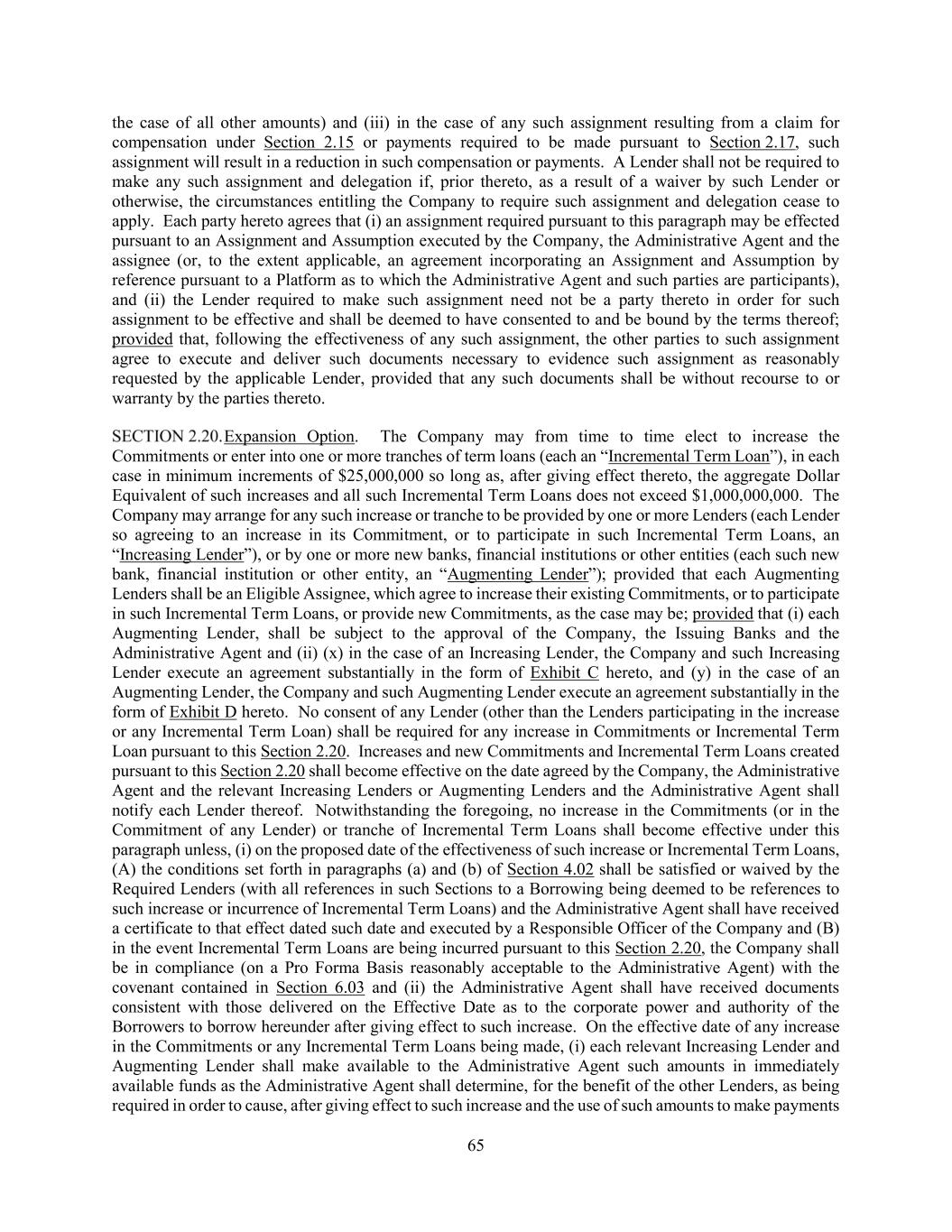 65 the case of all other amounts) and (iii) in the case of any such assignment resulting from a claim for compensation under Section 2.15 or payments required to be made pursuant to Section 2.17, such assignment will result in a reduction in such compensation or payments. A Lender shall not be required to make any such assignment and delegation if, prior thereto, as a result of a waiver by such Lender or otherwise, the circumstances entitling the Company to require such assignment and delegation cease to apply. Each party hereto agrees that (i) an assignment required pursuant to this paragraph may be effected pursuant to an Assignment and Assumption executed by the Company, the Administrative Agent and the assignee (or, to the extent applicable, an agreement incorporating an Assignment and Assumption by reference pursuant to a Platform as to which the Administrative Agent and such parties are participants), and (ii) the Lender required to make such assignment need not be a party thereto in order for such assignment to be effective and shall be deemed to have consented to and be bound by the terms thereof; provided that, following the effectiveness of any such assignment, the other parties to such assignment agree to execute and deliver such documents necessary to evidence such assignment as reasonably requested by the applicable Lender, provided that any such documents shall be without recourse to or warranty by the parties thereto. Expansion Option. The Company may from time to time elect to increase the Commitments or enter into one or more tranches of term loans (each an “Incremental Term Loan”), in each case in minimum increments of $25,000,000 so long as, after giving effect thereto, the aggregate Dollar Equivalent of such increases and all such Incremental Term Loans does not exceed $1,000,000,000. The Company may arrange for any such increase or tranche to be provided by one or more Lenders (each Lender so agreeing to an increase in its Commitment, or to participate in such Incremental Term Loans, an “Increasing Lender”), or by one or more new banks, financial institutions or other entities (each such new bank, financial institution or other entity, an “Augmenting Lender”); provided that each Augmenting Lenders shall be an Eligible Assignee, which agree to increase their existing Commitments, or to participate in such Incremental Term Loans, or provide new Commitments, as the case may be; provided that (i) each Augmenting Lender, shall be subject to the approval of the Company, the Issuing Banks and the Administrative Agent and (ii) (x) in the case of an Increasing Lender, the Company and such Increasing Lender execute an agreement substantially in the form of Exhibit C hereto, and (y) in the case of an Augmenting Lender, the Company and such Augmenting Lender execute an agreement substantially in the form of Exhibit D hereto. No consent of any Lender (other than the Lenders participating in the increase or any Incremental Term Loan) shall be required for any increase in Commitments or Incremental Term Loan pursuant to this Section 2.20. Increases and new Commitments and Incremental Term Loans created pursuant to this Section 2.20 shall become effective on the date agreed by the Company, the Administrative Agent and the relevant Increasing Lenders or Augmenting Lenders and the Administrative Agent shall notify each Lender thereof. Notwithstanding the foregoing, no increase in the Commitments (or in the Commitment of any Lender) or tranche of Incremental Term Loans shall become effective under this paragraph unless, (i) on the proposed date of the effectiveness of such increase or Incremental Term Loans, (A) the conditions set forth in paragraphs (a) and (b) of Section 4.02 shall be satisfied or waived by the Required Lenders (with all references in such Sections to a Borrowing being deemed to be references to such increase or incurrence of Incremental Term Loans) and the Administrative Agent shall have received a certificate to that effect dated such date and executed by a Responsible Officer of the Company and (B) in the event Incremental Term Loans are being incurred pursuant to this Section 2.20, the Company shall be in compliance (on a Pro Forma Basis reasonably acceptable to the Administrative Agent) with the covenant contained in Section 6.03 and (ii) the Administrative Agent shall have received documents consistent with those delivered on the Effective Date as to the corporate power and authority of the Borrowers to borrow hereunder after giving effect to such increase. On the effective date of any increase in the Commitments or any Incremental Term Loans being made, (i) each relevant Increasing Lender and Augmenting Lender shall make available to the Administrative Agent such amounts in immediately available funds as the Administrative Agent shall determine, for the benefit of the other Lenders, as being required in order to cause, after giving effect to such increase and the use of such amounts to make payments