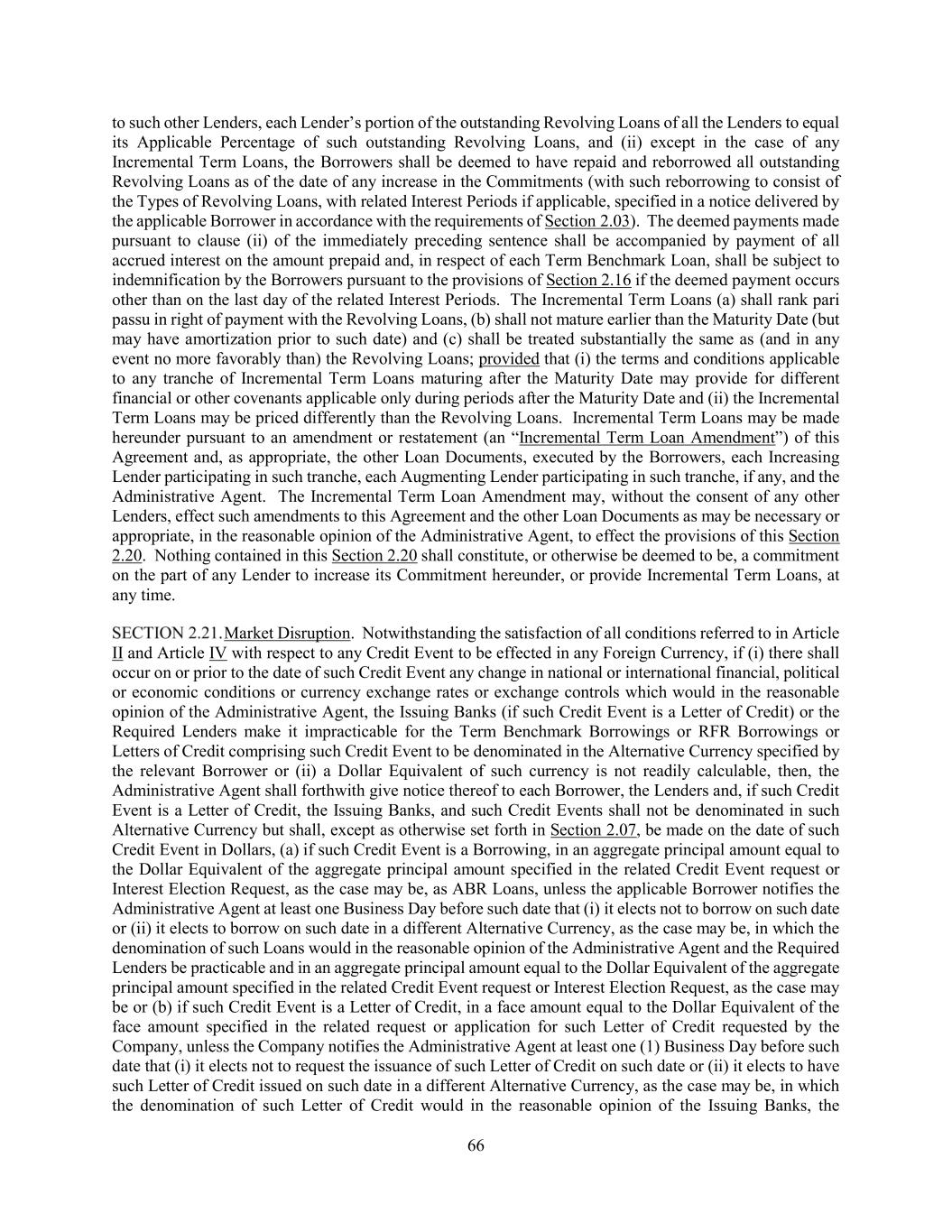 66 to such other Lenders, each Lender’s portion of the outstanding Revolving Loans of all the Lenders to equal its Applicable Percentage of such outstanding Revolving Loans, and (ii) except in the case of any Incremental Term Loans, the Borrowers shall be deemed to have repaid and reborrowed all outstanding Revolving Loans as of the date of any increase in the Commitments (with such reborrowing to consist of the Types of Revolving Loans, with related Interest Periods if applicable, specified in a notice delivered by the applicable Borrower in accordance with the requirements of Section 2.03). The deemed payments made pursuant to clause (ii) of the immediately preceding sentence shall be accompanied by payment of all accrued interest on the amount prepaid and, in respect of each Term Benchmark Loan, shall be subject to indemnification by the Borrowers pursuant to the provisions of Section 2.16 if the deemed payment occurs other than on the last day of the related Interest Periods. The Incremental Term Loans (a) shall rank pari passu in right of payment with the Revolving Loans, (b) shall not mature earlier than the Maturity Date (but may have amortization prior to such date) and (c) shall be treated substantially the same as (and in any event no more favorably than) the Revolving Loans; provided that (i) the terms and conditions applicable to any tranche of Incremental Term Loans maturing after the Maturity Date may provide for different financial or other covenants applicable only during periods after the Maturity Date and (ii) the Incremental Term Loans may be priced differently than the Revolving Loans. Incremental Term Loans may be made hereunder pursuant to an amendment or restatement (an “Incremental Term Loan Amendment”) of this Agreement and, as appropriate, the other Loan Documents, executed by the Borrowers, each Increasing Lender participating in such tranche, each Augmenting Lender participating in such tranche, if any, and the Administrative Agent. The Incremental Term Loan Amendment may, without the consent of any other Lenders, effect such amendments to this Agreement and the other Loan Documents as may be necessary or appropriate, in the reasonable opinion of the Administrative Agent, to effect the provisions of this Section 2.20. Nothing contained in this Section 2.20 shall constitute, or otherwise be deemed to be, a commitment on the part of any Lender to increase its Commitment hereunder, or provide Incremental Term Loans, at any time. Market Disruption. Notwithstanding the satisfaction of all conditions referred to in Article II and Article IV with respect to any Credit Event to be effected in any Foreign Currency, if (i) there shall occur on or prior to the date of such Credit Event any change in national or international financial, political or economic conditions or currency exchange rates or exchange controls which would in the reasonable opinion of the Administrative Agent, the Issuing Banks (if such Credit Event is a Letter of Credit) or the Required Lenders make it impracticable for the Term Benchmark Borrowings or RFR Borrowings or Letters of Credit comprising such Credit Event to be denominated in the Alternative Currency specified by the relevant Borrower or (ii) a Dollar Equivalent of such currency is not readily calculable, then, the Administrative Agent shall forthwith give notice thereof to each Borrower, the Lenders and, if such Credit Event is a Letter of Credit, the Issuing Banks, and such Credit Events shall not be denominated in such Alternative Currency but shall, except as otherwise set forth in Section 2.07, be made on the date of such Credit Event in Dollars, (a) if such Credit Event is a Borrowing, in an aggregate principal amount equal to the Dollar Equivalent of the aggregate principal amount specified in the related Credit Event request or Interest Election Request, as the case may be, as ABR Loans, unless the applicable Borrower notifies the Administrative Agent at least one Business Day before such date that (i) it elects not to borrow on such date or (ii) it elects to borrow on such date in a different Alternative Currency, as the case may be, in which the denomination of such Loans would in the reasonable opinion of the Administrative Agent and the Required Lenders be practicable and in an aggregate principal amount equal to the Dollar Equivalent of the aggregate principal amount specified in the related Credit Event request or Interest Election Request, as the case may be or (b) if such Credit Event is a Letter of Credit, in a face amount equal to the Dollar Equivalent of the face amount specified in the related request or application for such Letter of Credit requested by the Company, unless the Company notifies the Administrative Agent at least one (1) Business Day before such date that (i) it elects not to request the issuance of such Letter of Credit on such date or (ii) it elects to have such Letter of Credit issued on such date in a different Alternative Currency, as the case may be, in which the denomination of such Letter of Credit would in the reasonable opinion of the Issuing Banks, the