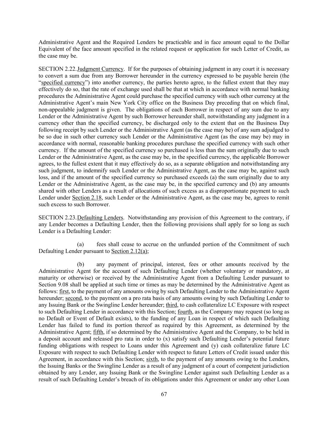 67 Administrative Agent and the Required Lenders be practicable and in face amount equal to the Dollar Equivalent of the face amount specified in the related request or application for such Letter of Credit, as the case may be. Judgment Currency. If for the purposes of obtaining judgment in any court it is necessary to convert a sum due from any Borrower hereunder in the currency expressed to be payable herein (the “specified currency”) into another currency, the parties hereto agree, to the fullest extent that they may effectively do so, that the rate of exchange used shall be that at which in accordance with normal banking procedures the Administrative Agent could purchase the specified currency with such other currency at the Administrative Agent’s main New York City office on the Business Day preceding that on which final, non-appealable judgment is given. The obligations of each Borrower in respect of any sum due to any Lender or the Administrative Agent by such Borrower hereunder shall, notwithstanding any judgment in a currency other than the specified currency, be discharged only to the extent that on the Business Day following receipt by such Lender or the Administrative Agent (as the case may be) of any sum adjudged to be so due in such other currency such Lender or the Administrative Agent (as the case may be) may in accordance with normal, reasonable banking procedures purchase the specified currency with such other currency. If the amount of the specified currency so purchased is less than the sum originally due to such Lender or the Administrative Agent, as the case may be, in the specified currency, the applicable Borrower agrees, to the fullest extent that it may effectively do so, as a separate obligation and notwithstanding any such judgment, to indemnify such Lender or the Administrative Agent, as the case may be, against such loss, and if the amount of the specified currency so purchased exceeds (a) the sum originally due to any Lender or the Administrative Agent, as the case may be, in the specified currency and (b) any amounts shared with other Lenders as a result of allocations of such excess as a disproportionate payment to such Lender under Section 2.18, such Lender or the Administrative Agent, as the case may be, agrees to remit such excess to such Borrower. Defaulting Lenders. Notwithstanding any provision of this Agreement to the contrary, if any Lender becomes a Defaulting Lender, then the following provisions shall apply for so long as such Lender is a Defaulting Lender: (a) fees shall cease to accrue on the unfunded portion of the Commitment of such Defaulting Lender pursuant to Section 2.12(a); (b) any payment of principal, interest, fees or other amounts received by the Administrative Agent for the account of such Defaulting Lender (whether voluntary or mandatory, at maturity or otherwise) or received by the Administrative Agent from a Defaulting Lender pursuant to Section 9.08 shall be applied at such time or times as may be determined by the Administrative Agent as follows: first, to the payment of any amounts owing by such Defaulting Lender to the Administrative Agent hereunder; second, to the payment on a pro rata basis of any amounts owing by such Defaulting Lender to any Issuing Bank or the Swingline Lender hereunder; third, to cash collateralize LC Exposure with respect to such Defaulting Lender in accordance with this Section; fourth, as the Company may request (so long as no Default or Event of Default exists), to the funding of any Loan in respect of which such Defaulting Lender has failed to fund its portion thereof as required by this Agreement, as determined by the Administrative Agent; fifth, if so determined by the Administrative Agent and the Company, to be held in a deposit account and released pro rata in order to (x) satisfy such Defaulting Lender’s potential future funding obligations with respect to Loans under this Agreement and (y) cash collateralize future LC Exposure with respect to such Defaulting Lender with respect to future Letters of Credit issued under this Agreement, in accordance with this Section; sixth, to the payment of any amounts owing to the Lenders, the Issuing Banks or the Swingline Lender as a result of any judgment of a court of competent jurisdiction obtained by any Lender, any Issuing Bank or the Swingline Lender against such Defaulting Lender as a result of such Defaulting Lender’s breach of its obligations under this Agreement or under any other Loan