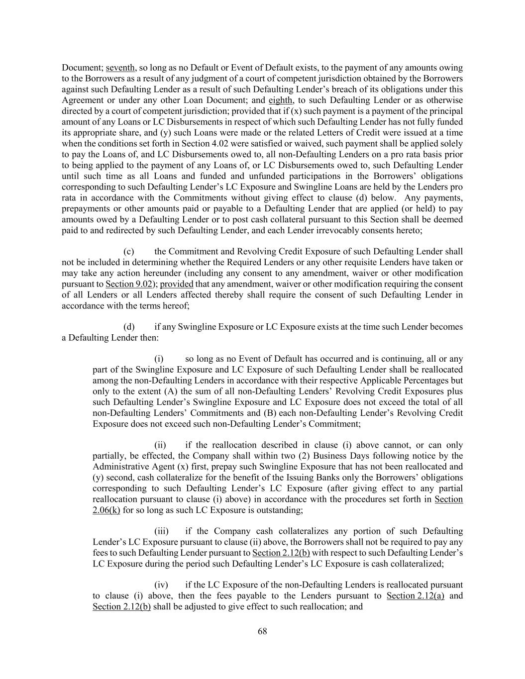 68 Document; seventh, so long as no Default or Event of Default exists, to the payment of any amounts owing to the Borrowers as a result of any judgment of a court of competent jurisdiction obtained by the Borrowers against such Defaulting Lender as a result of such Defaulting Lender’s breach of its obligations under this Agreement or under any other Loan Document; and eighth, to such Defaulting Lender or as otherwise directed by a court of competent jurisdiction; provided that if (x) such payment is a payment of the principal amount of any Loans or LC Disbursements in respect of which such Defaulting Lender has not fully funded its appropriate share, and (y) such Loans were made or the related Letters of Credit were issued at a time when the conditions set forth in Section 4.02 were satisfied or waived, such payment shall be applied solely to pay the Loans of, and LC Disbursements owed to, all non-Defaulting Lenders on a pro rata basis prior to being applied to the payment of any Loans of, or LC Disbursements owed to, such Defaulting Lender until such time as all Loans and funded and unfunded participations in the Borrowers’ obligations corresponding to such Defaulting Lender’s LC Exposure and Swingline Loans are held by the Lenders pro rata in accordance with the Commitments without giving effect to clause (d) below. Any payments, prepayments or other amounts paid or payable to a Defaulting Lender that are applied (or held) to pay amounts owed by a Defaulting Lender or to post cash collateral pursuant to this Section shall be deemed paid to and redirected by such Defaulting Lender, and each Lender irrevocably consents hereto; (c) the Commitment and Revolving Credit Exposure of such Defaulting Lender shall not be included in determining whether the Required Lenders or any other requisite Lenders have taken or may take any action hereunder (including any consent to any amendment, waiver or other modification pursuant to Section 9.02); provided that any amendment, waiver or other modification requiring the consent of all Lenders or all Lenders affected thereby shall require the consent of such Defaulting Lender in accordance with the terms hereof; (d) if any Swingline Exposure or LC Exposure exists at the time such Lender becomes a Defaulting Lender then: (i) so long as no Event of Default has occurred and is continuing, all or any part of the Swingline Exposure and LC Exposure of such Defaulting Lender shall be reallocated among the non-Defaulting Lenders in accordance with their respective Applicable Percentages but only to the extent (A) the sum of all non-Defaulting Lenders’ Revolving Credit Exposures plus such Defaulting Lender’s Swingline Exposure and LC Exposure does not exceed the total of all non-Defaulting Lenders’ Commitments and (B) each non-Defaulting Lender’s Revolving Credit Exposure does not exceed such non-Defaulting Lender’s Commitment; (ii) if the reallocation described in clause (i) above cannot, or can only partially, be effected, the Company shall within two (2) Business Days following notice by the Administrative Agent (x) first, prepay such Swingline Exposure that has not been reallocated and (y) second, cash collateralize for the benefit of the Issuing Banks only the Borrowers’ obligations corresponding to such Defaulting Lender’s LC Exposure (after giving effect to any partial reallocation pursuant to clause (i) above) in accordance with the procedures set forth in Section 2.06(k) for so long as such LC Exposure is outstanding; (iii) if the Company cash collateralizes any portion of such Defaulting Lender’s LC Exposure pursuant to clause (ii) above, the Borrowers shall not be required to pay any fees to such Defaulting Lender pursuant to Section 2.12(b) with respect to such Defaulting Lender’s LC Exposure during the period such Defaulting Lender’s LC Exposure is cash collateralized; (iv) if the LC Exposure of the non-Defaulting Lenders is reallocated pursuant to clause (i) above, then the fees payable to the Lenders pursuant to Section 2.12(a) and Section 2.12(b) shall be adjusted to give effect to such reallocation; and
