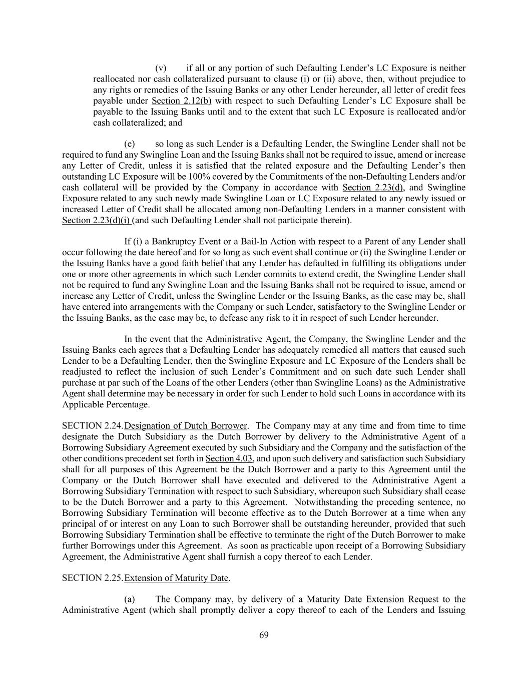 69 (v) if all or any portion of such Defaulting Lender’s LC Exposure is neither reallocated nor cash collateralized pursuant to clause (i) or (ii) above, then, without prejudice to any rights or remedies of the Issuing Banks or any other Lender hereunder, all letter of credit fees payable under Section 2.12(b) with respect to such Defaulting Lender’s LC Exposure shall be payable to the Issuing Banks until and to the extent that such LC Exposure is reallocated and/or cash collateralized; and (e) so long as such Lender is a Defaulting Lender, the Swingline Lender shall not be required to fund any Swingline Loan and the Issuing Banks shall not be required to issue, amend or increase any Letter of Credit, unless it is satisfied that the related exposure and the Defaulting Lender’s then outstanding LC Exposure will be 100% covered by the Commitments of the non-Defaulting Lenders and/or cash collateral will be provided by the Company in accordance with Section 2.23(d), and Swingline Exposure related to any such newly made Swingline Loan or LC Exposure related to any newly issued or increased Letter of Credit shall be allocated among non-Defaulting Lenders in a manner consistent with Section 2.23(d)(i) (and such Defaulting Lender shall not participate therein). If (i) a Bankruptcy Event or a Bail-In Action with respect to a Parent of any Lender shall occur following the date hereof and for so long as such event shall continue or (ii) the Swingline Lender or the Issuing Banks have a good faith belief that any Lender has defaulted in fulfilling its obligations under one or more other agreements in which such Lender commits to extend credit, the Swingline Lender shall not be required to fund any Swingline Loan and the Issuing Banks shall not be required to issue, amend or increase any Letter of Credit, unless the Swingline Lender or the Issuing Banks, as the case may be, shall have entered into arrangements with the Company or such Lender, satisfactory to the Swingline Lender or the Issuing Banks, as the case may be, to defease any risk to it in respect of such Lender hereunder. In the event that the Administrative Agent, the Company, the Swingline Lender and the Issuing Banks each agrees that a Defaulting Lender has adequately remedied all matters that caused such Lender to be a Defaulting Lender, then the Swingline Exposure and LC Exposure of the Lenders shall be readjusted to reflect the inclusion of such Lender’s Commitment and on such date such Lender shall purchase at par such of the Loans of the other Lenders (other than Swingline Loans) as the Administrative Agent shall determine may be necessary in order for such Lender to hold such Loans in accordance with its Applicable Percentage. Designation of Dutch Borrower. The Company may at any time and from time to time designate the Dutch Subsidiary as the Dutch Borrower by delivery to the Administrative Agent of a Borrowing Subsidiary Agreement executed by such Subsidiary and the Company and the satisfaction of the other conditions precedent set forth in Section 4.03, and upon such delivery and satisfaction such Subsidiary shall for all purposes of this Agreement be the Dutch Borrower and a party to this Agreement until the Company or the Dutch Borrower shall have executed and delivered to the Administrative Agent a Borrowing Subsidiary Termination with respect to such Subsidiary, whereupon such Subsidiary shall cease to be the Dutch Borrower and a party to this Agreement. Notwithstanding the preceding sentence, no Borrowing Subsidiary Termination will become effective as to the Dutch Borrower at a time when any principal of or interest on any Loan to such Borrower shall be outstanding hereunder, provided that such Borrowing Subsidiary Termination shall be effective to terminate the right of the Dutch Borrower to make further Borrowings under this Agreement. As soon as practicable upon receipt of a Borrowing Subsidiary Agreement, the Administrative Agent shall furnish a copy thereof to each Lender. Extension of Maturity Date. (a) The Company may, by delivery of a Maturity Date Extension Request to the Administrative Agent (which shall promptly deliver a copy thereof to each of the Lenders and Issuing