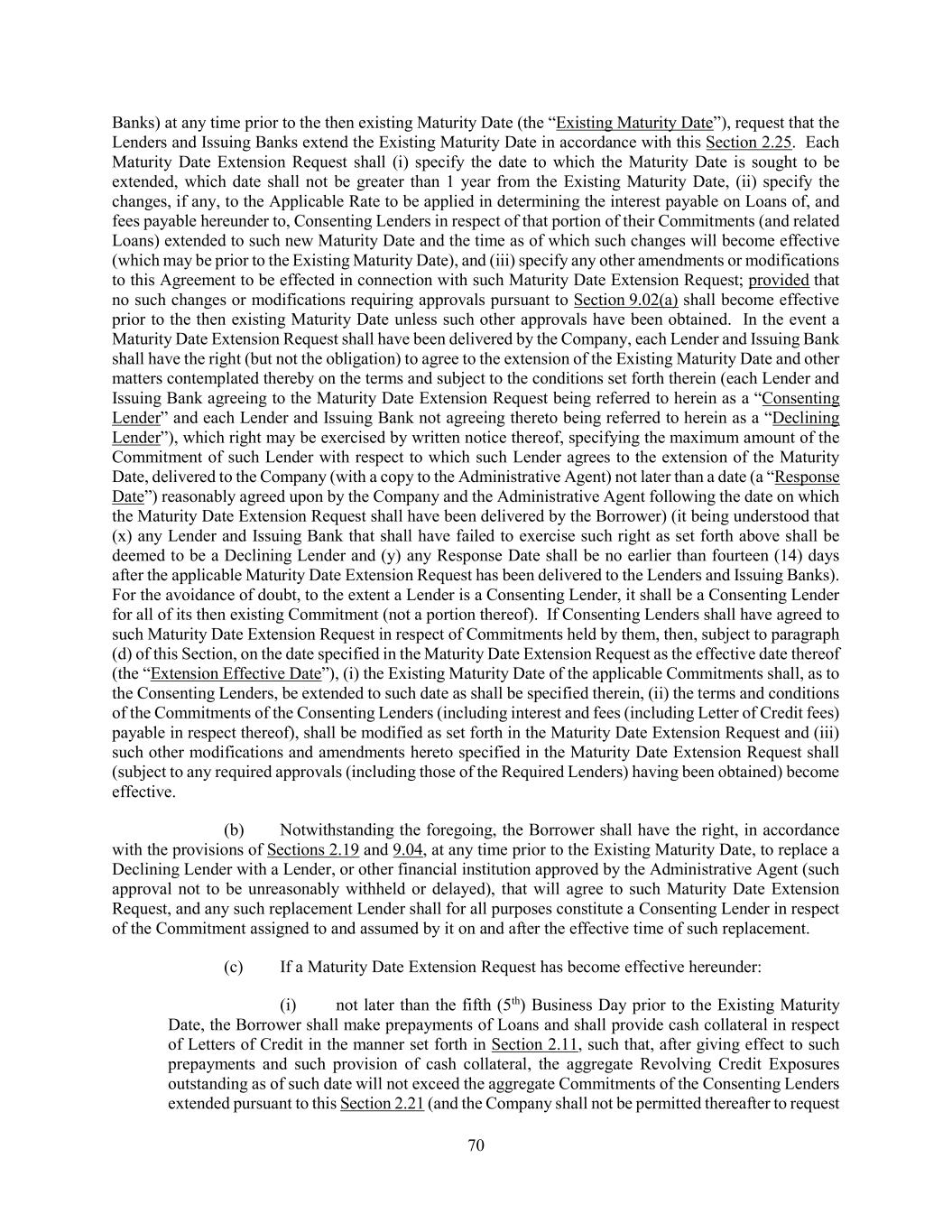 70 Banks) at any time prior to the then existing Maturity Date (the “Existing Maturity Date”), request that the Lenders and Issuing Banks extend the Existing Maturity Date in accordance with this Section 2.25. Each Maturity Date Extension Request shall (i) specify the date to which the Maturity Date is sought to be extended, which date shall not be greater than 1 year from the Existing Maturity Date, (ii) specify the changes, if any, to the Applicable Rate to be applied in determining the interest payable on Loans of, and fees payable hereunder to, Consenting Lenders in respect of that portion of their Commitments (and related Loans) extended to such new Maturity Date and the time as of which such changes will become effective (which may be prior to the Existing Maturity Date), and (iii) specify any other amendments or modifications to this Agreement to be effected in connection with such Maturity Date Extension Request; provided that no such changes or modifications requiring approvals pursuant to Section 9.02(a) shall become effective prior to the then existing Maturity Date unless such other approvals have been obtained. In the event a Maturity Date Extension Request shall have been delivered by the Company, each Lender and Issuing Bank shall have the right (but not the obligation) to agree to the extension of the Existing Maturity Date and other matters contemplated thereby on the terms and subject to the conditions set forth therein (each Lender and Issuing Bank agreeing to the Maturity Date Extension Request being referred to herein as a “Consenting Lender” and each Lender and Issuing Bank not agreeing thereto being referred to herein as a “Declining Lender”), which right may be exercised by written notice thereof, specifying the maximum amount of the Commitment of such Lender with respect to which such Lender agrees to the extension of the Maturity Date, delivered to the Company (with a copy to the Administrative Agent) not later than a date (a “Response Date”) reasonably agreed upon by the Company and the Administrative Agent following the date on which the Maturity Date Extension Request shall have been delivered by the Borrower) (it being understood that (x) any Lender and Issuing Bank that shall have failed to exercise such right as set forth above shall be deemed to be a Declining Lender and (y) any Response Date shall be no earlier than fourteen (14) days after the applicable Maturity Date Extension Request has been delivered to the Lenders and Issuing Banks). For the avoidance of doubt, to the extent a Lender is a Consenting Lender, it shall be a Consenting Lender for all of its then existing Commitment (not a portion thereof). If Consenting Lenders shall have agreed to such Maturity Date Extension Request in respect of Commitments held by them, then, subject to paragraph (d) of this Section, on the date specified in the Maturity Date Extension Request as the effective date thereof (the “Extension Effective Date”), (i) the Existing Maturity Date of the applicable Commitments shall, as to the Consenting Lenders, be extended to such date as shall be specified therein, (ii) the terms and conditions of the Commitments of the Consenting Lenders (including interest and fees (including Letter of Credit fees) payable in respect thereof), shall be modified as set forth in the Maturity Date Extension Request and (iii) such other modifications and amendments hereto specified in the Maturity Date Extension Request shall (subject to any required approvals (including those of the Required Lenders) having been obtained) become effective. (b) Notwithstanding the foregoing, the Borrower shall have the right, in accordance with the provisions of Sections 2.19 and 9.04, at any time prior to the Existing Maturity Date, to replace a Declining Lender with a Lender, or other financial institution approved by the Administrative Agent (such approval not to be unreasonably withheld or delayed), that will agree to such Maturity Date Extension Request, and any such replacement Lender shall for all purposes constitute a Consenting Lender in respect of the Commitment assigned to and assumed by it on and after the effective time of such replacement. (c) If a Maturity Date Extension Request has become effective hereunder: (i) not later than the fifth (5th) Business Day prior to the Existing Maturity Date, the Borrower shall make prepayments of Loans and shall provide cash collateral in respect of Letters of Credit in the manner set forth in Section 2.11, such that, after giving effect to such prepayments and such provision of cash collateral, the aggregate Revolving Credit Exposures outstanding as of such date will not exceed the aggregate Commitments of the Consenting Lenders extended pursuant to this Section 2.21 (and the Company shall not be permitted thereafter to request