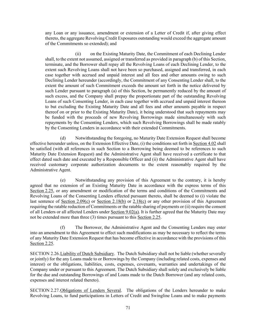 71 any Loan or any issuance, amendment or extension of a Letter of Credit if, after giving effect thereto, the aggregate Revolving Credit Exposures outstanding would exceed the aggregate amount of the Commitments so extended); and (ii) on the Existing Maturity Date, the Commitment of each Declining Lender shall, to the extent not assumed, assigned or transferred as provided in paragraph (b) of this Section, terminate, and the Borrower shall repay all the Revolving Loans of each Declining Lender, to the extent such Revolving Loans shall not have been so purchased, assigned and transferred, in each case together with accrued and unpaid interest and all fees and other amounts owing to such Declining Lender hereunder (accordingly, the Commitment of any Consenting Lender shall, to the extent the amount of such Commitment exceeds the amount set forth in the notice delivered by such Lender pursuant to paragraph (a) of this Section, be permanently reduced by the amount of such excess, and the Company shall prepay the proportionate part of the outstanding Revolving Loans of such Consenting Lender, in each case together with accrued and unpaid interest thereon to but excluding the Existing Maturity Date and all fees and other amounts payable in respect thereof on or prior to the Existing Maturity Date), it being understood that such repayments may be funded with the proceeds of new Revolving Borrowings made simultaneously with such repayments by the Consenting Lenders, which such Revolving Borrowings shall be made ratably by the Consenting Lenders in accordance with their extended Commitments. (d) Notwithstanding the foregoing, no Maturity Date Extension Request shall become effective hereunder unless, on the Extension Effective Date, (i) the conditions set forth in Section 4.02 shall be satisfied (with all references in such Section to a Borrowing being deemed to be references to such Maturity Date Extension Request) and the Administrative Agent shall have received a certificate to that effect dated such date and executed by a Responsible Officer and (ii) the Administrative Agent shall have received customary corporate authorization documents to the extent reasonably required by the Administrative Agent. (e) Notwithstanding any provision of this Agreement to the contrary, it is hereby agreed that no extension of an Existing Maturity Date in accordance with the express terms of this Section 2.25, or any amendment or modification of the terms and conditions of the Commitments and Revolving Loans of the Consenting Lenders effected pursuant thereto, shall be deemed to (i) violate the last sentence of Section 2.09(c) or Section 2.18(b) or 2.18(c) or any other provision of this Agreement requiring the ratable reduction of Commitments or the ratable sharing of payments or (ii) require the consent of all Lenders or all affected Lenders under Section 9.02(a). It is further agreed that the Maturity Date may not be extended more than three (3) times pursuant to this Section 2.25. (f) The Borrower, the Administrative Agent and the Consenting Lenders may enter into an amendment to this Agreement to effect such modifications as may be necessary to reflect the terms of any Maturity Date Extension Request that has become effective in accordance with the provisions of this Section 2.25. Liability of Dutch Subsidiary. The Dutch Subsidiary shall not be liable (whether severally or jointly) for the any Loans made to or Borrowings by the Company (including related costs, expenses and interest) or the obligations, liabilities, costs, expenses, covenants, warranties and undertakings of the Company under or pursuant to this Agreement. The Dutch Subsidiary shall solely and exclusively be liable for the due and outstanding Borrowings of and Loans made to the Dutch Borrower (and any related costs, expenses and interest related thereto). Obligations of Lenders Several. The obligations of the Lenders hereunder to make Revolving Loans, to fund participations in Letters of Credit and Swingline Loans and to make payments