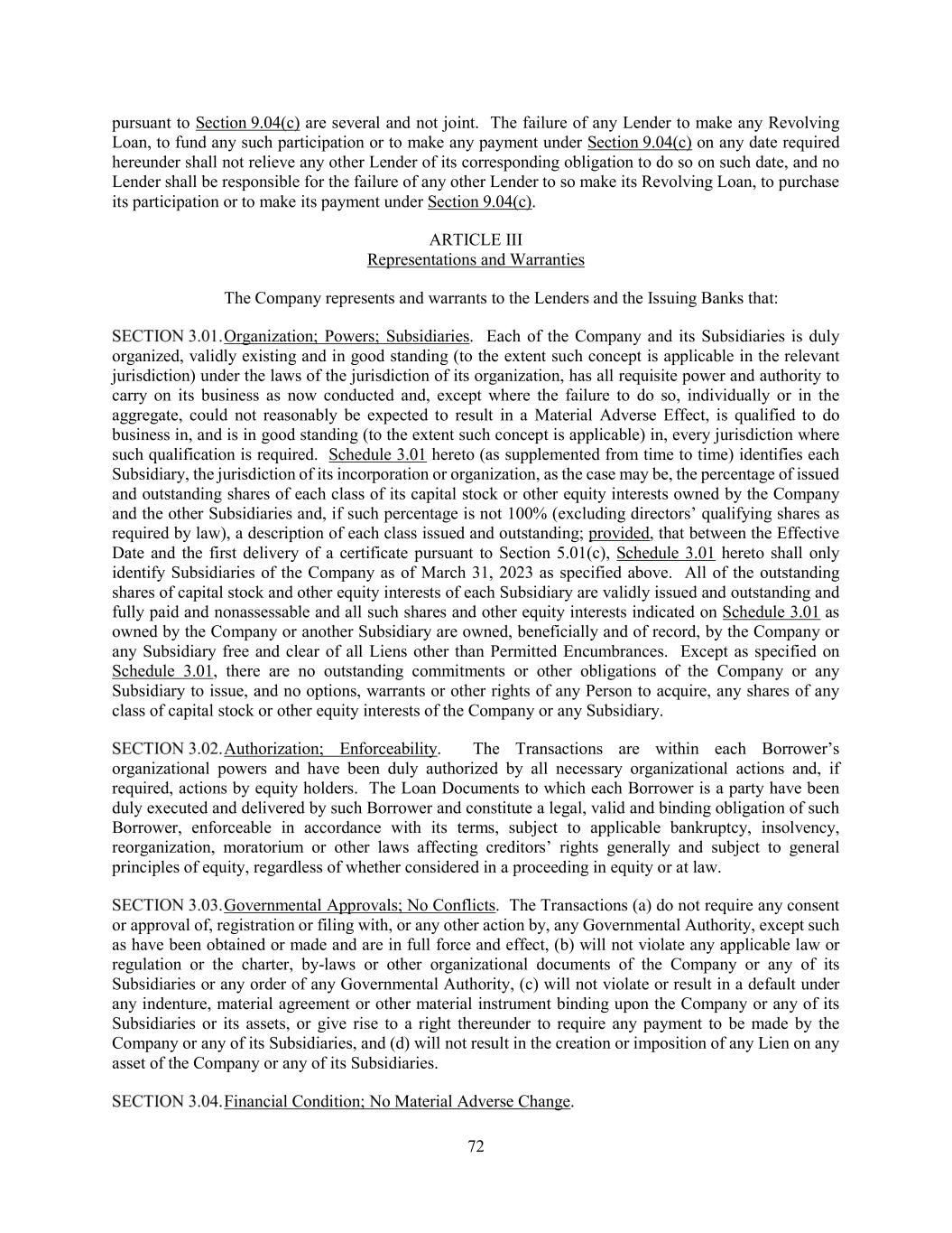 72 pursuant to Section 9.04(c) are several and not joint. The failure of any Lender to make any Revolving Loan, to fund any such participation or to make any payment under Section 9.04(c) on any date required hereunder shall not relieve any other Lender of its corresponding obligation to do so on such date, and no Lender shall be responsible for the failure of any other Lender to so make its Revolving Loan, to purchase its participation or to make its payment under Section 9.04(c). ARTICLE III Representations and Warranties The Company represents and warrants to the Lenders and the Issuing Banks that: Organization; Powers; Subsidiaries. Each of the Company and its Subsidiaries is duly organized, validly existing and in good standing (to the extent such concept is applicable in the relevant jurisdiction) under the laws of the jurisdiction of its organization, has all requisite power and authority to carry on its business as now conducted and, except where the failure to do so, individually or in the aggregate, could not reasonably be expected to result in a Material Adverse Effect, is qualified to do business in, and is in good standing (to the extent such concept is applicable) in, every jurisdiction where such qualification is required. Schedule 3.01 hereto (as supplemented from time to time) identifies each Subsidiary, the jurisdiction of its incorporation or organization, as the case may be, the percentage of issued and outstanding shares of each class of its capital stock or other equity interests owned by the Company and the other Subsidiaries and, if such percentage is not 100% (excluding directors’ qualifying shares as required by law), a description of each class issued and outstanding; provided, that between the Effective Date and the first delivery of a certificate pursuant to Section 5.01(c), Schedule 3.01 hereto shall only identify Subsidiaries of the Company as of March 31, 2023 as specified above. All of the outstanding shares of capital stock and other equity interests of each Subsidiary are validly issued and outstanding and fully paid and nonassessable and all such shares and other equity interests indicated on Schedule 3.01 as owned by the Company or another Subsidiary are owned, beneficially and of record, by the Company or any Subsidiary free and clear of all Liens other than Permitted Encumbrances. Except as specified on Schedule 3.01, there are no outstanding commitments or other obligations of the Company or any Subsidiary to issue, and no options, warrants or other rights of any Person to acquire, any shares of any class of capital stock or other equity interests of the Company or any Subsidiary. Authorization; Enforceability. The Transactions are within each Borrower’s organizational powers and have been duly authorized by all necessary organizational actions and, if required, actions by equity holders. The Loan Documents to which each Borrower is a party have been duly executed and delivered by such Borrower and constitute a legal, valid and binding obligation of such Borrower, enforceable in accordance with its terms, subject to applicable bankruptcy, insolvency, reorganization, moratorium or other laws affecting creditors’ rights generally and subject to general principles of equity, regardless of whether considered in a proceeding in equity or at law. Governmental Approvals; No Conflicts. The Transactions (a) do not require any consent or approval of, registration or filing with, or any other action by, any Governmental Authority, except such as have been obtained or made and are in full force and effect, (b) will not violate any applicable law or regulation or the charter, by-laws or other organizational documents of the Company or any of its Subsidiaries or any order of any Governmental Authority, (c) will not violate or result in a default under any indenture, material agreement or other material instrument binding upon the Company or any of its Subsidiaries or its assets, or give rise to a right thereunder to require any payment to be made by the Company or any of its Subsidiaries, and (d) will not result in the creation or imposition of any Lien on any asset of the Company or any of its Subsidiaries. Financial Condition; No Material Adverse Change.