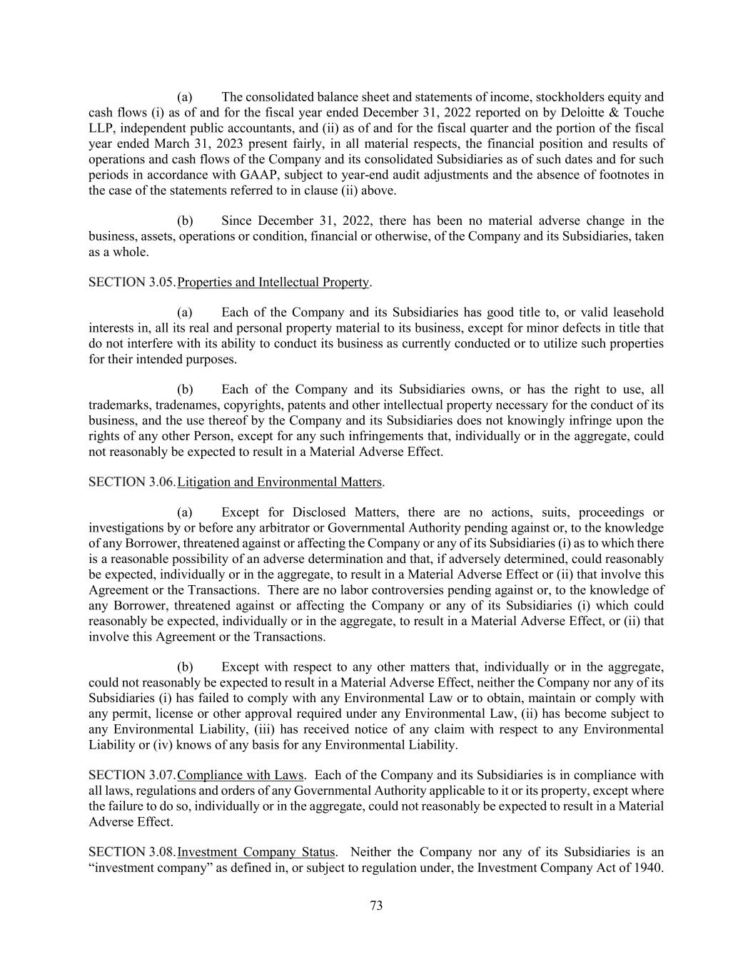 73 (a) The consolidated balance sheet and statements of income, stockholders equity and cash flows (i) as of and for the fiscal year ended December 31, 2022 reported on by Deloitte & Touche LLP, independent public accountants, and (ii) as of and for the fiscal quarter and the portion of the fiscal year ended March 31, 2023 present fairly, in all material respects, the financial position and results of operations and cash flows of the Company and its consolidated Subsidiaries as of such dates and for such periods in accordance with GAAP, subject to year-end audit adjustments and the absence of footnotes in the case of the statements referred to in clause (ii) above. (b) Since December 31, 2022, there has been no material adverse change in the business, assets, operations or condition, financial or otherwise, of the Company and its Subsidiaries, taken as a whole. Properties and Intellectual Property. (a) Each of the Company and its Subsidiaries has good title to, or valid leasehold interests in, all its real and personal property material to its business, except for minor defects in title that do not interfere with its ability to conduct its business as currently conducted or to utilize such properties for their intended purposes. (b) Each of the Company and its Subsidiaries owns, or has the right to use, all trademarks, tradenames, copyrights, patents and other intellectual property necessary for the conduct of its business, and the use thereof by the Company and its Subsidiaries does not knowingly infringe upon the rights of any other Person, except for any such infringements that, individually or in the aggregate, could not reasonably be expected to result in a Material Adverse Effect. Litigation and Environmental Matters. (a) Except for Disclosed Matters, there are no actions, suits, proceedings or investigations by or before any arbitrator or Governmental Authority pending against or, to the knowledge of any Borrower, threatened against or affecting the Company or any of its Subsidiaries (i) as to which there is a reasonable possibility of an adverse determination and that, if adversely determined, could reasonably be expected, individually or in the aggregate, to result in a Material Adverse Effect or (ii) that involve this Agreement or the Transactions. There are no labor controversies pending against or, to the knowledge of any Borrower, threatened against or affecting the Company or any of its Subsidiaries (i) which could reasonably be expected, individually or in the aggregate, to result in a Material Adverse Effect, or (ii) that involve this Agreement or the Transactions. (b) Except with respect to any other matters that, individually or in the aggregate, could not reasonably be expected to result in a Material Adverse Effect, neither the Company nor any of its Subsidiaries (i) has failed to comply with any Environmental Law or to obtain, maintain or comply with any permit, license or other approval required under any Environmental Law, (ii) has become subject to any Environmental Liability, (iii) has received notice of any claim with respect to any Environmental Liability or (iv) knows of any basis for any Environmental Liability. Compliance with Laws. Each of the Company and its Subsidiaries is in compliance with all laws, regulations and orders of any Governmental Authority applicable to it or its property, except where the failure to do so, individually or in the aggregate, could not reasonably be expected to result in a Material Adverse Effect. Investment Company Status. Neither the Company nor any of its Subsidiaries is an “investment company” as defined in, or subject to regulation under, the Investment Company Act of 1940.
