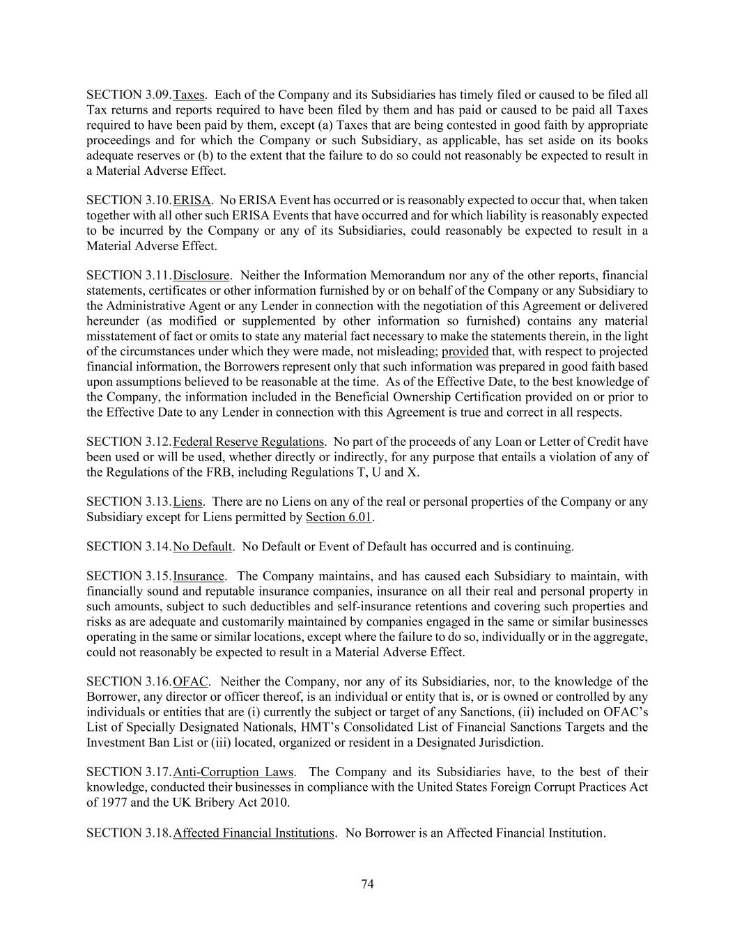 74 Taxes. Each of the Company and its Subsidiaries has timely filed or caused to be filed all Tax returns and reports required to have been filed by them and has paid or caused to be paid all Taxes required to have been paid by them, except (a) Taxes that are being contested in good faith by appropriate proceedings and for which the Company or such Subsidiary, as applicable, has set aside on its books adequate reserves or (b) to the extent that the failure to do so could not reasonably be expected to result in a Material Adverse Effect. ERISA. No ERISA Event has occurred or is reasonably expected to occur that, when taken together with all other such ERISA Events that have occurred and for which liability is reasonably expected to be incurred by the Company or any of its Subsidiaries, could reasonably be expected to result in a Material Adverse Effect. Disclosure. Neither the Information Memorandum nor any of the other reports, financial statements, certificates or other information furnished by or on behalf of the Company or any Subsidiary to the Administrative Agent or any Lender in connection with the negotiation of this Agreement or delivered hereunder (as modified or supplemented by other information so furnished) contains any material misstatement of fact or omits to state any material fact necessary to make the statements therein, in the light of the circumstances under which they were made, not misleading; provided that, with respect to projected financial information, the Borrowers represent only that such information was prepared in good faith based upon assumptions believed to be reasonable at the time. As of the Effective Date, to the best knowledge of the Company, the information included in the Beneficial Ownership Certification provided on or prior to the Effective Date to any Lender in connection with this Agreement is true and correct in all respects. Federal Reserve Regulations. No part of the proceeds of any Loan or Letter of Credit have been used or will be used, whether directly or indirectly, for any purpose that entails a violation of any of the Regulations of the FRB, including Regulations T, U and X. Liens. There are no Liens on any of the real or personal properties of the Company or any Subsidiary except for Liens permitted by Section 6.01. No Default. No Default or Event of Default has occurred and is continuing. Insurance. The Company maintains, and has caused each Subsidiary to maintain, with financially sound and reputable insurance companies, insurance on all their real and personal property in such amounts, subject to such deductibles and self-insurance retentions and covering such properties and risks as are adequate and customarily maintained by companies engaged in the same or similar businesses operating in the same or similar locations, except where the failure to do so, individually or in the aggregate, could not reasonably be expected to result in a Material Adverse Effect. OFAC. Neither the Company, nor any of its Subsidiaries, nor, to the knowledge of the Borrower, any director or officer thereof, is an individual or entity that is, or is owned or controlled by any individuals or entities that are (i) currently the subject or target of any Sanctions, (ii) included on OFAC’s List of Specially Designated Nationals, HMT’s Consolidated List of Financial Sanctions Targets and the Investment Ban List or (iii) located, organized or resident in a Designated Jurisdiction. Anti-Corruption Laws. The Company and its Subsidiaries have, to the best of their knowledge, conducted their businesses in compliance with the United States Foreign Corrupt Practices Act of 1977 and the UK Bribery Act 2010. Affected Financial Institutions. No Borrower is an Affected Financial Institution.