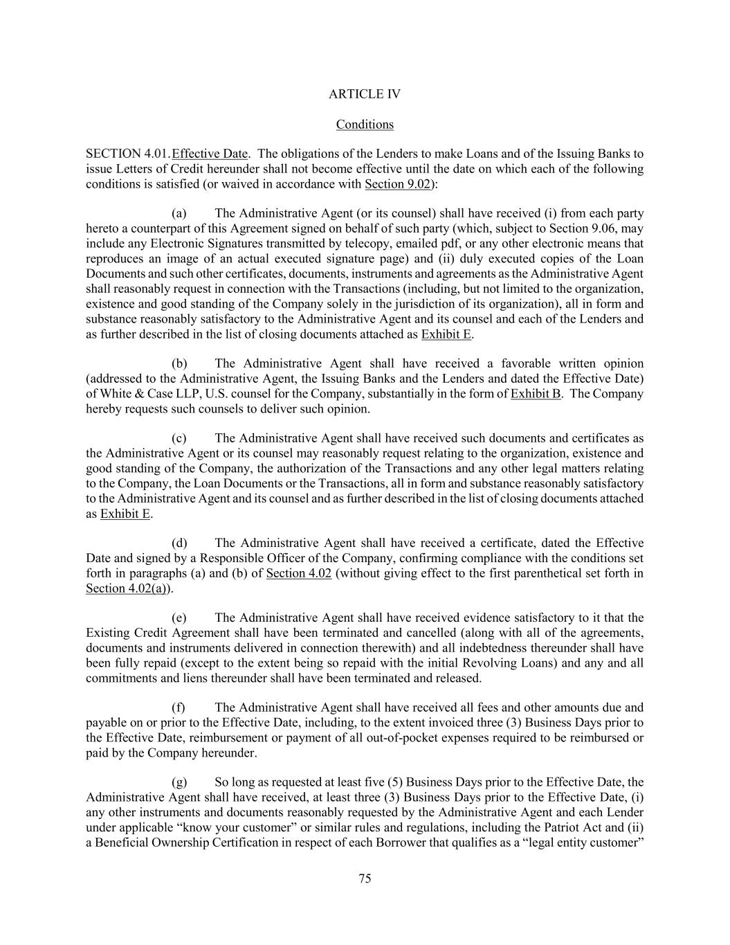 75 ARTICLE IV Conditions Effective Date. The obligations of the Lenders to make Loans and of the Issuing Banks to issue Letters of Credit hereunder shall not become effective until the date on which each of the following conditions is satisfied (or waived in accordance with Section 9.02): (a) The Administrative Agent (or its counsel) shall have received (i) from each party hereto a counterpart of this Agreement signed on behalf of such party (which, subject to Section 9.06, may include any Electronic Signatures transmitted by telecopy, emailed pdf, or any other electronic means that reproduces an image of an actual executed signature page) and (ii) duly executed copies of the Loan Documents and such other certificates, documents, instruments and agreements as the Administrative Agent shall reasonably request in connection with the Transactions (including, but not limited to the organization, existence and good standing of the Company solely in the jurisdiction of its organization), all in form and substance reasonably satisfactory to the Administrative Agent and its counsel and each of the Lenders and as further described in the list of closing documents attached as Exhibit E. (b) The Administrative Agent shall have received a favorable written opinion (addressed to the Administrative Agent, the Issuing Banks and the Lenders and dated the Effective Date) of White & Case LLP, U.S. counsel for the Company, substantially in the form of Exhibit B. The Company hereby requests such counsels to deliver such opinion. (c) The Administrative Agent shall have received such documents and certificates as the Administrative Agent or its counsel may reasonably request relating to the organization, existence and good standing of the Company, the authorization of the Transactions and any other legal matters relating to the Company, the Loan Documents or the Transactions, all in form and substance reasonably satisfactory to the Administrative Agent and its counsel and as further described in the list of closing documents attached as Exhibit E. (d) The Administrative Agent shall have received a certificate, dated the Effective Date and signed by a Responsible Officer of the Company, confirming compliance with the conditions set forth in paragraphs (a) and (b) of Section 4.02 (without giving effect to the first parenthetical set forth in Section 4.02(a)). (e) The Administrative Agent shall have received evidence satisfactory to it that the Existing Credit Agreement shall have been terminated and cancelled (along with all of the agreements, documents and instruments delivered in connection therewith) and all indebtedness thereunder shall have been fully repaid (except to the extent being so repaid with the initial Revolving Loans) and any and all commitments and liens thereunder shall have been terminated and released. (f) The Administrative Agent shall have received all fees and other amounts due and payable on or prior to the Effective Date, including, to the extent invoiced three (3) Business Days prior to the Effective Date, reimbursement or payment of all out-of-pocket expenses required to be reimbursed or paid by the Company hereunder. (g) So long as requested at least five (5) Business Days prior to the Effective Date, the Administrative Agent shall have received, at least three (3) Business Days prior to the Effective Date, (i) any other instruments and documents reasonably requested by the Administrative Agent and each Lender under applicable “know your customer” or similar rules and regulations, including the Patriot Act and (ii) a Beneficial Ownership Certification in respect of each Borrower that qualifies as a “legal entity customer”