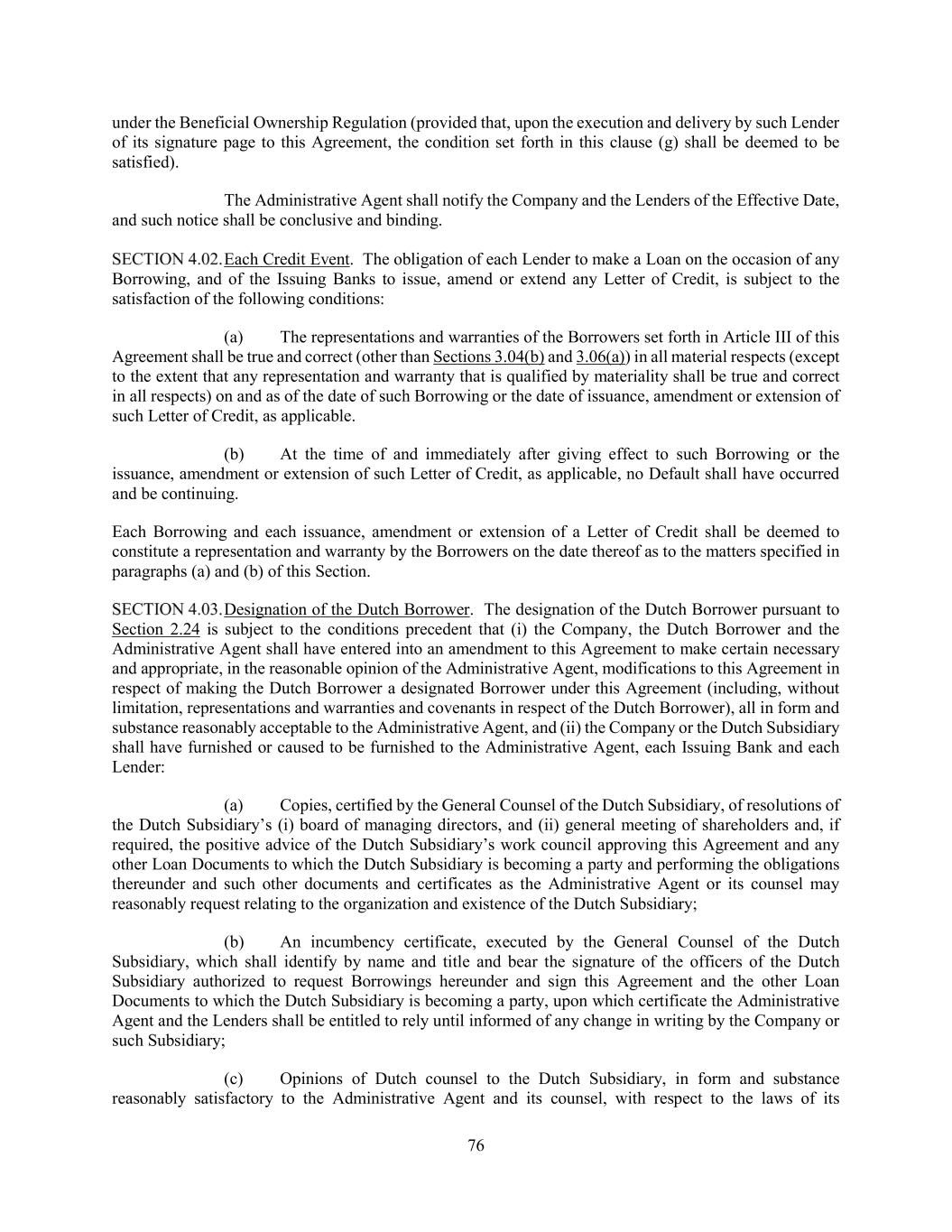 76 under the Beneficial Ownership Regulation (provided that, upon the execution and delivery by such Lender of its signature page to this Agreement, the condition set forth in this clause (g) shall be deemed to be satisfied). The Administrative Agent shall notify the Company and the Lenders of the Effective Date, and such notice shall be conclusive and binding. Each Credit Event. The obligation of each Lender to make a Loan on the occasion of any Borrowing, and of the Issuing Banks to issue, amend or extend any Letter of Credit, is subject to the satisfaction of the following conditions: (a) The representations and warranties of the Borrowers set forth in Article III of this Agreement shall be true and correct (other than Sections 3.04(b) and 3.06(a)) in all material respects (except to the extent that any representation and warranty that is qualified by materiality shall be true and correct in all respects) on and as of the date of such Borrowing or the date of issuance, amendment or extension of such Letter of Credit, as applicable. (b) At the time of and immediately after giving effect to such Borrowing or the issuance, amendment or extension of such Letter of Credit, as applicable, no Default shall have occurred and be continuing. Each Borrowing and each issuance, amendment or extension of a Letter of Credit shall be deemed to constitute a representation and warranty by the Borrowers on the date thereof as to the matters specified in paragraphs (a) and (b) of this Section. Designation of the Dutch Borrower. The designation of the Dutch Borrower pursuant to Section 2.24 is subject to the conditions precedent that (i) the Company, the Dutch Borrower and the Administrative Agent shall have entered into an amendment to this Agreement to make certain necessary and appropriate, in the reasonable opinion of the Administrative Agent, modifications to this Agreement in respect of making the Dutch Borrower a designated Borrower under this Agreement (including, without limitation, representations and warranties and covenants in respect of the Dutch Borrower), all in form and substance reasonably acceptable to the Administrative Agent, and (ii) the Company or the Dutch Subsidiary shall have furnished or caused to be furnished to the Administrative Agent, each Issuing Bank and each Lender: (a) Copies, certified by the General Counsel of the Dutch Subsidiary, of resolutions of the Dutch Subsidiary’s (i) board of managing directors, and (ii) general meeting of shareholders and, if required, the positive advice of the Dutch Subsidiary’s work council approving this Agreement and any other Loan Documents to which the Dutch Subsidiary is becoming a party and performing the obligations thereunder and such other documents and certificates as the Administrative Agent or its counsel may reasonably request relating to the organization and existence of the Dutch Subsidiary; (b) An incumbency certificate, executed by the General Counsel of the Dutch Subsidiary, which shall identify by name and title and bear the signature of the officers of the Dutch Subsidiary authorized to request Borrowings hereunder and sign this Agreement and the other Loan Documents to which the Dutch Subsidiary is becoming a party, upon which certificate the Administrative Agent and the Lenders shall be entitled to rely until informed of any change in writing by the Company or such Subsidiary; (c) Opinions of Dutch counsel to the Dutch Subsidiary, in form and substance reasonably satisfactory to the Administrative Agent and its counsel, with respect to the laws of its