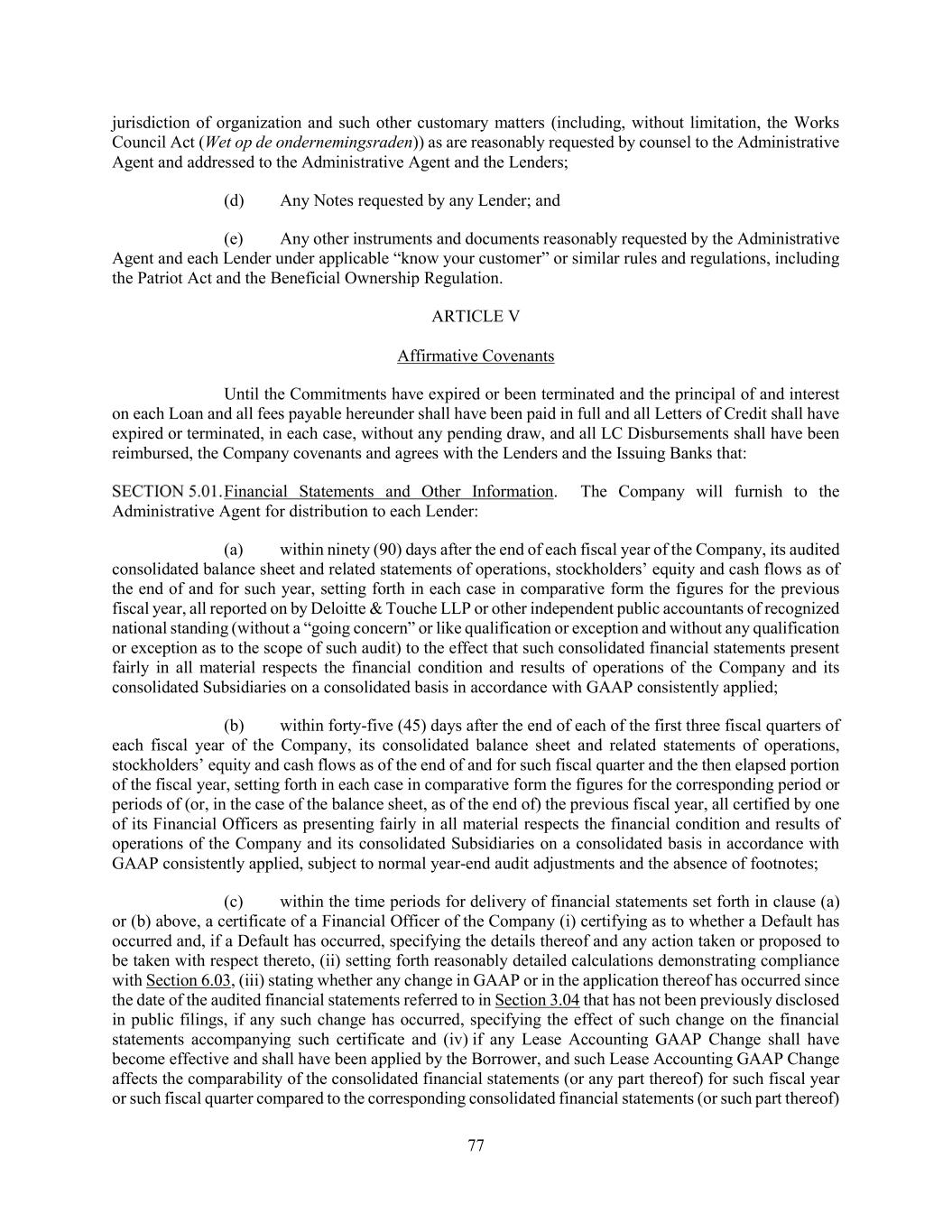 77 jurisdiction of organization and such other customary matters (including, without limitation, the Works Council Act (Wet op de ondernemingsraden)) as are reasonably requested by counsel to the Administrative Agent and addressed to the Administrative Agent and the Lenders; (d) Any Notes requested by any Lender; and (e) Any other instruments and documents reasonably requested by the Administrative Agent and each Lender under applicable “know your customer” or similar rules and regulations, including the Patriot Act and the Beneficial Ownership Regulation. ARTICLE V Affirmative Covenants Until the Commitments have expired or been terminated and the principal of and interest on each Loan and all fees payable hereunder shall have been paid in full and all Letters of Credit shall have expired or terminated, in each case, without any pending draw, and all LC Disbursements shall have been reimbursed, the Company covenants and agrees with the Lenders and the Issuing Banks that: Financial Statements and Other Information. The Company will furnish to the Administrative Agent for distribution to each Lender: (a) within ninety (90) days after the end of each fiscal year of the Company, its audited consolidated balance sheet and related statements of operations, stockholders’ equity and cash flows as of the end of and for such year, setting forth in each case in comparative form the figures for the previous fiscal year, all reported on by Deloitte & Touche LLP or other independent public accountants of recognized national standing (without a “going concern” or like qualification or exception and without any qualification or exception as to the scope of such audit) to the effect that such consolidated financial statements present fairly in all material respects the financial condition and results of operations of the Company and its consolidated Subsidiaries on a consolidated basis in accordance with GAAP consistently applied; (b) within forty-five (45) days after the end of each of the first three fiscal quarters of each fiscal year of the Company, its consolidated balance sheet and related statements of operations, stockholders’ equity and cash flows as of the end of and for such fiscal quarter and the then elapsed portion of the fiscal year, setting forth in each case in comparative form the figures for the corresponding period or periods of (or, in the case of the balance sheet, as of the end of) the previous fiscal year, all certified by one of its Financial Officers as presenting fairly in all material respects the financial condition and results of operations of the Company and its consolidated Subsidiaries on a consolidated basis in accordance with GAAP consistently applied, subject to normal year-end audit adjustments and the absence of footnotes; (c) within the time periods for delivery of financial statements set forth in clause (a) or (b) above, a certificate of a Financial Officer of the Company (i) certifying as to whether a Default has occurred and, if a Default has occurred, specifying the details thereof and any action taken or proposed to be taken with respect thereto, (ii) setting forth reasonably detailed calculations demonstrating compliance with Section 6.03, (iii) stating whether any change in GAAP or in the application thereof has occurred since the date of the audited financial statements referred to in Section 3.04 that has not been previously disclosed in public filings, if any such change has occurred, specifying the effect of such change on the financial statements accompanying such certificate and (iv) if any Lease Accounting GAAP Change shall have become effective and shall have been applied by the Borrower, and such Lease Accounting GAAP Change affects the comparability of the consolidated financial statements (or any part thereof) for such fiscal year or such fiscal quarter compared to the corresponding consolidated financial statements (or such part thereof)