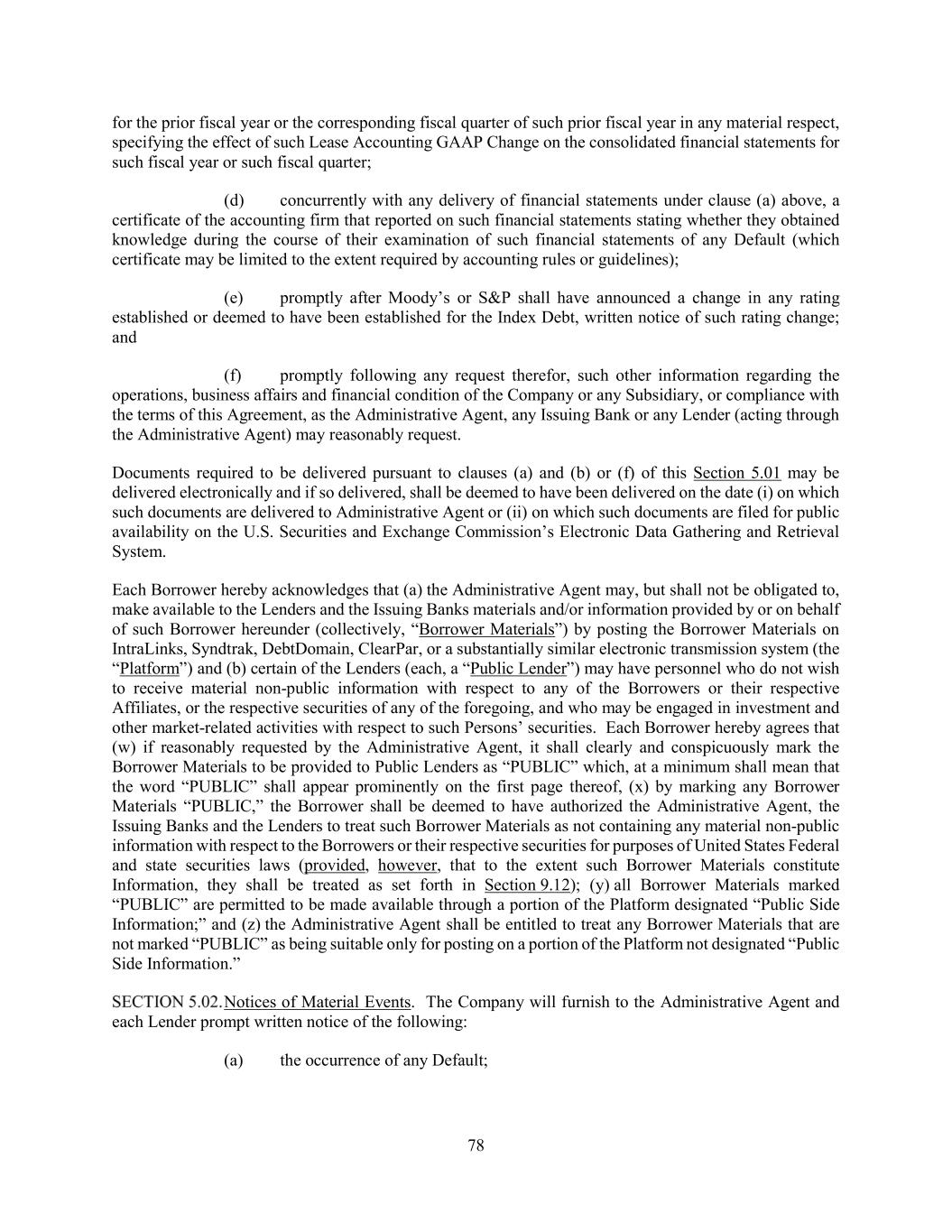 78 for the prior fiscal year or the corresponding fiscal quarter of such prior fiscal year in any material respect, specifying the effect of such Lease Accounting GAAP Change on the consolidated financial statements for such fiscal year or such fiscal quarter; (d) concurrently with any delivery of financial statements under clause (a) above, a certificate of the accounting firm that reported on such financial statements stating whether they obtained knowledge during the course of their examination of such financial statements of any Default (which certificate may be limited to the extent required by accounting rules or guidelines); (e) promptly after Moody’s or S&P shall have announced a change in any rating established or deemed to have been established for the Index Debt, written notice of such rating change; and (f) promptly following any request therefor, such other information regarding the operations, business affairs and financial condition of the Company or any Subsidiary, or compliance with the terms of this Agreement, as the Administrative Agent, any Issuing Bank or any Lender (acting through the Administrative Agent) may reasonably request. Documents required to be delivered pursuant to clauses (a) and (b) or (f) of this Section 5.01 may be delivered electronically and if so delivered, shall be deemed to have been delivered on the date (i) on which such documents are delivered to Administrative Agent or (ii) on which such documents are filed for public availability on the U.S. Securities and Exchange Commission’s Electronic Data Gathering and Retrieval System. Each Borrower hereby acknowledges that (a) the Administrative Agent may, but shall not be obligated to, make available to the Lenders and the Issuing Banks materials and/or information provided by or on behalf of such Borrower hereunder (collectively, “Borrower Materials”) by posting the Borrower Materials on IntraLinks, Syndtrak, DebtDomain, ClearPar, or a substantially similar electronic transmission system (the “Platform”) and (b) certain of the Lenders (each, a “Public Lender”) may have personnel who do not wish to receive material non-public information with respect to any of the Borrowers or their respective Affiliates, or the respective securities of any of the foregoing, and who may be engaged in investment and other market-related activities with respect to such Persons’ securities. Each Borrower hereby agrees that (w) if reasonably requested by the Administrative Agent, it shall clearly and conspicuously mark the Borrower Materials to be provided to Public Lenders as “PUBLIC” which, at a minimum shall mean that the word “PUBLIC” shall appear prominently on the first page thereof, (x) by marking any Borrower Materials “PUBLIC,” the Borrower shall be deemed to have authorized the Administrative Agent, the Issuing Banks and the Lenders to treat such Borrower Materials as not containing any material non-public information with respect to the Borrowers or their respective securities for purposes of United States Federal and state securities laws (provided, however, that to the extent such Borrower Materials constitute Information, they shall be treated as set forth in Section 9.12); (y) all Borrower Materials marked “PUBLIC” are permitted to be made available through a portion of the Platform designated “Public Side Information;” and (z) the Administrative Agent shall be entitled to treat any Borrower Materials that are not marked “PUBLIC” as being suitable only for posting on a portion of the Platform not designated “Public Side Information.” Notices of Material Events. The Company will furnish to the Administrative Agent and each Lender prompt written notice of the following: (a) the occurrence of any Default;