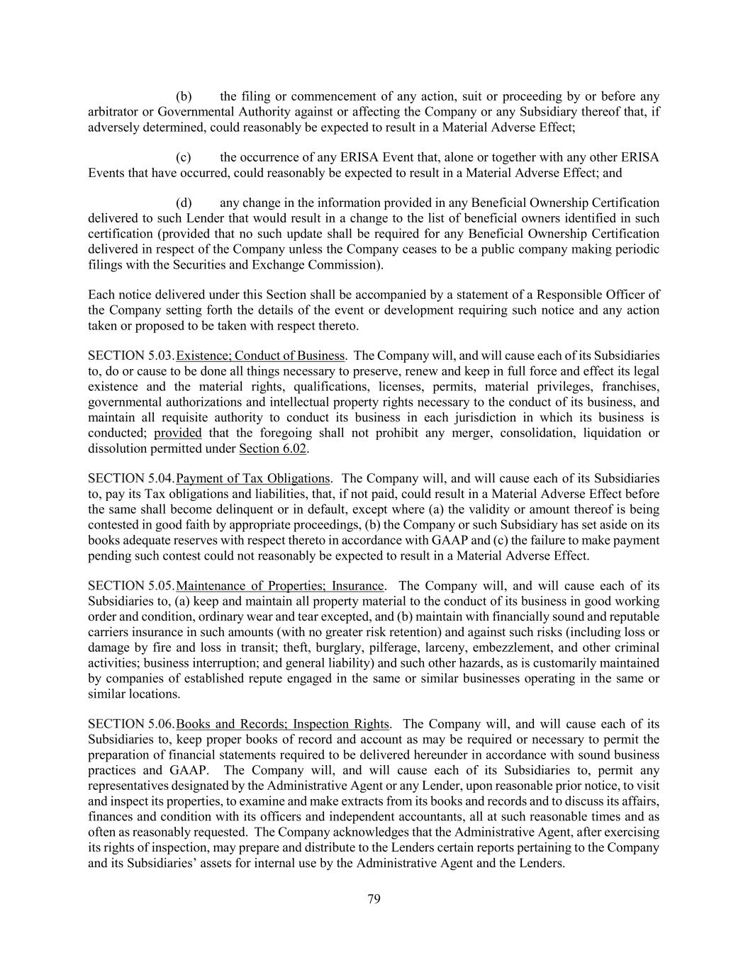 79 (b) the filing or commencement of any action, suit or proceeding by or before any arbitrator or Governmental Authority against or affecting the Company or any Subsidiary thereof that, if adversely determined, could reasonably be expected to result in a Material Adverse Effect; (c) the occurrence of any ERISA Event that, alone or together with any other ERISA Events that have occurred, could reasonably be expected to result in a Material Adverse Effect; and (d) any change in the information provided in any Beneficial Ownership Certification delivered to such Lender that would result in a change to the list of beneficial owners identified in such certification (provided that no such update shall be required for any Beneficial Ownership Certification delivered in respect of the Company unless the Company ceases to be a public company making periodic filings with the Securities and Exchange Commission). Each notice delivered under this Section shall be accompanied by a statement of a Responsible Officer of the Company setting forth the details of the event or development requiring such notice and any action taken or proposed to be taken with respect thereto. Existence; Conduct of Business. The Company will, and will cause each of its Subsidiaries to, do or cause to be done all things necessary to preserve, renew and keep in full force and effect its legal existence and the material rights, qualifications, licenses, permits, material privileges, franchises, governmental authorizations and intellectual property rights necessary to the conduct of its business, and maintain all requisite authority to conduct its business in each jurisdiction in which its business is conducted; provided that the foregoing shall not prohibit any merger, consolidation, liquidation or dissolution permitted under Section 6.02. Payment of Tax Obligations. The Company will, and will cause each of its Subsidiaries to, pay its Tax obligations and liabilities, that, if not paid, could result in a Material Adverse Effect before the same shall become delinquent or in default, except where (a) the validity or amount thereof is being contested in good faith by appropriate proceedings, (b) the Company or such Subsidiary has set aside on its books adequate reserves with respect thereto in accordance with GAAP and (c) the failure to make payment pending such contest could not reasonably be expected to result in a Material Adverse Effect. Maintenance of Properties; Insurance. The Company will, and will cause each of its Subsidiaries to, (a) keep and maintain all property material to the conduct of its business in good working order and condition, ordinary wear and tear excepted, and (b) maintain with financially sound and reputable carriers insurance in such amounts (with no greater risk retention) and against such risks (including loss or damage by fire and loss in transit; theft, burglary, pilferage, larceny, embezzlement, and other criminal activities; business interruption; and general liability) and such other hazards, as is customarily maintained by companies of established repute engaged in the same or similar businesses operating in the same or similar locations. Books and Records; Inspection Rights. The Company will, and will cause each of its Subsidiaries to, keep proper books of record and account as may be required or necessary to permit the preparation of financial statements required to be delivered hereunder in accordance with sound business practices and GAAP. The Company will, and will cause each of its Subsidiaries to, permit any representatives designated by the Administrative Agent or any Lender, upon reasonable prior notice, to visit and inspect its properties, to examine and make extracts from its books and records and to discuss its affairs, finances and condition with its officers and independent accountants, all at such reasonable times and as often as reasonably requested. The Company acknowledges that the Administrative Agent, after exercising its rights of inspection, may prepare and distribute to the Lenders certain reports pertaining to the Company and its Subsidiaries’ assets for internal use by the Administrative Agent and the Lenders.
