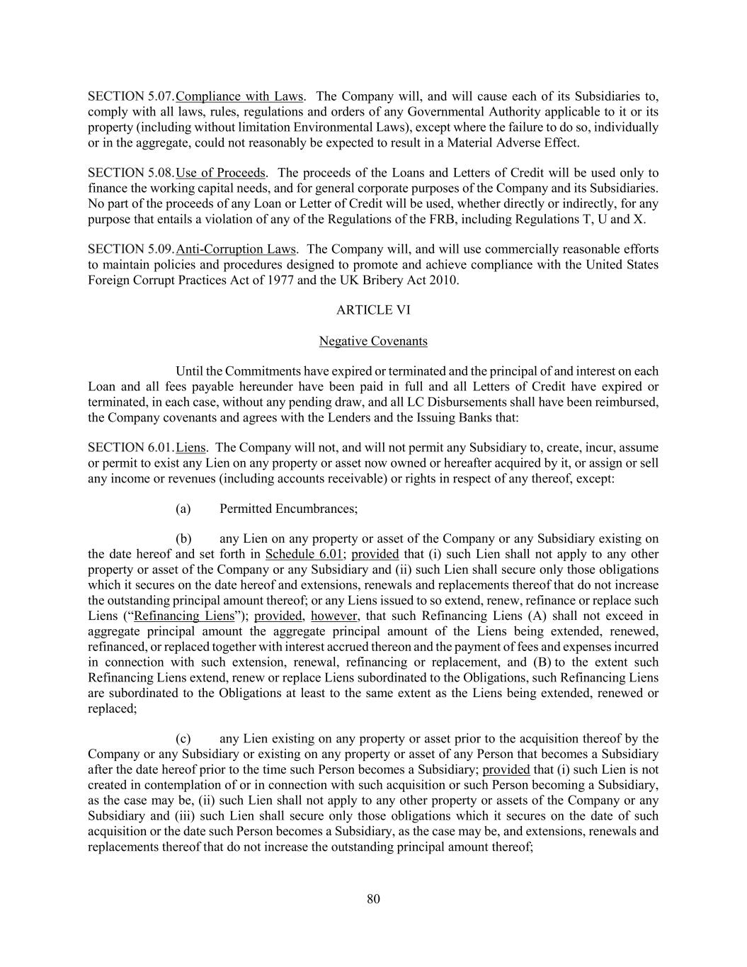 80 Compliance with Laws. The Company will, and will cause each of its Subsidiaries to, comply with all laws, rules, regulations and orders of any Governmental Authority applicable to it or its property (including without limitation Environmental Laws), except where the failure to do so, individually or in the aggregate, could not reasonably be expected to result in a Material Adverse Effect. Use of Proceeds. The proceeds of the Loans and Letters of Credit will be used only to finance the working capital needs, and for general corporate purposes of the Company and its Subsidiaries. No part of the proceeds of any Loan or Letter of Credit will be used, whether directly or indirectly, for any purpose that entails a violation of any of the Regulations of the FRB, including Regulations T, U and X. Anti-Corruption Laws. The Company will, and will use commercially reasonable efforts to maintain policies and procedures designed to promote and achieve compliance with the United States Foreign Corrupt Practices Act of 1977 and the UK Bribery Act 2010. ARTICLE VI Negative Covenants Until the Commitments have expired or terminated and the principal of and interest on each Loan and all fees payable hereunder have been paid in full and all Letters of Credit have expired or terminated, in each case, without any pending draw, and all LC Disbursements shall have been reimbursed, the Company covenants and agrees with the Lenders and the Issuing Banks that: Liens. The Company will not, and will not permit any Subsidiary to, create, incur, assume or permit to exist any Lien on any property or asset now owned or hereafter acquired by it, or assign or sell any income or revenues (including accounts receivable) or rights in respect of any thereof, except: (a) Permitted Encumbrances; (b) any Lien on any property or asset of the Company or any Subsidiary existing on the date hereof and set forth in Schedule 6.01; provided that (i) such Lien shall not apply to any other property or asset of the Company or any Subsidiary and (ii) such Lien shall secure only those obligations which it secures on the date hereof and extensions, renewals and replacements thereof that do not increase the outstanding principal amount thereof; or any Liens issued to so extend, renew, refinance or replace such Liens (“Refinancing Liens”); provided, however, that such Refinancing Liens (A) shall not exceed in aggregate principal amount the aggregate principal amount of the Liens being extended, renewed, refinanced, or replaced together with interest accrued thereon and the payment of fees and expenses incurred in connection with such extension, renewal, refinancing or replacement, and (B) to the extent such Refinancing Liens extend, renew or replace Liens subordinated to the Obligations, such Refinancing Liens are subordinated to the Obligations at least to the same extent as the Liens being extended, renewed or replaced; (c) any Lien existing on any property or asset prior to the acquisition thereof by the Company or any Subsidiary or existing on any property or asset of any Person that becomes a Subsidiary after the date hereof prior to the time such Person becomes a Subsidiary; provided that (i) such Lien is not created in contemplation of or in connection with such acquisition or such Person becoming a Subsidiary, as the case may be, (ii) such Lien shall not apply to any other property or assets of the Company or any Subsidiary and (iii) such Lien shall secure only those obligations which it secures on the date of such acquisition or the date such Person becomes a Subsidiary, as the case may be, and extensions, renewals and replacements thereof that do not increase the outstanding principal amount thereof;