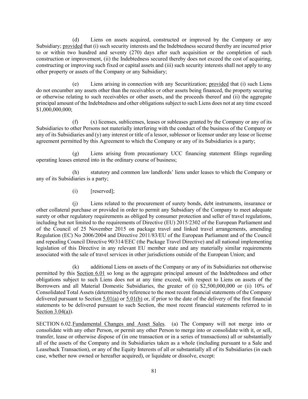 81 (d) Liens on assets acquired, constructed or improved by the Company or any Subsidiary; provided that (i) such security interests and the Indebtedness secured thereby are incurred prior to or within two hundred and seventy (270) days after such acquisition or the completion of such construction or improvement, (ii) the Indebtedness secured thereby does not exceed the cost of acquiring, constructing or improving such fixed or capital assets and (iii) such security interests shall not apply to any other property or assets of the Company or any Subsidiary; (e) Liens arising in connection with any Securitization; provided that (i) such Liens do not encumber any assets other than the receivables or other assets being financed, the property securing or otherwise relating to such receivables or other assets, and the proceeds thereof and (ii) the aggregate principal amount of the Indebtedness and other obligations subject to such Liens does not at any time exceed $1,000,000,000; (f) (x) licenses, sublicenses, leases or subleases granted by the Company or any of its Subsidiaries to other Persons not materially interfering with the conduct of the business of the Company or any of its Subsidiaries and (y) any interest or title of a lessor, sublessor or licensor under any lease or license agreement permitted by this Agreement to which the Company or any of its Subsidiaries is a party; (g) Liens arising from precautionary UCC financing statement filings regarding operating leases entered into in the ordinary course of business; (h) statutory and common law landlords’ liens under leases to which the Company or any of its Subsidiaries is a party; (i) [reserved]; (j) Liens related to the procurement of surety bonds, debt instruments, insurance or other collateral purchase or provided in order to permit any Subsidiary of the Company to meet adequate surety or other regulatory requirements as obliged by consumer protection and seller of travel regulations, including but not limited to the requirements of Directive (EU) 2015/2302 of the European Parliament and of the Council of 25 November 2015 on package travel and linked travel arrangements, amending Regulation (EC) No 2006/2004 and Directive 2011/83/EU of the European Parliament and of the Council and repealing Council Directive 90/314/EEC (the Package Travel Directive) and all national implementing legislation of this Directive in any relevant EU member state and any materially similar requirements associated with the sale of travel services in other jurisdictions outside of the European Union; and (k) additional Liens on assets of the Company or any of its Subsidiaries not otherwise permitted by this Section 6.01 so long as the aggregate principal amount of the Indebtedness and other obligations subject to such Liens does not at any time exceed, with respect to Liens on assets of the Borrowers and all Material Domestic Subsidiaries, the greater of (i) $2,500,000,000 or (ii) 10% of Consolidated Total Assets (determined by reference to the most recent financial statements of the Company delivered pursuant to Section 5.01(a) or 5.01(b) or, if prior to the date of the delivery of the first financial statements to be delivered pursuant to such Section, the most recent financial statements referred to in Section 3.04(a)). Fundamental Changes and Asset Sales. (a) The Company will not merge into or consolidate with any other Person, or permit any other Person to merge into or consolidate with it, or sell, transfer, lease or otherwise dispose of (in one transaction or in a series of transactions) all or substantially all of the assets of the Company and its Subsidiaries taken as a whole (including pursuant to a Sale and Leaseback Transaction), or any of the Equity Interests of all or substantially all of its Subsidiaries (in each case, whether now owned or hereafter acquired), or liquidate or dissolve, except:
