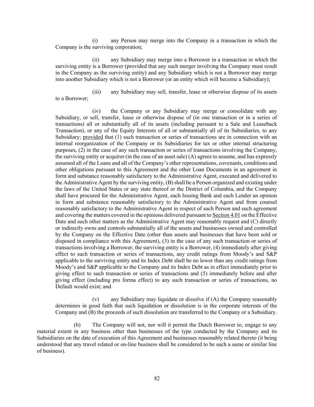 82 (i) any Person may merge into the Company in a transaction in which the Company is the surviving corporation; (ii) any Subsidiary may merge into a Borrower in a transaction in which the surviving entity is a Borrower (provided that any such merger involving the Company must result in the Company as the surviving entity) and any Subsidiary which is not a Borrower may merge into another Subsidiary which is not a Borrower (or an entity which will become a Subsidiary); (iii) any Subsidiary may sell, transfer, lease or otherwise dispose of its assets to a Borrower; (iv) the Company or any Subsidiary may merge or consolidate with any Subsidiary, or sell, transfer, lease or otherwise dispose of (in one transaction or in a series of transactions) all or substantially all of its assets (including pursuant to a Sale and Leaseback Transaction), or any of the Equity Interests of all or substantially all of its Subsidiaries, to any Subsidiary; provided that (1) such transaction or series of transactions are in connection with an internal reorganization of the Company or its Subsidiaries for tax or other internal structuring purposes, (2) in the case of any such transaction or series of transactions involving the Company, the surviving entity or acquirer (in the case of an asset sale) (A) agrees to assume, and has expressly assumed all of the Loans and all of the Company’s other representations, covenants, conditions and other obligations pursuant to this Agreement and the other Loan Documents in an agreement in form and substance reasonably satisfactory to the Administrative Agent, executed and delivered to the Administrative Agent by the surviving entity, (B) shall be a Person organized and existing under the laws of the United States or any state thereof or the District of Columbia, and the Company shall have procured for the Administrative Agent, each Issuing Bank and each Lender an opinion in form and substance reasonably satisfactory to the Administrative Agent and from counsel reasonably satisfactory to the Administrative Agent in respect of such Person and such agreement and covering the matters covered in the opinions delivered pursuant to Section 4.01 on the Effective Date and such other matters as the Administrative Agent may reasonably request and (C) directly or indirectly owns and controls substantially all of the assets and businesses owned and controlled by the Company on the Effective Date (other than assets and businesses that have been sold or disposed in compliance with this Agreement), (3) in the case of any such transaction or series of transactions involving a Borrower, the surviving entity is a Borrower, (4) immediately after giving effect to such transaction or series of transactions, any credit ratings from Moody’s and S&P applicable to the surviving entity and its Index Debt shall be no lower than any credit ratings from Moody’s and S&P applicable to the Company and its Index Debt as in effect immediately prior to giving effect to such transaction or series of transactions and (5) immediately before and after giving effect (including pro forma effect) to any such transaction or series of transactions, no Default would exist; and (v) any Subsidiary may liquidate or dissolve if (A) the Company reasonably determines in good faith that such liquidation or dissolution is in the corporate interests of the Company and (B) the proceeds of such dissolution are transferred to the Company or a Subsidiary. (b) The Company will not, nor will it permit the Dutch Borrower to, engage to any material extent in any business other than businesses of the type conducted by the Company and its Subsidiaries on the date of execution of this Agreement and businesses reasonably related thereto (it being understood that any travel related or on-line business shall be considered to be such a same or similar line of business).