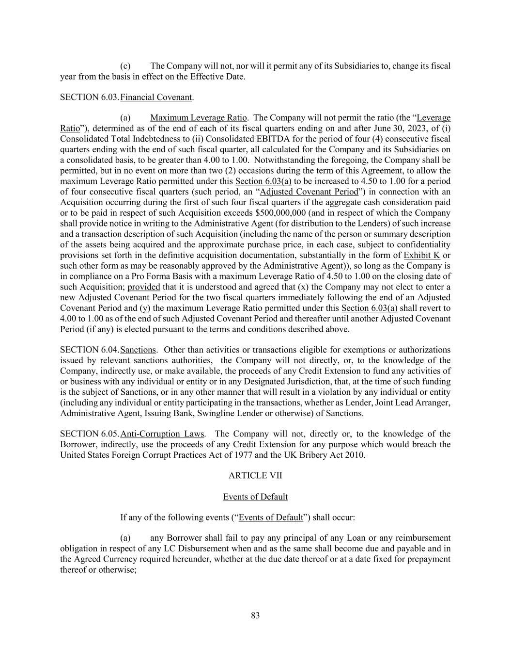 83 (c) The Company will not, nor will it permit any of its Subsidiaries to, change its fiscal year from the basis in effect on the Effective Date. Financial Covenant. (a) Maximum Leverage Ratio. The Company will not permit the ratio (the “Leverage Ratio”), determined as of the end of each of its fiscal quarters ending on and after June 30, 2023, of (i) Consolidated Total Indebtedness to (ii) Consolidated EBITDA for the period of four (4) consecutive fiscal quarters ending with the end of such fiscal quarter, all calculated for the Company and its Subsidiaries on a consolidated basis, to be greater than 4.00 to 1.00. Notwithstanding the foregoing, the Company shall be permitted, but in no event on more than two (2) occasions during the term of this Agreement, to allow the maximum Leverage Ratio permitted under this Section 6.03(a) to be increased to 4.50 to 1.00 for a period of four consecutive fiscal quarters (such period, an “Adjusted Covenant Period”) in connection with an Acquisition occurring during the first of such four fiscal quarters if the aggregate cash consideration paid or to be paid in respect of such Acquisition exceeds $500,000,000 (and in respect of which the Company shall provide notice in writing to the Administrative Agent (for distribution to the Lenders) of such increase and a transaction description of such Acquisition (including the name of the person or summary description of the assets being acquired and the approximate purchase price, in each case, subject to confidentiality provisions set forth in the definitive acquisition documentation, substantially in the form of Exhibit K or such other form as may be reasonably approved by the Administrative Agent)), so long as the Company is in compliance on a Pro Forma Basis with a maximum Leverage Ratio of 4.50 to 1.00 on the closing date of such Acquisition; provided that it is understood and agreed that (x) the Company may not elect to enter a new Adjusted Covenant Period for the two fiscal quarters immediately following the end of an Adjusted Covenant Period and (y) the maximum Leverage Ratio permitted under this Section 6.03(a) shall revert to 4.00 to 1.00 as of the end of such Adjusted Covenant Period and thereafter until another Adjusted Covenant Period (if any) is elected pursuant to the terms and conditions described above. Sanctions. Other than activities or transactions eligible for exemptions or authorizations issued by relevant sanctions authorities, the Company will not directly, or, to the knowledge of the Company, indirectly use, or make available, the proceeds of any Credit Extension to fund any activities of or business with any individual or entity or in any Designated Jurisdiction, that, at the time of such funding is the subject of Sanctions, or in any other manner that will result in a violation by any individual or entity (including any individual or entity participating in the transactions, whether as Lender, Joint Lead Arranger, Administrative Agent, Issuing Bank, Swingline Lender or otherwise) of Sanctions. Anti-Corruption Laws. The Company will not, directly or, to the knowledge of the Borrower, indirectly, use the proceeds of any Credit Extension for any purpose which would breach the United States Foreign Corrupt Practices Act of 1977 and the UK Bribery Act 2010. ARTICLE VII Events of Default If any of the following events (“Events of Default”) shall occur: (a) any Borrower shall fail to pay any principal of any Loan or any reimbursement obligation in respect of any LC Disbursement when and as the same shall become due and payable and in the Agreed Currency required hereunder, whether at the due date thereof or at a date fixed for prepayment thereof or otherwise;