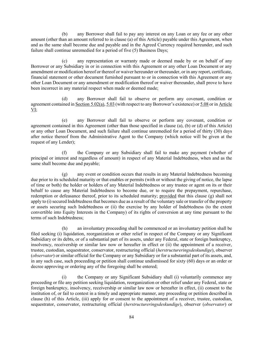84 (b) any Borrower shall fail to pay any interest on any Loan or any fee or any other amount (other than an amount referred to in clause (a) of this Article) payable under this Agreement, when and as the same shall become due and payable and in the Agreed Currency required hereunder, and such failure shall continue unremedied for a period of five (5) Business Days; (c) any representation or warranty made or deemed made by or on behalf of any Borrower or any Subsidiary in or in connection with this Agreement or any other Loan Document or any amendment or modification hereof or thereof or waiver hereunder or thereunder, or in any report, certificate, financial statement or other document furnished pursuant to or in connection with this Agreement or any other Loan Document or any amendment or modification thereof or waiver thereunder, shall prove to have been incorrect in any material respect when made or deemed made; (d) any Borrower shall fail to observe or perform any covenant, condition or agreement contained in Section 5.02(a), 5.03 (with respect to any Borrower’s existence) or 5.08 or in Article VI; (e) any Borrower shall fail to observe or perform any covenant, condition or agreement contained in this Agreement (other than those specified in clause (a), (b) or (d) of this Article) or any other Loan Document, and such failure shall continue unremedied for a period of thirty (30) days after notice thereof from the Administrative Agent to the Company (which notice will be given at the request of any Lender); (f) the Company or any Subsidiary shall fail to make any payment (whether of principal or interest and regardless of amount) in respect of any Material Indebtedness, when and as the same shall become due and payable; (g) any event or condition occurs that results in any Material Indebtedness becoming due prior to its scheduled maturity or that enables or permits (with or without the giving of notice, the lapse of time or both) the holder or holders of any Material Indebtedness or any trustee or agent on its or their behalf to cause any Material Indebtedness to become due, or to require the prepayment, repurchase, redemption or defeasance thereof, prior to its scheduled maturity; provided that this clause (g) shall not apply to (i) secured Indebtedness that becomes due as a result of the voluntary sale or transfer of the property or assets securing such Indebtedness or (ii) the exercise by any holder of Indebtedness (to the extent convertible into Equity Interests in the Company) of its rights of conversion at any time pursuant to the terms of such Indebtedness; (h) an involuntary proceeding shall be commenced or an involuntary petition shall be filed seeking (i) liquidation, reorganization or other relief in respect of the Company or any Significant Subsidiary or its debts, or of a substantial part of its assets, under any Federal, state or foreign bankruptcy, insolvency, receivership or similar law now or hereafter in effect or (ii) the appointment of a receiver, trustee, custodian, sequestrator, conservator, restructuring official (herstructureringsdeskundige), observer (observator) or similar official for the Company or any Subsidiary or for a substantial part of its assets, and, in any such case, such proceeding or petition shall continue undismissed for sixty (60) days or an order or decree approving or ordering any of the foregoing shall be entered; (i) the Company or any Significant Subsidiary shall (i) voluntarily commence any proceeding or file any petition seeking liquidation, reorganization or other relief under any Federal, state or foreign bankruptcy, insolvency, receivership or similar law now or hereafter in effect, (ii) consent to the institution of, or fail to contest in a timely and appropriate manner, any proceeding or petition described in clause (h) of this Article, (iii) apply for or consent to the appointment of a receiver, trustee, custodian, sequestrator, conservator, restructuring official (herstructureringsdeskundige), observer (observator) or