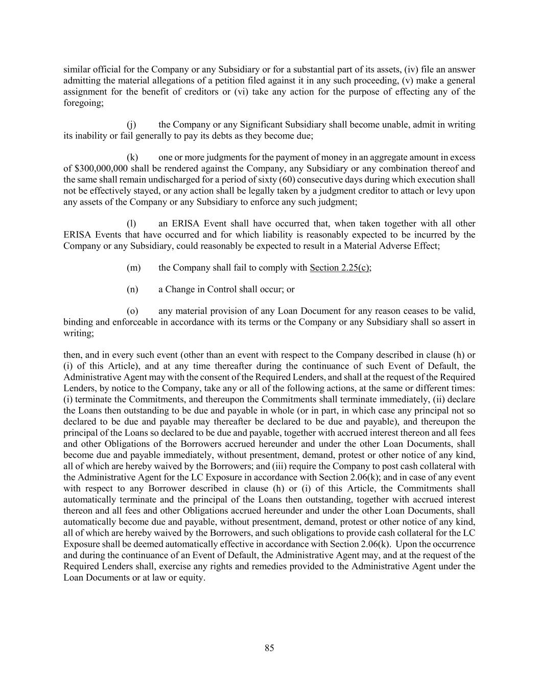 85 similar official for the Company or any Subsidiary or for a substantial part of its assets, (iv) file an answer admitting the material allegations of a petition filed against it in any such proceeding, (v) make a general assignment for the benefit of creditors or (vi) take any action for the purpose of effecting any of the foregoing; (j) the Company or any Significant Subsidiary shall become unable, admit in writing its inability or fail generally to pay its debts as they become due; (k) one or more judgments for the payment of money in an aggregate amount in excess of $300,000,000 shall be rendered against the Company, any Subsidiary or any combination thereof and the same shall remain undischarged for a period of sixty (60) consecutive days during which execution shall not be effectively stayed, or any action shall be legally taken by a judgment creditor to attach or levy upon any assets of the Company or any Subsidiary to enforce any such judgment; (l) an ERISA Event shall have occurred that, when taken together with all other ERISA Events that have occurred and for which liability is reasonably expected to be incurred by the Company or any Subsidiary, could reasonably be expected to result in a Material Adverse Effect; (m) the Company shall fail to comply with Section 2.25(c); (n) a Change in Control shall occur; or (o) any material provision of any Loan Document for any reason ceases to be valid, binding and enforceable in accordance with its terms or the Company or any Subsidiary shall so assert in writing; then, and in every such event (other than an event with respect to the Company described in clause (h) or (i) of this Article), and at any time thereafter during the continuance of such Event of Default, the Administrative Agent may with the consent of the Required Lenders, and shall at the request of the Required Lenders, by notice to the Company, take any or all of the following actions, at the same or different times: (i) terminate the Commitments, and thereupon the Commitments shall terminate immediately, (ii) declare the Loans then outstanding to be due and payable in whole (or in part, in which case any principal not so declared to be due and payable may thereafter be declared to be due and payable), and thereupon the principal of the Loans so declared to be due and payable, together with accrued interest thereon and all fees and other Obligations of the Borrowers accrued hereunder and under the other Loan Documents, shall become due and payable immediately, without presentment, demand, protest or other notice of any kind, all of which are hereby waived by the Borrowers; and (iii) require the Company to post cash collateral with the Administrative Agent for the LC Exposure in accordance with Section 2.06(k); and in case of any event with respect to any Borrower described in clause (h) or (i) of this Article, the Commitments shall automatically terminate and the principal of the Loans then outstanding, together with accrued interest thereon and all fees and other Obligations accrued hereunder and under the other Loan Documents, shall automatically become due and payable, without presentment, demand, protest or other notice of any kind, all of which are hereby waived by the Borrowers, and such obligations to provide cash collateral for the LC Exposure shall be deemed automatically effective in accordance with Section 2.06(k). Upon the occurrence and during the continuance of an Event of Default, the Administrative Agent may, and at the request of the Required Lenders shall, exercise any rights and remedies provided to the Administrative Agent under the Loan Documents or at law or equity.
