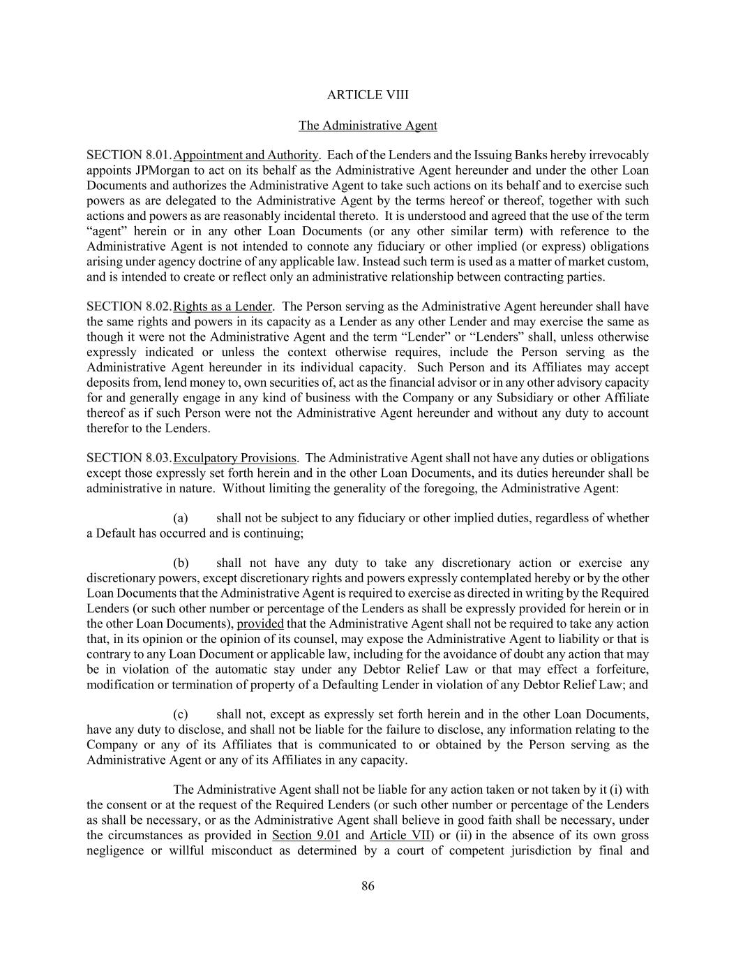 86 ARTICLE VIII The Administrative Agent Appointment and Authority. Each of the Lenders and the Issuing Banks hereby irrevocably appoints JPMorgan to act on its behalf as the Administrative Agent hereunder and under the other Loan Documents and authorizes the Administrative Agent to take such actions on its behalf and to exercise such powers as are delegated to the Administrative Agent by the terms hereof or thereof, together with such actions and powers as are reasonably incidental thereto. It is understood and agreed that the use of the term “agent” herein or in any other Loan Documents (or any other similar term) with reference to the Administrative Agent is not intended to connote any fiduciary or other implied (or express) obligations arising under agency doctrine of any applicable law. Instead such term is used as a matter of market custom, and is intended to create or reflect only an administrative relationship between contracting parties. Rights as a Lender. The Person serving as the Administrative Agent hereunder shall have the same rights and powers in its capacity as a Lender as any other Lender and may exercise the same as though it were not the Administrative Agent and the term “Lender” or “Lenders” shall, unless otherwise expressly indicated or unless the context otherwise requires, include the Person serving as the Administrative Agent hereunder in its individual capacity. Such Person and its Affiliates may accept deposits from, lend money to, own securities of, act as the financial advisor or in any other advisory capacity for and generally engage in any kind of business with the Company or any Subsidiary or other Affiliate thereof as if such Person were not the Administrative Agent hereunder and without any duty to account therefor to the Lenders. Exculpatory Provisions. The Administrative Agent shall not have any duties or obligations except those expressly set forth herein and in the other Loan Documents, and its duties hereunder shall be administrative in nature. Without limiting the generality of the foregoing, the Administrative Agent: (a) shall not be subject to any fiduciary or other implied duties, regardless of whether a Default has occurred and is continuing; (b) shall not have any duty to take any discretionary action or exercise any discretionary powers, except discretionary rights and powers expressly contemplated hereby or by the other Loan Documents that the Administrative Agent is required to exercise as directed in writing by the Required Lenders (or such other number or percentage of the Lenders as shall be expressly provided for herein or in the other Loan Documents), provided that the Administrative Agent shall not be required to take any action that, in its opinion or the opinion of its counsel, may expose the Administrative Agent to liability or that is contrary to any Loan Document or applicable law, including for the avoidance of doubt any action that may be in violation of the automatic stay under any Debtor Relief Law or that may effect a forfeiture, modification or termination of property of a Defaulting Lender in violation of any Debtor Relief Law; and (c) shall not, except as expressly set forth herein and in the other Loan Documents, have any duty to disclose, and shall not be liable for the failure to disclose, any information relating to the Company or any of its Affiliates that is communicated to or obtained by the Person serving as the Administrative Agent or any of its Affiliates in any capacity. The Administrative Agent shall not be liable for any action taken or not taken by it (i) with the consent or at the request of the Required Lenders (or such other number or percentage of the Lenders as shall be necessary, or as the Administrative Agent shall believe in good faith shall be necessary, under the circumstances as provided in Section 9.01 and Article VII) or (ii) in the absence of its own gross negligence or willful misconduct as determined by a court of competent jurisdiction by final and