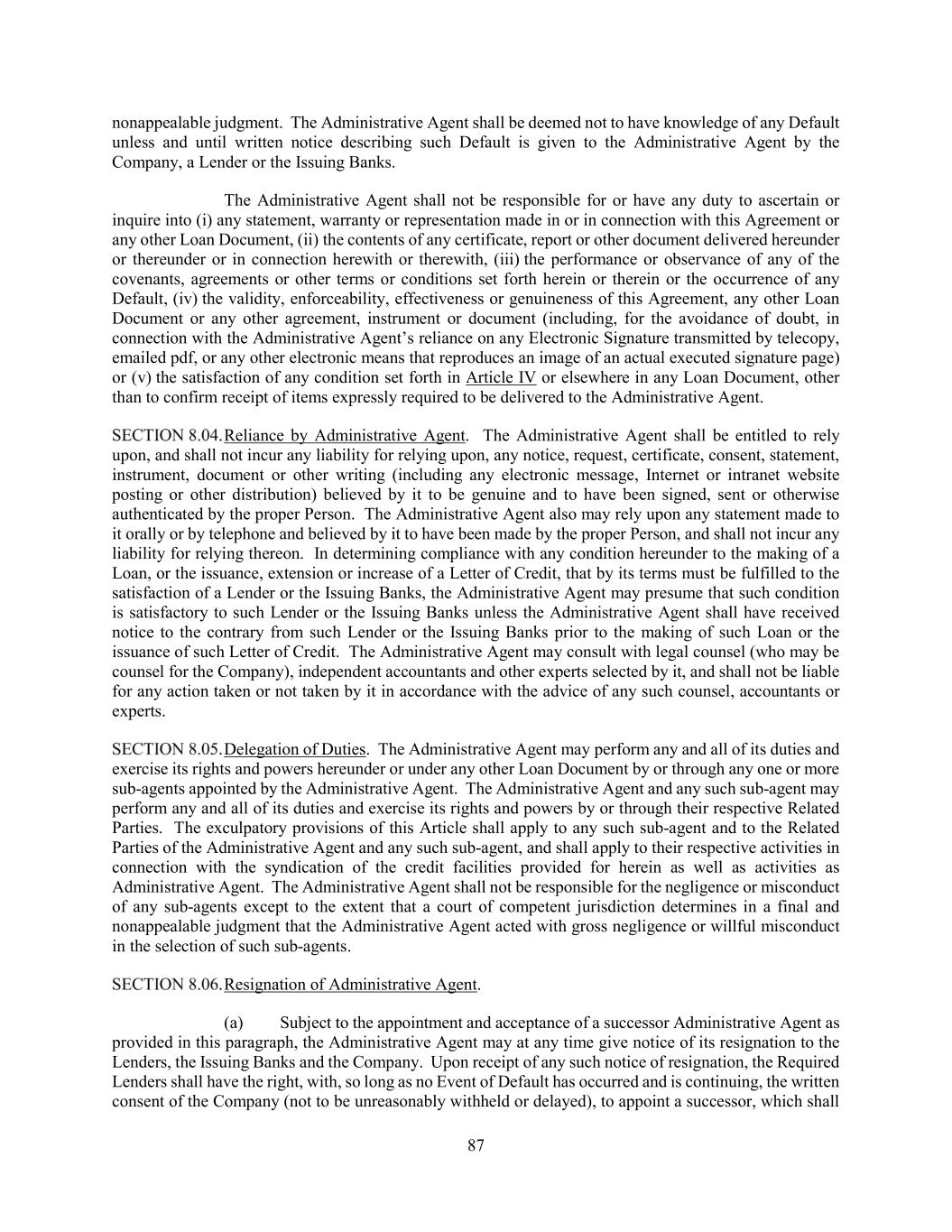 87 nonappealable judgment. The Administrative Agent shall be deemed not to have knowledge of any Default unless and until written notice describing such Default is given to the Administrative Agent by the Company, a Lender or the Issuing Banks. The Administrative Agent shall not be responsible for or have any duty to ascertain or inquire into (i) any statement, warranty or representation made in or in connection with this Agreement or any other Loan Document, (ii) the contents of any certificate, report or other document delivered hereunder or thereunder or in connection herewith or therewith, (iii) the performance or observance of any of the covenants, agreements or other terms or conditions set forth herein or therein or the occurrence of any Default, (iv) the validity, enforceability, effectiveness or genuineness of this Agreement, any other Loan Document or any other agreement, instrument or document (including, for the avoidance of doubt, in connection with the Administrative Agent’s reliance on any Electronic Signature transmitted by telecopy, emailed pdf, or any other electronic means that reproduces an image of an actual executed signature page) or (v) the satisfaction of any condition set forth in Article IV or elsewhere in any Loan Document, other than to confirm receipt of items expressly required to be delivered to the Administrative Agent. Reliance by Administrative Agent. The Administrative Agent shall be entitled to rely upon, and shall not incur any liability for relying upon, any notice, request, certificate, consent, statement, instrument, document or other writing (including any electronic message, Internet or intranet website posting or other distribution) believed by it to be genuine and to have been signed, sent or otherwise authenticated by the proper Person. The Administrative Agent also may rely upon any statement made to it orally or by telephone and believed by it to have been made by the proper Person, and shall not incur any liability for relying thereon. In determining compliance with any condition hereunder to the making of a Loan, or the issuance, extension or increase of a Letter of Credit, that by its terms must be fulfilled to the satisfaction of a Lender or the Issuing Banks, the Administrative Agent may presume that such condition is satisfactory to such Lender or the Issuing Banks unless the Administrative Agent shall have received notice to the contrary from such Lender or the Issuing Banks prior to the making of such Loan or the issuance of such Letter of Credit. The Administrative Agent may consult with legal counsel (who may be counsel for the Company), independent accountants and other experts selected by it, and shall not be liable for any action taken or not taken by it in accordance with the advice of any such counsel, accountants or experts. Delegation of Duties. The Administrative Agent may perform any and all of its duties and exercise its rights and powers hereunder or under any other Loan Document by or through any one or more sub-agents appointed by the Administrative Agent. The Administrative Agent and any such sub-agent may perform any and all of its duties and exercise its rights and powers by or through their respective Related Parties. The exculpatory provisions of this Article shall apply to any such sub-agent and to the Related Parties of the Administrative Agent and any such sub-agent, and shall apply to their respective activities in connection with the syndication of the credit facilities provided for herein as well as activities as Administrative Agent. The Administrative Agent shall not be responsible for the negligence or misconduct of any sub-agents except to the extent that a court of competent jurisdiction determines in a final and nonappealable judgment that the Administrative Agent acted with gross negligence or willful misconduct in the selection of such sub-agents. Resignation of Administrative Agent. (a) Subject to the appointment and acceptance of a successor Administrative Agent as provided in this paragraph, the Administrative Agent may at any time give notice of its resignation to the Lenders, the Issuing Banks and the Company. Upon receipt of any such notice of resignation, the Required Lenders shall have the right, with, so long as no Event of Default has occurred and is continuing, the written consent of the Company (not to be unreasonably withheld or delayed), to appoint a successor, which shall