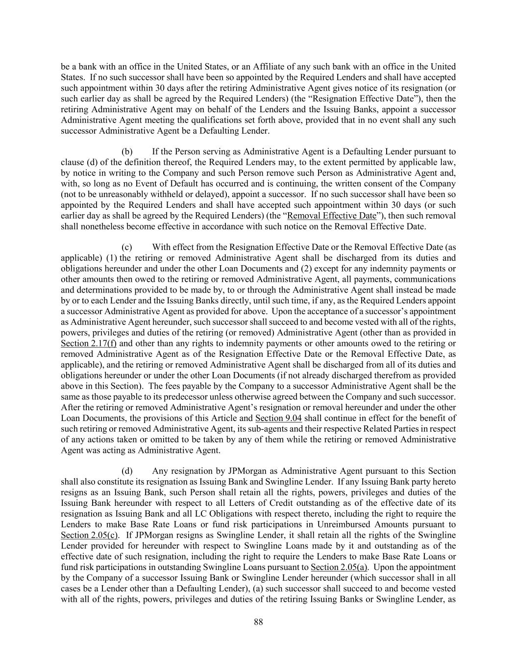 88 be a bank with an office in the United States, or an Affiliate of any such bank with an office in the United States. If no such successor shall have been so appointed by the Required Lenders and shall have accepted such appointment within 30 days after the retiring Administrative Agent gives notice of its resignation (or such earlier day as shall be agreed by the Required Lenders) (the “Resignation Effective Date”), then the retiring Administrative Agent may on behalf of the Lenders and the Issuing Banks, appoint a successor Administrative Agent meeting the qualifications set forth above, provided that in no event shall any such successor Administrative Agent be a Defaulting Lender. (b) If the Person serving as Administrative Agent is a Defaulting Lender pursuant to clause (d) of the definition thereof, the Required Lenders may, to the extent permitted by applicable law, by notice in writing to the Company and such Person remove such Person as Administrative Agent and, with, so long as no Event of Default has occurred and is continuing, the written consent of the Company (not to be unreasonably withheld or delayed), appoint a successor. If no such successor shall have been so appointed by the Required Lenders and shall have accepted such appointment within 30 days (or such earlier day as shall be agreed by the Required Lenders) (the “Removal Effective Date”), then such removal shall nonetheless become effective in accordance with such notice on the Removal Effective Date. (c) With effect from the Resignation Effective Date or the Removal Effective Date (as applicable) (1) the retiring or removed Administrative Agent shall be discharged from its duties and obligations hereunder and under the other Loan Documents and (2) except for any indemnity payments or other amounts then owed to the retiring or removed Administrative Agent, all payments, communications and determinations provided to be made by, to or through the Administrative Agent shall instead be made by or to each Lender and the Issuing Banks directly, until such time, if any, as the Required Lenders appoint a successor Administrative Agent as provided for above. Upon the acceptance of a successor’s appointment as Administrative Agent hereunder, such successor shall succeed to and become vested with all of the rights, powers, privileges and duties of the retiring (or removed) Administrative Agent (other than as provided in Section 2.17(f) and other than any rights to indemnity payments or other amounts owed to the retiring or removed Administrative Agent as of the Resignation Effective Date or the Removal Effective Date, as applicable), and the retiring or removed Administrative Agent shall be discharged from all of its duties and obligations hereunder or under the other Loan Documents (if not already discharged therefrom as provided above in this Section). The fees payable by the Company to a successor Administrative Agent shall be the same as those payable to its predecessor unless otherwise agreed between the Company and such successor. After the retiring or removed Administrative Agent’s resignation or removal hereunder and under the other Loan Documents, the provisions of this Article and Section 9.04 shall continue in effect for the benefit of such retiring or removed Administrative Agent, its sub-agents and their respective Related Parties in respect of any actions taken or omitted to be taken by any of them while the retiring or removed Administrative Agent was acting as Administrative Agent. (d) Any resignation by JPMorgan as Administrative Agent pursuant to this Section shall also constitute its resignation as Issuing Bank and Swingline Lender. If any Issuing Bank party hereto resigns as an Issuing Bank, such Person shall retain all the rights, powers, privileges and duties of the Issuing Bank hereunder with respect to all Letters of Credit outstanding as of the effective date of its resignation as Issuing Bank and all LC Obligations with respect thereto, including the right to require the Lenders to make Base Rate Loans or fund risk participations in Unreimbursed Amounts pursuant to Section 2.05(c). If JPMorgan resigns as Swingline Lender, it shall retain all the rights of the Swingline Lender provided for hereunder with respect to Swingline Loans made by it and outstanding as of the effective date of such resignation, including the right to require the Lenders to make Base Rate Loans or fund risk participations in outstanding Swingline Loans pursuant to Section 2.05(a). Upon the appointment by the Company of a successor Issuing Bank or Swingline Lender hereunder (which successor shall in all cases be a Lender other than a Defaulting Lender), (a) such successor shall succeed to and become vested with all of the rights, powers, privileges and duties of the retiring Issuing Banks or Swingline Lender, as