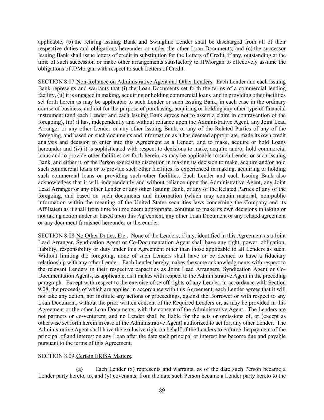 89 applicable, (b) the retiring Issuing Bank and Swingline Lender shall be discharged from all of their respective duties and obligations hereunder or under the other Loan Documents, and (c) the successor Issuing Bank shall issue letters of credit in substitution for the Letters of Credit, if any, outstanding at the time of such succession or make other arrangements satisfactory to JPMorgan to effectively assume the obligations of JPMorgan with respect to such Letters of Credit. Non-Reliance on Administrative Agent and Other Lenders. Each Lender and each Issuing Bank represents and warrants that (i) the Loan Documents set forth the terms of a commercial lending facility, (ii) it is engaged in making, acquiring or holding commercial loans and in providing other facilities set forth herein as may be applicable to such Lender or such Issuing Bank, in each case in the ordinary course of business, and not for the purpose of purchasing, acquiring or holding any other type of financial instrument (and each Lender and each Issuing Bank agrees not to assert a claim in contravention of the foregoing), (iii) it has, independently and without reliance upon the Administrative Agent, any Joint Lead Arranger or any other Lender or any other Issuing Bank, or any of the Related Parties of any of the foregoing, and based on such documents and information as it has deemed appropriate, made its own credit analysis and decision to enter into this Agreement as a Lender, and to make, acquire or hold Loans hereunder and (iv) it is sophisticated with respect to decisions to make, acquire and/or hold commercial loans and to provide other facilities set forth herein, as may be applicable to such Lender or such Issuing Bank, and either it, or the Person exercising discretion in making its decision to make, acquire and/or hold such commercial loans or to provide such other facilities, is experienced in making, acquiring or holding such commercial loans or providing such other facilities. Each Lender and each Issuing Bank also acknowledges that it will, independently and without reliance upon the Administrative Agent, any Joint Lead Arranger or any other Lender or any other Issuing Bank, or any of the Related Parties of any of the foregoing, and based on such documents and information (which may contain material, non-public information within the meaning of the United States securities laws concerning the Company and its Affiliates) as it shall from time to time deem appropriate, continue to make its own decisions in taking or not taking action under or based upon this Agreement, any other Loan Document or any related agreement or any document furnished hereunder or thereunder. No Other Duties, Etc.. None of the Lenders, if any, identified in this Agreement as a Joint Lead Arranger, Syndication Agent or Co-Documentation Agent shall have any right, power, obligation, liability, responsibility or duty under this Agreement other than those applicable to all Lenders as such. Without limiting the foregoing, none of such Lenders shall have or be deemed to have a fiduciary relationship with any other Lender. Each Lender hereby makes the same acknowledgments with respect to the relevant Lenders in their respective capacities as Joint Lead Arrangers, Syndication Agent or Co- Documentation Agents, as applicable, as it makes with respect to the Administrative Agent in the preceding paragraph. Except with respect to the exercise of setoff rights of any Lender, in accordance with Section 9.08, the proceeds of which are applied in accordance with this Agreement, each Lender agrees that it will not take any action, nor institute any actions or proceedings, against the Borrower or with respect to any Loan Document, without the prior written consent of the Required Lenders or, as may be provided in this Agreement or the other Loan Documents, with the consent of the Administrative Agent. The Lenders are not partners or co-venturers, and no Lender shall be liable for the acts or omissions of, or (except as otherwise set forth herein in case of the Administrative Agent) authorized to act for, any other Lender. The Administrative Agent shall have the exclusive right on behalf of the Lenders to enforce the payment of the principal of and interest on any Loan after the date such principal or interest has become due and payable pursuant to the terms of this Agreement. Certain ERISA Matters. (a) Each Lender (x) represents and warrants, as of the date such Person became a Lender party hereto, to, and (y) covenants, from the date such Person became a Lender party hereto to the
