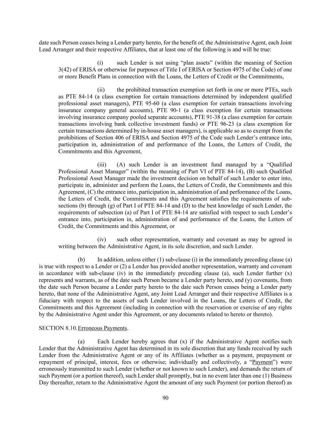 90 date such Person ceases being a Lender party hereto, for the benefit of, the Administrative Agent, each Joint Lead Arranger and their respective Affiliates, that at least one of the following is and will be true: (i) such Lender is not using “plan assets” (within the meaning of Section 3(42) of ERISA or otherwise for purposes of Title I of ERISA or Section 4975 of the Code) of one or more Benefit Plans in connection with the Loans, the Letters of Credit or the Commitments, (ii) the prohibited transaction exemption set forth in one or more PTEs, such as PTE 84-14 (a class exemption for certain transactions determined by independent qualified professional asset managers), PTE 95-60 (a class exemption for certain transactions involving insurance company general accounts), PTE 90-1 (a class exemption for certain transactions involving insurance company pooled separate accounts), PTE 91-38 (a class exemption for certain transactions involving bank collective investment funds) or PTE 96-23 (a class exemption for certain transactions determined by in-house asset managers), is applicable so as to exempt from the prohibitions of Section 406 of ERISA and Section 4975 of the Code such Lender’s entrance into, participation in, administration of and performance of the Loans, the Letters of Credit, the Commitments and this Agreement, (iii) (A) such Lender is an investment fund managed by a “Qualified Professional Asset Manager” (within the meaning of Part VI of PTE 84-14), (B) such Qualified Professional Asset Manager made the investment decision on behalf of such Lender to enter into, participate in, administer and perform the Loans, the Letters of Credit, the Commitments and this Agreement, (C) the entrance into, participation in, administration of and performance of the Loans, the Letters of Credit, the Commitments and this Agreement satisfies the requirements of sub- sections (b) through (g) of Part I of PTE 84-14 and (D) to the best knowledge of such Lender, the requirements of subsection (a) of Part I of PTE 84-14 are satisfied with respect to such Lender’s entrance into, participation in, administration of and performance of the Loans, the Letters of Credit, the Commitments and this Agreement, or (iv) such other representation, warranty and covenant as may be agreed in writing between the Administrative Agent, in its sole discretion, and such Lender. (b) In addition, unless either (1) sub-clause (i) in the immediately preceding clause (a) is true with respect to a Lender or (2) a Lender has provided another representation, warranty and covenant in accordance with sub-clause (iv) in the immediately preceding clause (a), such Lender further (x) represents and warrants, as of the date such Person became a Lender party hereto, and (y) covenants, from the date such Person became a Lender party hereto to the date such Person ceases being a Lender party hereto, that none of the Administrative Agent, any Joint Lead Arranger and their respective Affiliates is a fiduciary with respect to the assets of such Lender involved in the Loans, the Letters of Credit, the Commitments and this Agreement (including in connection with the reservation or exercise of any rights by the Administrative Agent under this Agreement, or any documents related to hereto or thereto). Erroneous Payments. (a) Each Lender hereby agrees that (x) if the Administrative Agent notifies such Lender that the Administrative Agent has determined in its sole discretion that any funds received by such Lender from the Administrative Agent or any of its Affiliates (whether as a payment, prepayment or repayment of principal, interest, fees or otherwise; individually and collectively, a “Payment”) were erroneously transmitted to such Lender (whether or not known to such Lender), and demands the return of such Payment (or a portion thereof), such Lender shall promptly, but in no event later than one (1) Business Day thereafter, return to the Administrative Agent the amount of any such Payment (or portion thereof) as