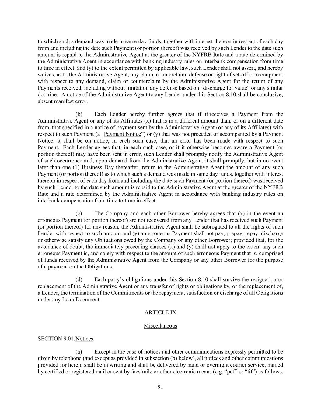 91 to which such a demand was made in same day funds, together with interest thereon in respect of each day from and including the date such Payment (or portion thereof) was received by such Lender to the date such amount is repaid to the Administrative Agent at the greater of the NYFRB Rate and a rate determined by the Administrative Agent in accordance with banking industry rules on interbank compensation from time to time in effect, and (y) to the extent permitted by applicable law, such Lender shall not assert, and hereby waives, as to the Administrative Agent, any claim, counterclaim, defense or right of set-off or recoupment with respect to any demand, claim or counterclaim by the Administrative Agent for the return of any Payments received, including without limitation any defense based on “discharge for value” or any similar doctrine. A notice of the Administrative Agent to any Lender under this Section 8.10 shall be conclusive, absent manifest error. (b) Each Lender hereby further agrees that if it receives a Payment from the Administrative Agent or any of its Affiliates (x) that is in a different amount than, or on a different date from, that specified in a notice of payment sent by the Administrative Agent (or any of its Affiliates) with respect to such Payment (a “Payment Notice”) or (y) that was not preceded or accompanied by a Payment Notice, it shall be on notice, in each such case, that an error has been made with respect to such Payment. Each Lender agrees that, in each such case, or if it otherwise becomes aware a Payment (or portion thereof) may have been sent in error, such Lender shall promptly notify the Administrative Agent of such occurrence and, upon demand from the Administrative Agent, it shall promptly, but in no event later than one (1) Business Day thereafter, return to the Administrative Agent the amount of any such Payment (or portion thereof) as to which such a demand was made in same day funds, together with interest thereon in respect of each day from and including the date such Payment (or portion thereof) was received by such Lender to the date such amount is repaid to the Administrative Agent at the greater of the NYFRB Rate and a rate determined by the Administrative Agent in accordance with banking industry rules on interbank compensation from time to time in effect. (c) The Company and each other Borrower hereby agrees that (x) in the event an erroneous Payment (or portion thereof) are not recovered from any Lender that has received such Payment (or portion thereof) for any reason, the Administrative Agent shall be subrogated to all the rights of such Lender with respect to such amount and (y) an erroneous Payment shall not pay, prepay, repay, discharge or otherwise satisfy any Obligations owed by the Company or any other Borrower; provided that, for the avoidance of doubt, the immediately preceding clauses (x) and (y) shall not apply to the extent any such erroneous Payment is, and solely with respect to the amount of such erroneous Payment that is, comprised of funds received by the Administrative Agent from the Company or any other Borrower for the purpose of a payment on the Obligations. (d) Each party’s obligations under this Section 8.10 shall survive the resignation or replacement of the Administrative Agent or any transfer of rights or obligations by, or the replacement of, a Lender, the termination of the Commitments or the repayment, satisfaction or discharge of all Obligations under any Loan Document. ARTICLE IX Miscellaneous Notices. (a) Except in the case of notices and other communications expressly permitted to be given by telephone (and except as provided in subsection (b) below), all notices and other communications provided for herein shall be in writing and shall be delivered by hand or overnight courier service, mailed by certified or registered mail or sent by facsimile or other electronic means (e.g. “pdf” or “tif”) as follows,