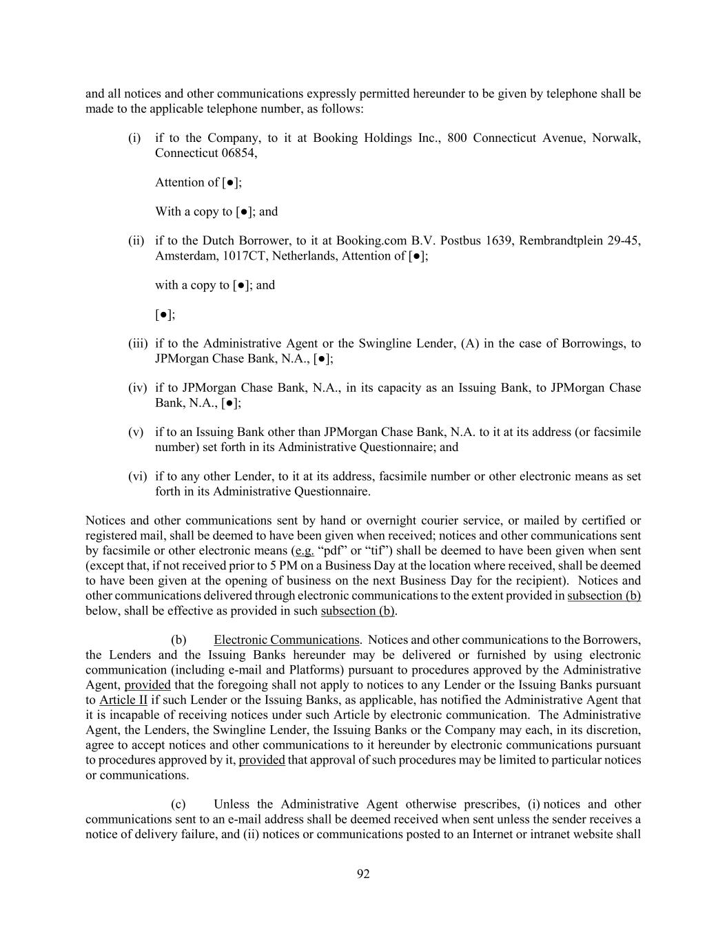 92 and all notices and other communications expressly permitted hereunder to be given by telephone shall be made to the applicable telephone number, as follows: (i) if to the Company, to it at Booking Holdings Inc., 800 Connecticut Avenue, Norwalk, Connecticut 06854, Attention of [●]; With a copy to [●]; and (ii) if to the Dutch Borrower, to it at Booking.com B.V. Postbus 1639, Rembrandtplein 29-45, Amsterdam, 1017CT, Netherlands, Attention of [●]; with a copy to [●]; and [●]; (iii) if to the Administrative Agent or the Swingline Lender, (A) in the case of Borrowings, to JPMorgan Chase Bank, N.A., [●]; (iv) if to JPMorgan Chase Bank, N.A., in its capacity as an Issuing Bank, to JPMorgan Chase Bank, N.A., [●]; (v) if to an Issuing Bank other than JPMorgan Chase Bank, N.A. to it at its address (or facsimile number) set forth in its Administrative Questionnaire; and (vi) if to any other Lender, to it at its address, facsimile number or other electronic means as set forth in its Administrative Questionnaire. Notices and other communications sent by hand or overnight courier service, or mailed by certified or registered mail, shall be deemed to have been given when received; notices and other communications sent by facsimile or other electronic means (e.g. “pdf” or “tif”) shall be deemed to have been given when sent (except that, if not received prior to 5 PM on a Business Day at the location where received, shall be deemed to have been given at the opening of business on the next Business Day for the recipient). Notices and other communications delivered through electronic communications to the extent provided in subsection (b) below, shall be effective as provided in such subsection (b). (b) Electronic Communications. Notices and other communications to the Borrowers, the Lenders and the Issuing Banks hereunder may be delivered or furnished by using electronic communication (including e-mail and Platforms) pursuant to procedures approved by the Administrative Agent, provided that the foregoing shall not apply to notices to any Lender or the Issuing Banks pursuant to Article II if such Lender or the Issuing Banks, as applicable, has notified the Administrative Agent that it is incapable of receiving notices under such Article by electronic communication. The Administrative Agent, the Lenders, the Swingline Lender, the Issuing Banks or the Company may each, in its discretion, agree to accept notices and other communications to it hereunder by electronic communications pursuant to procedures approved by it, provided that approval of such procedures may be limited to particular notices or communications. (c) Unless the Administrative Agent otherwise prescribes, (i) notices and other communications sent to an e-mail address shall be deemed received when sent unless the sender receives a notice of delivery failure, and (ii) notices or communications posted to an Internet or intranet website shall