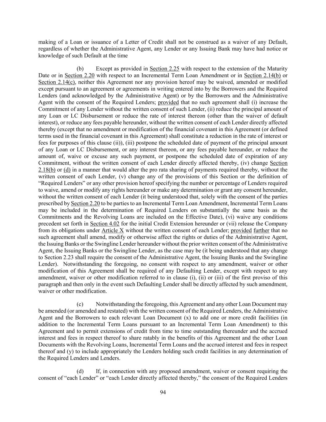 94 making of a Loan or issuance of a Letter of Credit shall not be construed as a waiver of any Default, regardless of whether the Administrative Agent, any Lender or any Issuing Bank may have had notice or knowledge of such Default at the time (b) Except as provided in Section 2.25 with respect to the extension of the Maturity Date or in Section 2.20 with respect to an Incremental Term Loan Amendment or in Section 2.14(b) or Section 2.14(c), neither this Agreement nor any provision hereof may be waived, amended or modified except pursuant to an agreement or agreements in writing entered into by the Borrowers and the Required Lenders (and acknowledged by the Administrative Agent) or by the Borrowers and the Administrative Agent with the consent of the Required Lenders; provided that no such agreement shall (i) increase the Commitment of any Lender without the written consent of such Lender, (ii) reduce the principal amount of any Loan or LC Disbursement or reduce the rate of interest thereon (other than the waiver of default interest), or reduce any fees payable hereunder, without the written consent of each Lender directly affected thereby (except that no amendment or modification of the financial covenant in this Agreement (or defined terms used in the financial covenant in this Agreement) shall constitute a reduction in the rate of interest or fees for purposes of this clause (ii)), (iii) postpone the scheduled date of payment of the principal amount of any Loan or LC Disbursement, or any interest thereon, or any fees payable hereunder, or reduce the amount of, waive or excuse any such payment, or postpone the scheduled date of expiration of any Commitment, without the written consent of each Lender directly affected thereby, (iv) change Section 2.18(b) or (d) in a manner that would alter the pro rata sharing of payments required thereby, without the written consent of each Lender, (v) change any of the provisions of this Section or the definition of “Required Lenders” or any other provision hereof specifying the number or percentage of Lenders required to waive, amend or modify any rights hereunder or make any determination or grant any consent hereunder, without the written consent of each Lender (it being understood that, solely with the consent of the parties prescribed by Section 2.20 to be parties to an Incremental Term Loan Amendment, Incremental Term Loans may be included in the determination of Required Lenders on substantially the same basis as the Commitments and the Revolving Loans are included on the Effective Date), (vi) waive any conditions precedent set forth in Section 4.02 for the initial Credit Extension hereunder or (vii) release the Company from its obligations under Article X without the written consent of each Lender; provided further that no such agreement shall amend, modify or otherwise affect the rights or duties of the Administrative Agent, the Issuing Banks or the Swingline Lender hereunder without the prior written consent of the Administrative Agent, the Issuing Banks or the Swingline Lender, as the case may be (it being understood that any change to Section 2.23 shall require the consent of the Administrative Agent, the Issuing Banks and the Swingline Lender). Notwithstanding the foregoing, no consent with respect to any amendment, waiver or other modification of this Agreement shall be required of any Defaulting Lender, except with respect to any amendment, waiver or other modification referred to in clause (i), (ii) or (iii) of the first proviso of this paragraph and then only in the event such Defaulting Lender shall be directly affected by such amendment, waiver or other modification. (c) Notwithstanding the foregoing, this Agreement and any other Loan Document may be amended (or amended and restated) with the written consent of the Required Lenders, the Administrative Agent and the Borrowers to each relevant Loan Document (x) to add one or more credit facilities (in addition to the Incremental Term Loans pursuant to an Incremental Term Loan Amendment) to this Agreement and to permit extensions of credit from time to time outstanding thereunder and the accrued interest and fees in respect thereof to share ratably in the benefits of this Agreement and the other Loan Documents with the Revolving Loans, Incremental Term Loans and the accrued interest and fees in respect thereof and (y) to include appropriately the Lenders holding such credit facilities in any determination of the Required Lenders and Lenders. (d) If, in connection with any proposed amendment, waiver or consent requiring the consent of “each Lender” or “each Lender directly affected thereby,” the consent of the Required Lenders