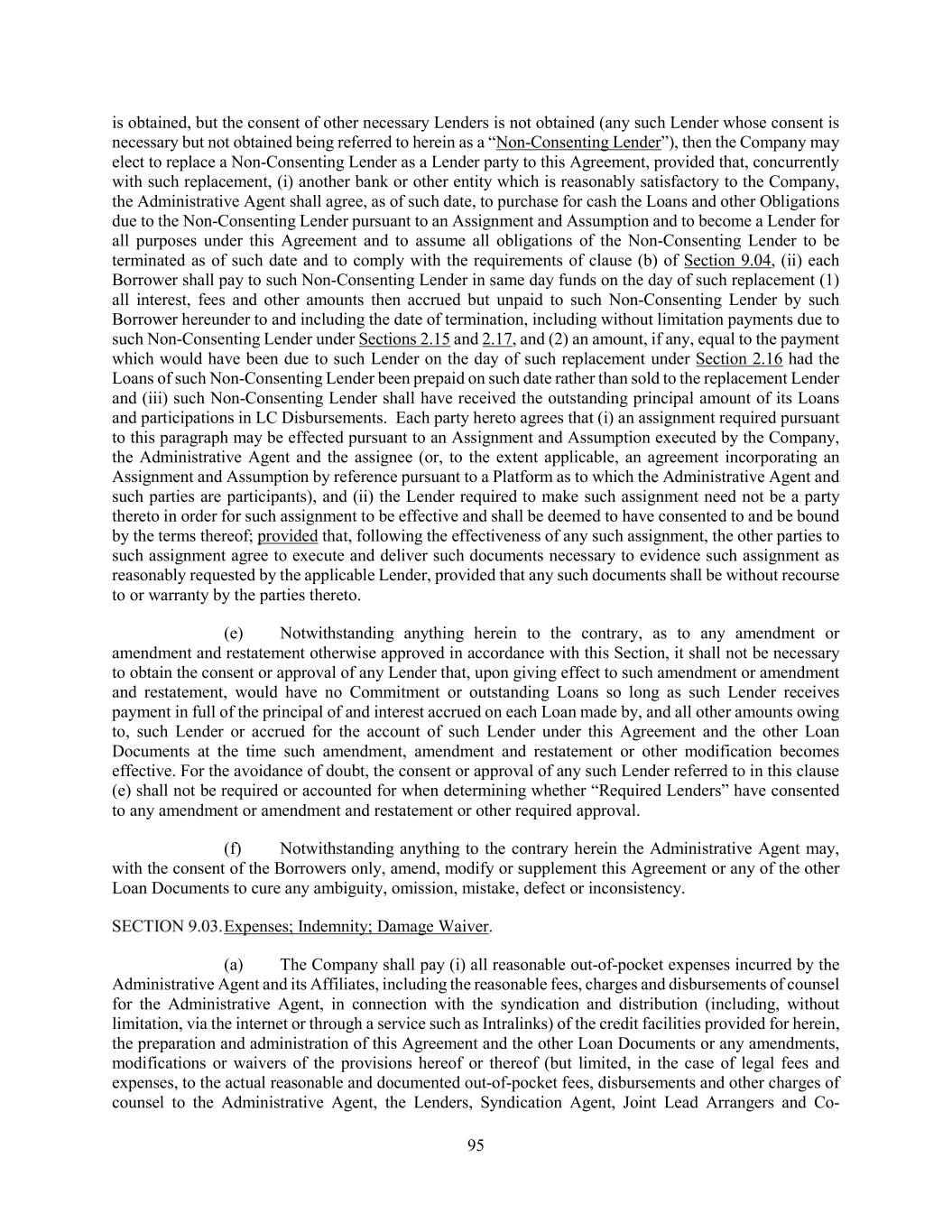 95 is obtained, but the consent of other necessary Lenders is not obtained (any such Lender whose consent is necessary but not obtained being referred to herein as a “Non-Consenting Lender”), then the Company may elect to replace a Non-Consenting Lender as a Lender party to this Agreement, provided that, concurrently with such replacement, (i) another bank or other entity which is reasonably satisfactory to the Company, the Administrative Agent shall agree, as of such date, to purchase for cash the Loans and other Obligations due to the Non-Consenting Lender pursuant to an Assignment and Assumption and to become a Lender for all purposes under this Agreement and to assume all obligations of the Non-Consenting Lender to be terminated as of such date and to comply with the requirements of clause (b) of Section 9.04, (ii) each Borrower shall pay to such Non-Consenting Lender in same day funds on the day of such replacement (1) all interest, fees and other amounts then accrued but unpaid to such Non-Consenting Lender by such Borrower hereunder to and including the date of termination, including without limitation payments due to such Non-Consenting Lender under Sections 2.15 and 2.17, and (2) an amount, if any, equal to the payment which would have been due to such Lender on the day of such replacement under Section 2.16 had the Loans of such Non-Consenting Lender been prepaid on such date rather than sold to the replacement Lender and (iii) such Non-Consenting Lender shall have received the outstanding principal amount of its Loans and participations in LC Disbursements. Each party hereto agrees that (i) an assignment required pursuant to this paragraph may be effected pursuant to an Assignment and Assumption executed by the Company, the Administrative Agent and the assignee (or, to the extent applicable, an agreement incorporating an Assignment and Assumption by reference pursuant to a Platform as to which the Administrative Agent and such parties are participants), and (ii) the Lender required to make such assignment need not be a party thereto in order for such assignment to be effective and shall be deemed to have consented to and be bound by the terms thereof; provided that, following the effectiveness of any such assignment, the other parties to such assignment agree to execute and deliver such documents necessary to evidence such assignment as reasonably requested by the applicable Lender, provided that any such documents shall be without recourse to or warranty by the parties thereto. (e) Notwithstanding anything herein to the contrary, as to any amendment or amendment and restatement otherwise approved in accordance with this Section, it shall not be necessary to obtain the consent or approval of any Lender that, upon giving effect to such amendment or amendment and restatement, would have no Commitment or outstanding Loans so long as such Lender receives payment in full of the principal of and interest accrued on each Loan made by, and all other amounts owing to, such Lender or accrued for the account of such Lender under this Agreement and the other Loan Documents at the time such amendment, amendment and restatement or other modification becomes effective. For the avoidance of doubt, the consent or approval of any such Lender referred to in this clause (e) shall not be required or accounted for when determining whether “Required Lenders” have consented to any amendment or amendment and restatement or other required approval. (f) Notwithstanding anything to the contrary herein the Administrative Agent may, with the consent of the Borrowers only, amend, modify or supplement this Agreement or any of the other Loan Documents to cure any ambiguity, omission, mistake, defect or inconsistency. Expenses; Indemnity; Damage Waiver. (a) The Company shall pay (i) all reasonable out-of-pocket expenses incurred by the Administrative Agent and its Affiliates, including the reasonable fees, charges and disbursements of counsel for the Administrative Agent, in connection with the syndication and distribution (including, without limitation, via the internet or through a service such as Intralinks) of the credit facilities provided for herein, the preparation and administration of this Agreement and the other Loan Documents or any amendments, modifications or waivers of the provisions hereof or thereof (but limited, in the case of legal fees and expenses, to the actual reasonable and documented out-of-pocket fees, disbursements and other charges of counsel to the Administrative Agent, the Lenders, Syndication Agent, Joint Lead Arrangers and Co-