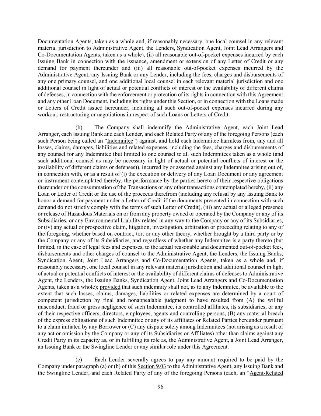 96 Documentation Agents, taken as a whole and, if reasonably necessary, one local counsel in any relevant material jurisdiction to Administrative Agent, the Lenders, Syndication Agent, Joint Lead Arrangers and Co-Documentation Agents, taken as a whole), (ii) all reasonable out-of-pocket expenses incurred by each Issuing Bank in connection with the issuance, amendment or extension of any Letter of Credit or any demand for payment thereunder and (iii) all reasonable out-of-pocket expenses incurred by the Administrative Agent, any Issuing Bank or any Lender, including the fees, charges and disbursements of any one primary counsel, and one additional local counsel in each relevant material jurisdiction and one additional counsel in light of actual or potential conflicts of interest or the availability of different claims of defenses, in connection with the enforcement or protection of its rights in connection with this Agreement and any other Loan Document, including its rights under this Section, or in connection with the Loans made or Letters of Credit issued hereunder, including all such out-of-pocket expenses incurred during any workout, restructuring or negotiations in respect of such Loans or Letters of Credit. (b) The Company shall indemnify the Administrative Agent, each Joint Lead Arranger, each Issuing Bank and each Lender, and each Related Party of any of the foregoing Persons (each such Person being called an “Indemnitee”) against, and hold each Indemnitee harmless from, any and all losses, claims, damages, liabilities and related expenses, including the fees, charges and disbursements of any counsel for any Indemnitee (but limited to one counsel to all such Indemnitees taken as a whole (and such additional counsel as may be necessary in light of actual or potential conflicts of interest or the availability of different claims or defenses)), incurred by or asserted against any Indemnitee arising out of, in connection with, or as a result of (i) the execution or delivery of any Loan Document or any agreement or instrument contemplated thereby, the performance by the parties hereto of their respective obligations thereunder or the consummation of the Transactions or any other transactions contemplated hereby, (ii) any Loan or Letter of Credit or the use of the proceeds therefrom (including any refusal by any Issuing Bank to honor a demand for payment under a Letter of Credit if the documents presented in connection with such demand do not strictly comply with the terms of such Letter of Credit), (iii) any actual or alleged presence or release of Hazardous Materials on or from any property owned or operated by the Company or any of its Subsidiaries, or any Environmental Liability related in any way to the Company or any of its Subsidiaries, or (iv) any actual or prospective claim, litigation, investigation, arbitration or proceeding relating to any of the foregoing, whether based on contract, tort or any other theory, whether brought by a third party or by the Company or any of its Subsidiaries, and regardless of whether any Indemnitee is a party thereto (but limited, in the case of legal fees and expenses, to the actual reasonable and documented out-of-pocket fees, disbursements and other charges of counsel to the Administrative Agent, the Lenders, the Issuing Banks, Syndication Agent, Joint Lead Arrangers and Co-Documentation Agents, taken as a whole and, if reasonably necessary, one local counsel in any relevant material jurisdiction and additional counsel in light of actual or potential conflicts of interest or the availability of different claims of defenses to Administrative Agent, the Lenders, the Issuing Banks, Syndication Agent, Joint Lead Arrangers and Co-Documentation Agents, taken as a whole); provided that such indemnity shall not, as to any Indemnitee, be available to the extent that such losses, claims, damages, liabilities or related expenses are determined by a court of competent jurisdiction by final and nonappealable judgment to have resulted from (A) the willful misconduct, fraud or gross negligence of such Indemnitee, its controlled affiliates, its subsidiaries, or any of their respective officers, directors, employees, agents and controlling persons, (B) any material breach of the express obligations of such Indemnitee or any of its affiliates or Related Parties hereunder pursuant to a claim initiated by any Borrower or (C) any dispute solely among Indemnitees (not arising as a result of any act or omission by the Company or any of its Subsidiaries or Affiliates) other than claims against any Credit Party in its capacity as, or in fulfilling its role as, the Administrative Agent, a Joint Lead Arranger, an Issuing Bank or the Swingline Lender or any similar role under this Agreement. (c) Each Lender severally agrees to pay any amount required to be paid by the Company under paragraph (a) or (b) of this Section 9.03 to the Administrative Agent, any Issuing Bank and the Swingline Lender, and each Related Party of any of the foregoing Persons (each, an “Agent-Related