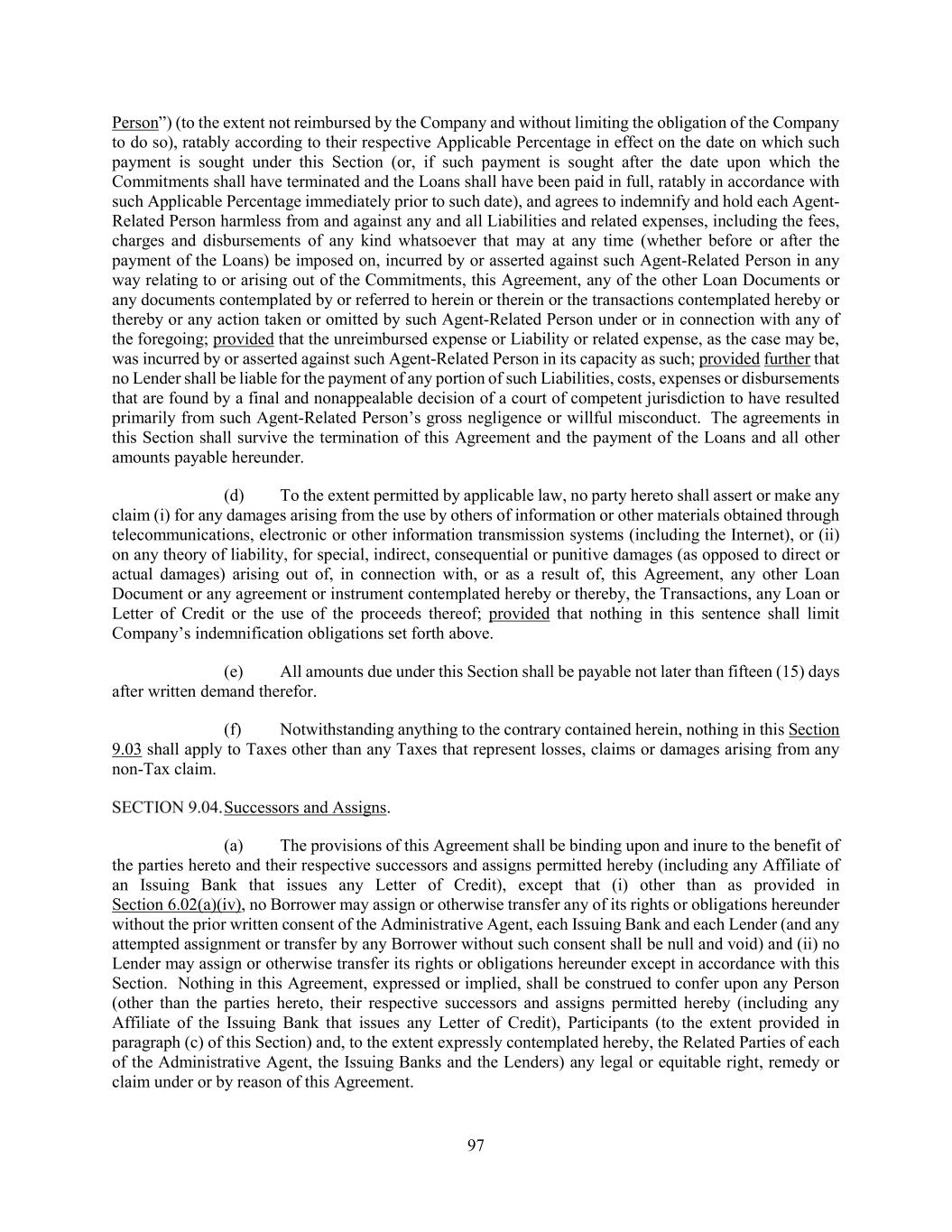 97 Person”) (to the extent not reimbursed by the Company and without limiting the obligation of the Company to do so), ratably according to their respective Applicable Percentage in effect on the date on which such payment is sought under this Section (or, if such payment is sought after the date upon which the Commitments shall have terminated and the Loans shall have been paid in full, ratably in accordance with such Applicable Percentage immediately prior to such date), and agrees to indemnify and hold each Agent- Related Person harmless from and against any and all Liabilities and related expenses, including the fees, charges and disbursements of any kind whatsoever that may at any time (whether before or after the payment of the Loans) be imposed on, incurred by or asserted against such Agent-Related Person in any way relating to or arising out of the Commitments, this Agreement, any of the other Loan Documents or any documents contemplated by or referred to herein or therein or the transactions contemplated hereby or thereby or any action taken or omitted by such Agent-Related Person under or in connection with any of the foregoing; provided that the unreimbursed expense or Liability or related expense, as the case may be, was incurred by or asserted against such Agent-Related Person in its capacity as such; provided further that no Lender shall be liable for the payment of any portion of such Liabilities, costs, expenses or disbursements that are found by a final and nonappealable decision of a court of competent jurisdiction to have resulted primarily from such Agent-Related Person’s gross negligence or willful misconduct. The agreements in this Section shall survive the termination of this Agreement and the payment of the Loans and all other amounts payable hereunder. (d) To the extent permitted by applicable law, no party hereto shall assert or make any claim (i) for any damages arising from the use by others of information or other materials obtained through telecommunications, electronic or other information transmission systems (including the Internet), or (ii) on any theory of liability, for special, indirect, consequential or punitive damages (as opposed to direct or actual damages) arising out of, in connection with, or as a result of, this Agreement, any other Loan Document or any agreement or instrument contemplated hereby or thereby, the Transactions, any Loan or Letter of Credit or the use of the proceeds thereof; provided that nothing in this sentence shall limit Company’s indemnification obligations set forth above. (e) All amounts due under this Section shall be payable not later than fifteen (15) days after written demand therefor. (f) Notwithstanding anything to the contrary contained herein, nothing in this Section 9.03 shall apply to Taxes other than any Taxes that represent losses, claims or damages arising from any non-Tax claim. Successors and Assigns. (a) The provisions of this Agreement shall be binding upon and inure to the benefit of the parties hereto and their respective successors and assigns permitted hereby (including any Affiliate of an Issuing Bank that issues any Letter of Credit), except that (i) other than as provided in Section 6.02(a)(iv), no Borrower may assign or otherwise transfer any of its rights or obligations hereunder without the prior written consent of the Administrative Agent, each Issuing Bank and each Lender (and any attempted assignment or transfer by any Borrower without such consent shall be null and void) and (ii) no Lender may assign or otherwise transfer its rights or obligations hereunder except in accordance with this Section. Nothing in this Agreement, expressed or implied, shall be construed to confer upon any Person (other than the parties hereto, their respective successors and assigns permitted hereby (including any Affiliate of the Issuing Bank that issues any Letter of Credit), Participants (to the extent provided in paragraph (c) of this Section) and, to the extent expressly contemplated hereby, the Related Parties of each of the Administrative Agent, the Issuing Banks and the Lenders) any legal or equitable right, remedy or claim under or by reason of this Agreement.
