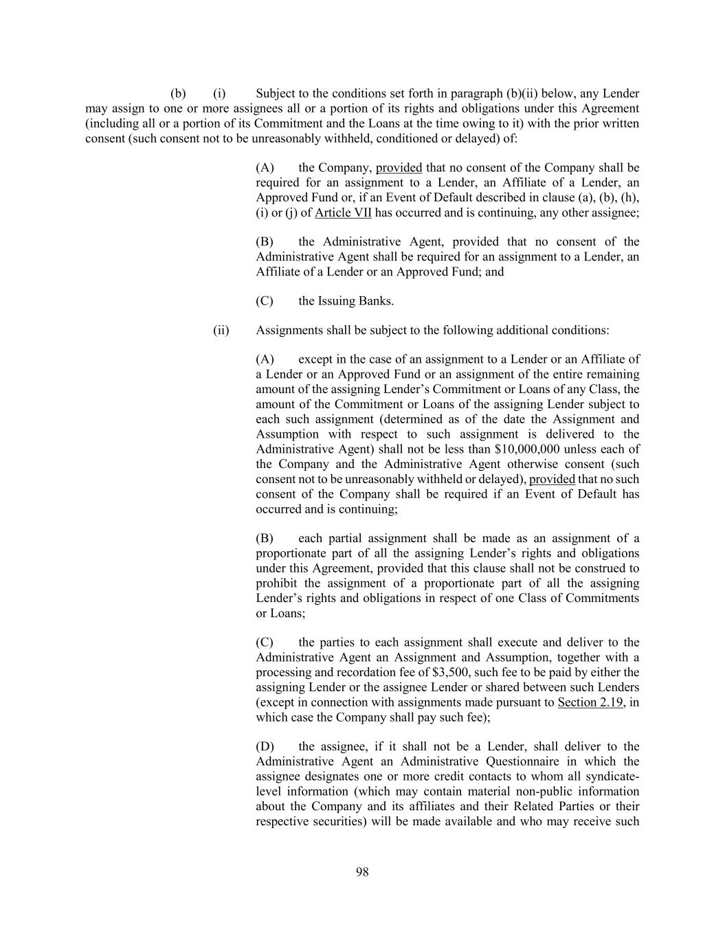 98 (b) (i) Subject to the conditions set forth in paragraph (b)(ii) below, any Lender may assign to one or more assignees all or a portion of its rights and obligations under this Agreement (including all or a portion of its Commitment and the Loans at the time owing to it) with the prior written consent (such consent not to be unreasonably withheld, conditioned or delayed) of: (A) the Company, provided that no consent of the Company shall be required for an assignment to a Lender, an Affiliate of a Lender, an Approved Fund or, if an Event of Default described in clause (a), (b), (h), (i) or (j) of Article VII has occurred and is continuing, any other assignee; (B) the Administrative Agent, provided that no consent of the Administrative Agent shall be required for an assignment to a Lender, an Affiliate of a Lender or an Approved Fund; and (C) the Issuing Banks. (ii) Assignments shall be subject to the following additional conditions: (A) except in the case of an assignment to a Lender or an Affiliate of a Lender or an Approved Fund or an assignment of the entire remaining amount of the assigning Lender’s Commitment or Loans of any Class, the amount of the Commitment or Loans of the assigning Lender subject to each such assignment (determined as of the date the Assignment and Assumption with respect to such assignment is delivered to the Administrative Agent) shall not be less than $10,000,000 unless each of the Company and the Administrative Agent otherwise consent (such consent not to be unreasonably withheld or delayed), provided that no such consent of the Company shall be required if an Event of Default has occurred and is continuing; (B) each partial assignment shall be made as an assignment of a proportionate part of all the assigning Lender’s rights and obligations under this Agreement, provided that this clause shall not be construed to prohibit the assignment of a proportionate part of all the assigning Lender’s rights and obligations in respect of one Class of Commitments or Loans; (C) the parties to each assignment shall execute and deliver to the Administrative Agent an Assignment and Assumption, together with a processing and recordation fee of $3,500, such fee to be paid by either the assigning Lender or the assignee Lender or shared between such Lenders (except in connection with assignments made pursuant to Section 2.19, in which case the Company shall pay such fee); (D) the assignee, if it shall not be a Lender, shall deliver to the Administrative Agent an Administrative Questionnaire in which the assignee designates one or more credit contacts to whom all syndicate- level information (which may contain material non-public information about the Company and its affiliates and their Related Parties or their respective securities) will be made available and who may receive such