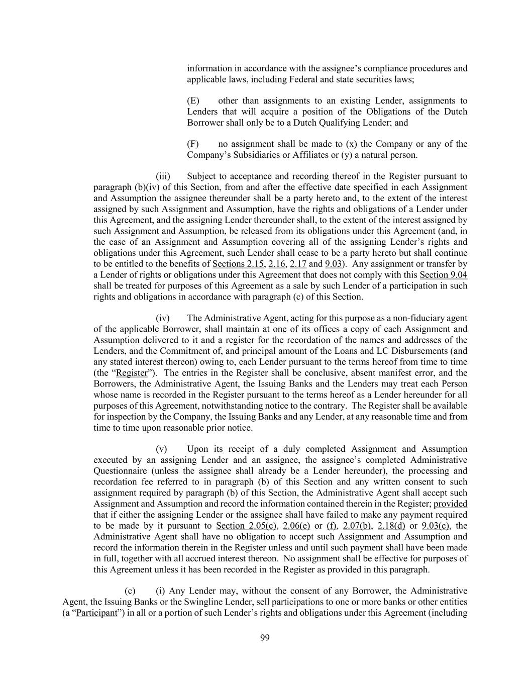 99 information in accordance with the assignee’s compliance procedures and applicable laws, including Federal and state securities laws; (E) other than assignments to an existing Lender, assignments to Lenders that will acquire a position of the Obligations of the Dutch Borrower shall only be to a Dutch Qualifying Lender; and (F) no assignment shall be made to (x) the Company or any of the Company’s Subsidiaries or Affiliates or (y) a natural person. (iii) Subject to acceptance and recording thereof in the Register pursuant to paragraph (b)(iv) of this Section, from and after the effective date specified in each Assignment and Assumption the assignee thereunder shall be a party hereto and, to the extent of the interest assigned by such Assignment and Assumption, have the rights and obligations of a Lender under this Agreement, and the assigning Lender thereunder shall, to the extent of the interest assigned by such Assignment and Assumption, be released from its obligations under this Agreement (and, in the case of an Assignment and Assumption covering all of the assigning Lender’s rights and obligations under this Agreement, such Lender shall cease to be a party hereto but shall continue to be entitled to the benefits of Sections 2.15, 2.16, 2.17 and 9.03). Any assignment or transfer by a Lender of rights or obligations under this Agreement that does not comply with this Section 9.04 shall be treated for purposes of this Agreement as a sale by such Lender of a participation in such rights and obligations in accordance with paragraph (c) of this Section. (iv) The Administrative Agent, acting for this purpose as a non-fiduciary agent of the applicable Borrower, shall maintain at one of its offices a copy of each Assignment and Assumption delivered to it and a register for the recordation of the names and addresses of the Lenders, and the Commitment of, and principal amount of the Loans and LC Disbursements (and any stated interest thereon) owing to, each Lender pursuant to the terms hereof from time to time (the “Register”). The entries in the Register shall be conclusive, absent manifest error, and the Borrowers, the Administrative Agent, the Issuing Banks and the Lenders may treat each Person whose name is recorded in the Register pursuant to the terms hereof as a Lender hereunder for all purposes of this Agreement, notwithstanding notice to the contrary. The Register shall be available for inspection by the Company, the Issuing Banks and any Lender, at any reasonable time and from time to time upon reasonable prior notice. (v) Upon its receipt of a duly completed Assignment and Assumption executed by an assigning Lender and an assignee, the assignee’s completed Administrative Questionnaire (unless the assignee shall already be a Lender hereunder), the processing and recordation fee referred to in paragraph (b) of this Section and any written consent to such assignment required by paragraph (b) of this Section, the Administrative Agent shall accept such Assignment and Assumption and record the information contained therein in the Register; provided that if either the assigning Lender or the assignee shall have failed to make any payment required to be made by it pursuant to Section 2.05(c), 2.06(e) or (f), 2.07(b), 2.18(d) or 9.03(c), the Administrative Agent shall have no obligation to accept such Assignment and Assumption and record the information therein in the Register unless and until such payment shall have been made in full, together with all accrued interest thereon. No assignment shall be effective for purposes of this Agreement unless it has been recorded in the Register as provided in this paragraph. (c) (i) Any Lender may, without the consent of any Borrower, the Administrative Agent, the Issuing Banks or the Swingline Lender, sell participations to one or more banks or other entities (a “Participant”) in all or a portion of such Lender’s rights and obligations under this Agreement (including