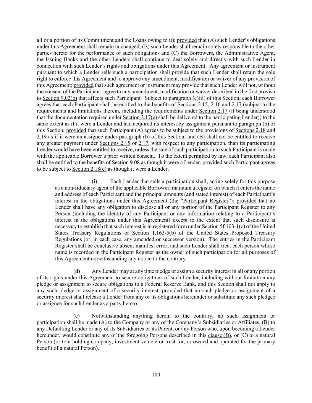 100 all or a portion of its Commitment and the Loans owing to it); provided that (A) such Lender’s obligations under this Agreement shall remain unchanged, (B) such Lender shall remain solely responsible to the other parties hereto for the performance of such obligations and (C) the Borrowers, the Administrative Agent, the Issuing Banks and the other Lenders shall continue to deal solely and directly with such Lender in connection with such Lender’s rights and obligations under this Agreement. Any agreement or instrument pursuant to which a Lender sells such a participation shall provide that such Lender shall retain the sole right to enforce this Agreement and to approve any amendment, modification or waiver of any provision of this Agreement; provided that such agreement or instrument may provide that such Lender will not, without the consent of the Participant, agree to any amendment, modification or waiver described in the first proviso to Section 9.02(b) that affects such Participant. Subject to paragraph (c)(ii) of this Section, each Borrower agrees that each Participant shall be entitled to the benefits of Sections 2.15, 2.16 and 2.17 (subject to the requirements and limitations therein, including the requirements under Section 2.17 (it being understood that the documentation required under Section 2.17(e) shall be delivered to the participating Lender)) to the same extent as if it were a Lender and had acquired its interest by assignment pursuant to paragraph (b) of this Section; provided that such Participant (A) agrees to be subject to the provisions of Sections 2.18 and 2.19 as if it were an assignee under paragraph (b) of this Section; and (B) shall not be entitled to receive any greater payment under Sections 2.15 or 2.17, with respect to any participation, than its participating Lender would have been entitled to receive, unless the sale of such participation to such Participant is made with the applicable Borrower’s prior written consent. To the extent permitted by law, each Participant also shall be entitled to the benefits of Section 9.08 as though it were a Lender, provided such Participant agrees to be subject to Section 2.18(c) as though it were a Lender. (i) Each Lender that sells a participation shall, acting solely for this purpose as a non-fiduciary agent of the applicable Borrower, maintain a register on which it enters the name and address of each Participant and the principal amounts (and stated interest) of each Participant’s interest in the obligations under this Agreement (the “Participant Register”); provided that no Lender shall have any obligation to disclose all or any portion of the Participant Register to any Person (including the identity of any Participant or any information relating to a Participant’s interest in the obligations under this Agreement) except to the extent that such disclosure is necessary to establish that such interest is in registered form under Section 5f.103-1(c) of the United States Treasury Regulations or Section 1.163-5(b) of the United States Proposed Treasury Regulations (or, in each case, any amended or successor version). The entries in the Participant Register shall be conclusive absent manifest error, and such Lender shall treat each person whose name is recorded in the Participant Register as the owner of such participation for all purposes of this Agreement notwithstanding any notice to the contrary. (d) Any Lender may at any time pledge or assign a security interest in all or any portion of its rights under this Agreement to secure obligations of such Lender, including without limitation any pledge or assignment to secure obligations to a Federal Reserve Bank, and this Section shall not apply to any such pledge or assignment of a security interest; provided that no such pledge or assignment of a security interest shall release a Lender from any of its obligations hereunder or substitute any such pledgee or assignee for such Lender as a party hereto. (e) Notwithstanding anything herein to the contrary, no such assignment or participation shall be made (A) to the Company or any of the Company’s Subsidiaries or Affiliates, (B) to any Defaulting Lender or any of its Subsidiaries or its Parent, or any Person who, upon becoming a Lender hereunder, would constitute any of the foregoing Persons described in this clause (B), or (C) to a natural Person (or to a holding company, investment vehicle or trust for, or owned and operated for the primary benefit of a natural Person).