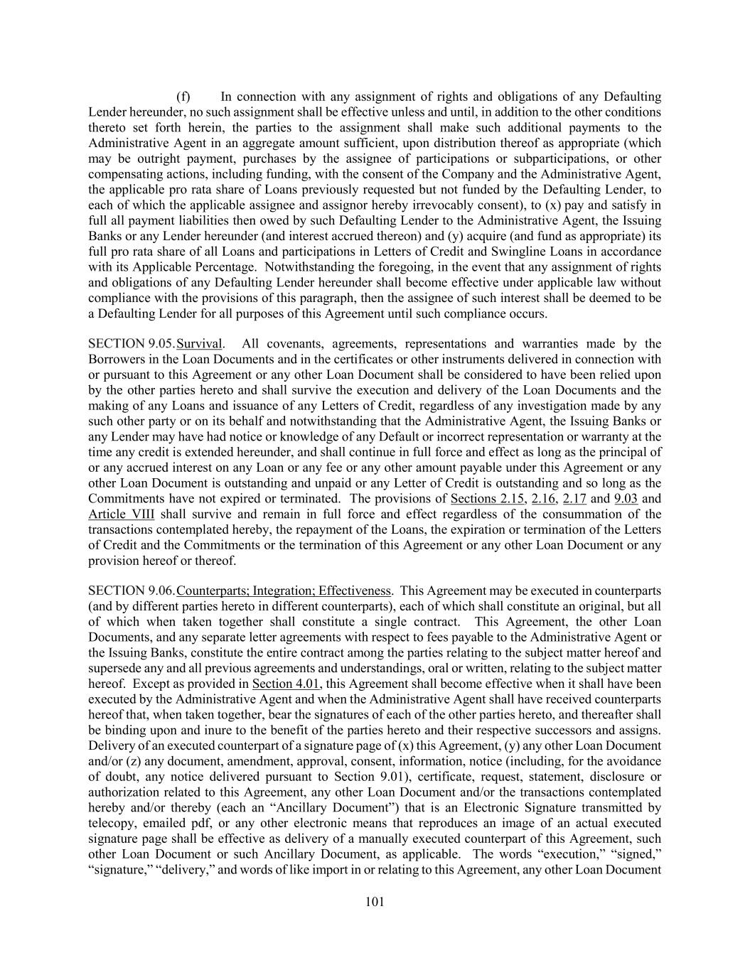 101 (f) In connection with any assignment of rights and obligations of any Defaulting Lender hereunder, no such assignment shall be effective unless and until, in addition to the other conditions thereto set forth herein, the parties to the assignment shall make such additional payments to the Administrative Agent in an aggregate amount sufficient, upon distribution thereof as appropriate (which may be outright payment, purchases by the assignee of participations or subparticipations, or other compensating actions, including funding, with the consent of the Company and the Administrative Agent, the applicable pro rata share of Loans previously requested but not funded by the Defaulting Lender, to each of which the applicable assignee and assignor hereby irrevocably consent), to (x) pay and satisfy in full all payment liabilities then owed by such Defaulting Lender to the Administrative Agent, the Issuing Banks or any Lender hereunder (and interest accrued thereon) and (y) acquire (and fund as appropriate) its full pro rata share of all Loans and participations in Letters of Credit and Swingline Loans in accordance with its Applicable Percentage. Notwithstanding the foregoing, in the event that any assignment of rights and obligations of any Defaulting Lender hereunder shall become effective under applicable law without compliance with the provisions of this paragraph, then the assignee of such interest shall be deemed to be a Defaulting Lender for all purposes of this Agreement until such compliance occurs. Survival. All covenants, agreements, representations and warranties made by the Borrowers in the Loan Documents and in the certificates or other instruments delivered in connection with or pursuant to this Agreement or any other Loan Document shall be considered to have been relied upon by the other parties hereto and shall survive the execution and delivery of the Loan Documents and the making of any Loans and issuance of any Letters of Credit, regardless of any investigation made by any such other party or on its behalf and notwithstanding that the Administrative Agent, the Issuing Banks or any Lender may have had notice or knowledge of any Default or incorrect representation or warranty at the time any credit is extended hereunder, and shall continue in full force and effect as long as the principal of or any accrued interest on any Loan or any fee or any other amount payable under this Agreement or any other Loan Document is outstanding and unpaid or any Letter of Credit is outstanding and so long as the Commitments have not expired or terminated. The provisions of Sections 2.15, 2.16, 2.17 and 9.03 and Article VIII shall survive and remain in full force and effect regardless of the consummation of the transactions contemplated hereby, the repayment of the Loans, the expiration or termination of the Letters of Credit and the Commitments or the termination of this Agreement or any other Loan Document or any provision hereof or thereof. Counterparts; Integration; Effectiveness. This Agreement may be executed in counterparts (and by different parties hereto in different counterparts), each of which shall constitute an original, but all of which when taken together shall constitute a single contract. This Agreement, the other Loan Documents, and any separate letter agreements with respect to fees payable to the Administrative Agent or the Issuing Banks, constitute the entire contract among the parties relating to the subject matter hereof and supersede any and all previous agreements and understandings, oral or written, relating to the subject matter hereof. Except as provided in Section 4.01, this Agreement shall become effective when it shall have been executed by the Administrative Agent and when the Administrative Agent shall have received counterparts hereof that, when taken together, bear the signatures of each of the other parties hereto, and thereafter shall be binding upon and inure to the benefit of the parties hereto and their respective successors and assigns. Delivery of an executed counterpart of a signature page of (x) this Agreement, (y) any other Loan Document and/or (z) any document, amendment, approval, consent, information, notice (including, for the avoidance of doubt, any notice delivered pursuant to Section 9.01), certificate, request, statement, disclosure or authorization related to this Agreement, any other Loan Document and/or the transactions contemplated hereby and/or thereby (each an “Ancillary Document”) that is an Electronic Signature transmitted by telecopy, emailed pdf, or any other electronic means that reproduces an image of an actual executed signature page shall be effective as delivery of a manually executed counterpart of this Agreement, such other Loan Document or such Ancillary Document, as applicable. The words “execution,” “signed,” “signature,” “delivery,” and words of like import in or relating to this Agreement, any other Loan Document