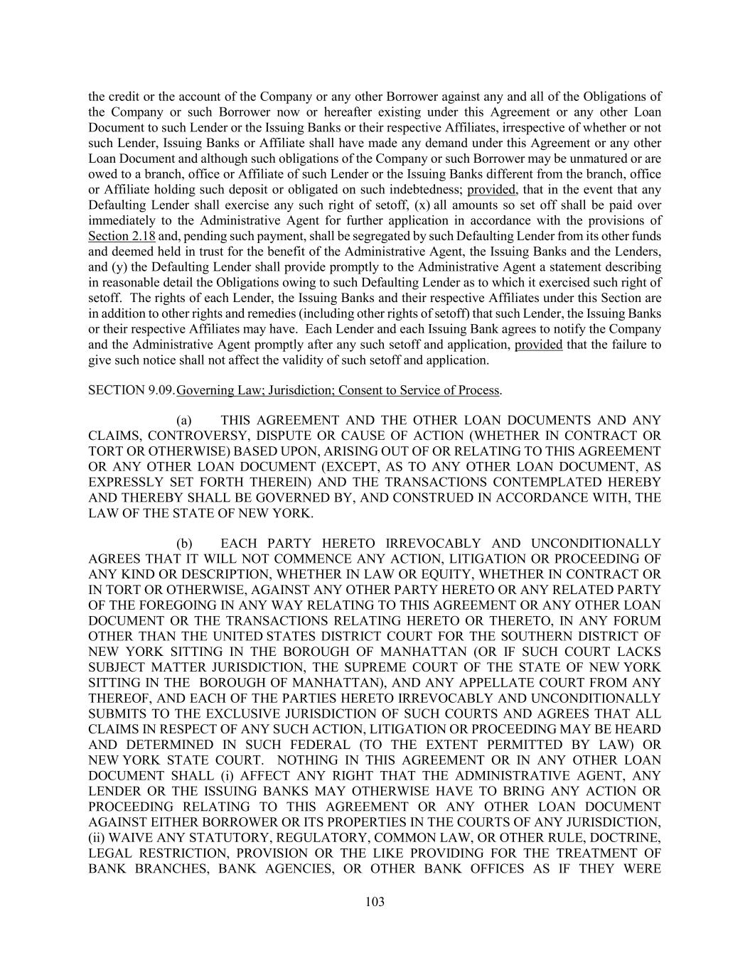 103 the credit or the account of the Company or any other Borrower against any and all of the Obligations of the Company or such Borrower now or hereafter existing under this Agreement or any other Loan Document to such Lender or the Issuing Banks or their respective Affiliates, irrespective of whether or not such Lender, Issuing Banks or Affiliate shall have made any demand under this Agreement or any other Loan Document and although such obligations of the Company or such Borrower may be unmatured or are owed to a branch, office or Affiliate of such Lender or the Issuing Banks different from the branch, office or Affiliate holding such deposit or obligated on such indebtedness; provided, that in the event that any Defaulting Lender shall exercise any such right of setoff, (x) all amounts so set off shall be paid over immediately to the Administrative Agent for further application in accordance with the provisions of Section 2.18 and, pending such payment, shall be segregated by such Defaulting Lender from its other funds and deemed held in trust for the benefit of the Administrative Agent, the Issuing Banks and the Lenders, and (y) the Defaulting Lender shall provide promptly to the Administrative Agent a statement describing in reasonable detail the Obligations owing to such Defaulting Lender as to which it exercised such right of setoff. The rights of each Lender, the Issuing Banks and their respective Affiliates under this Section are in addition to other rights and remedies (including other rights of setoff) that such Lender, the Issuing Banks or their respective Affiliates may have. Each Lender and each Issuing Bank agrees to notify the Company and the Administrative Agent promptly after any such setoff and application, provided that the failure to give such notice shall not affect the validity of such setoff and application. Governing Law; Jurisdiction; Consent to Service of Process. (a) THIS AGREEMENT AND THE OTHER LOAN DOCUMENTS AND ANY CLAIMS, CONTROVERSY, DISPUTE OR CAUSE OF ACTION (WHETHER IN CONTRACT OR TORT OR OTHERWISE) BASED UPON, ARISING OUT OF OR RELATING TO THIS AGREEMENT OR ANY OTHER LOAN DOCUMENT (EXCEPT, AS TO ANY OTHER LOAN DOCUMENT, AS EXPRESSLY SET FORTH THEREIN) AND THE TRANSACTIONS CONTEMPLATED HEREBY AND THEREBY SHALL BE GOVERNED BY, AND CONSTRUED IN ACCORDANCE WITH, THE LAW OF THE STATE OF NEW YORK. (b) EACH PARTY HERETO IRREVOCABLY AND UNCONDITIONALLY AGREES THAT IT WILL NOT COMMENCE ANY ACTION, LITIGATION OR PROCEEDING OF ANY KIND OR DESCRIPTION, WHETHER IN LAW OR EQUITY, WHETHER IN CONTRACT OR IN TORT OR OTHERWISE, AGAINST ANY OTHER PARTY HERETO OR ANY RELATED PARTY OF THE FOREGOING IN ANY WAY RELATING TO THIS AGREEMENT OR ANY OTHER LOAN DOCUMENT OR THE TRANSACTIONS RELATING HERETO OR THERETO, IN ANY FORUM OTHER THAN THE UNITED STATES DISTRICT COURT FOR THE SOUTHERN DISTRICT OF NEW YORK SITTING IN THE BOROUGH OF MANHATTAN (OR IF SUCH COURT LACKS SUBJECT MATTER JURISDICTION, THE SUPREME COURT OF THE STATE OF NEW YORK SITTING IN THE BOROUGH OF MANHATTAN), AND ANY APPELLATE COURT FROM ANY THEREOF, AND EACH OF THE PARTIES HERETO IRREVOCABLY AND UNCONDITIONALLY SUBMITS TO THE EXCLUSIVE JURISDICTION OF SUCH COURTS AND AGREES THAT ALL CLAIMS IN RESPECT OF ANY SUCH ACTION, LITIGATION OR PROCEEDING MAY BE HEARD AND DETERMINED IN SUCH FEDERAL (TO THE EXTENT PERMITTED BY LAW) OR NEW YORK STATE COURT. NOTHING IN THIS AGREEMENT OR IN ANY OTHER LOAN DOCUMENT SHALL (i) AFFECT ANY RIGHT THAT THE ADMINISTRATIVE AGENT, ANY LENDER OR THE ISSUING BANKS MAY OTHERWISE HAVE TO BRING ANY ACTION OR PROCEEDING RELATING TO THIS AGREEMENT OR ANY OTHER LOAN DOCUMENT AGAINST EITHER BORROWER OR ITS PROPERTIES IN THE COURTS OF ANY JURISDICTION, (ii) WAIVE ANY STATUTORY, REGULATORY, COMMON LAW, OR OTHER RULE, DOCTRINE, LEGAL RESTRICTION, PROVISION OR THE LIKE PROVIDING FOR THE TREATMENT OF BANK BRANCHES, BANK AGENCIES, OR OTHER BANK OFFICES AS IF THEY WERE