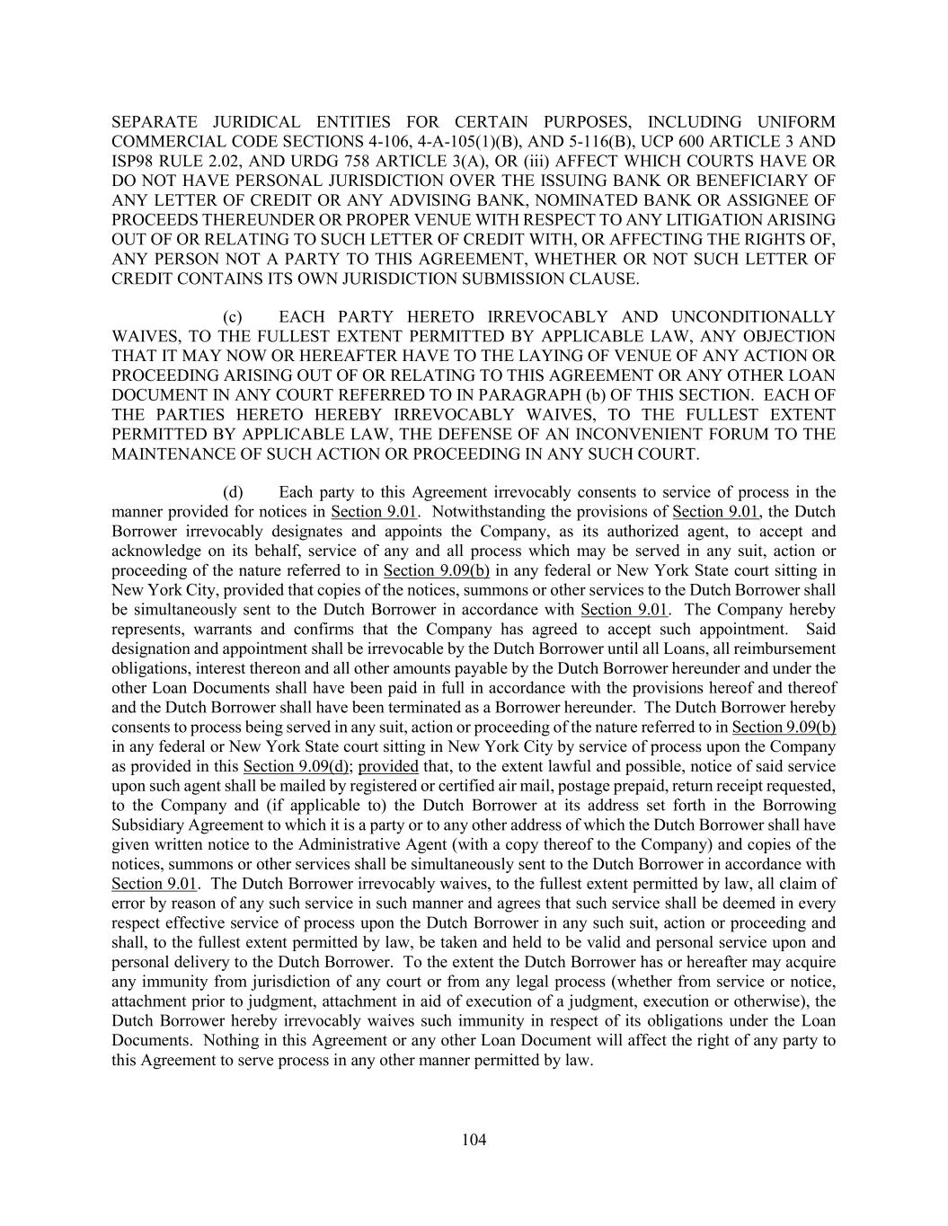 104 SEPARATE JURIDICAL ENTITIES FOR CERTAIN PURPOSES, INCLUDING UNIFORM COMMERCIAL CODE SECTIONS 4-106, 4-A-105(1)(B), AND 5-116(B), UCP 600 ARTICLE 3 AND ISP98 RULE 2.02, AND URDG 758 ARTICLE 3(A), OR (iii) AFFECT WHICH COURTS HAVE OR DO NOT HAVE PERSONAL JURISDICTION OVER THE ISSUING BANK OR BENEFICIARY OF ANY LETTER OF CREDIT OR ANY ADVISING BANK, NOMINATED BANK OR ASSIGNEE OF PROCEEDS THEREUNDER OR PROPER VENUE WITH RESPECT TO ANY LITIGATION ARISING OUT OF OR RELATING TO SUCH LETTER OF CREDIT WITH, OR AFFECTING THE RIGHTS OF, ANY PERSON NOT A PARTY TO THIS AGREEMENT, WHETHER OR NOT SUCH LETTER OF CREDIT CONTAINS ITS OWN JURISDICTION SUBMISSION CLAUSE. (c) EACH PARTY HERETO IRREVOCABLY AND UNCONDITIONALLY WAIVES, TO THE FULLEST EXTENT PERMITTED BY APPLICABLE LAW, ANY OBJECTION THAT IT MAY NOW OR HEREAFTER HAVE TO THE LAYING OF VENUE OF ANY ACTION OR PROCEEDING ARISING OUT OF OR RELATING TO THIS AGREEMENT OR ANY OTHER LOAN DOCUMENT IN ANY COURT REFERRED TO IN PARAGRAPH (b) OF THIS SECTION. EACH OF THE PARTIES HERETO HEREBY IRREVOCABLY WAIVES, TO THE FULLEST EXTENT PERMITTED BY APPLICABLE LAW, THE DEFENSE OF AN INCONVENIENT FORUM TO THE MAINTENANCE OF SUCH ACTION OR PROCEEDING IN ANY SUCH COURT. (d) Each party to this Agreement irrevocably consents to service of process in the manner provided for notices in Section 9.01. Notwithstanding the provisions of Section 9.01, the Dutch Borrower irrevocably designates and appoints the Company, as its authorized agent, to accept and acknowledge on its behalf, service of any and all process which may be served in any suit, action or proceeding of the nature referred to in Section 9.09(b) in any federal or New York State court sitting in New York City, provided that copies of the notices, summons or other services to the Dutch Borrower shall be simultaneously sent to the Dutch Borrower in accordance with Section 9.01. The Company hereby represents, warrants and confirms that the Company has agreed to accept such appointment. Said designation and appointment shall be irrevocable by the Dutch Borrower until all Loans, all reimbursement obligations, interest thereon and all other amounts payable by the Dutch Borrower hereunder and under the other Loan Documents shall have been paid in full in accordance with the provisions hereof and thereof and the Dutch Borrower shall have been terminated as a Borrower hereunder. The Dutch Borrower hereby consents to process being served in any suit, action or proceeding of the nature referred to in Section 9.09(b) in any federal or New York State court sitting in New York City by service of process upon the Company as provided in this Section 9.09(d); provided that, to the extent lawful and possible, notice of said service upon such agent shall be mailed by registered or certified air mail, postage prepaid, return receipt requested, to the Company and (if applicable to) the Dutch Borrower at its address set forth in the Borrowing Subsidiary Agreement to which it is a party or to any other address of which the Dutch Borrower shall have given written notice to the Administrative Agent (with a copy thereof to the Company) and copies of the notices, summons or other services shall be simultaneously sent to the Dutch Borrower in accordance with Section 9.01. The Dutch Borrower irrevocably waives, to the fullest extent permitted by law, all claim of error by reason of any such service in such manner and agrees that such service shall be deemed in every respect effective service of process upon the Dutch Borrower in any such suit, action or proceeding and shall, to the fullest extent permitted by law, be taken and held to be valid and personal service upon and personal delivery to the Dutch Borrower. To the extent the Dutch Borrower has or hereafter may acquire any immunity from jurisdiction of any court or from any legal process (whether from service or notice, attachment prior to judgment, attachment in aid of execution of a judgment, execution or otherwise), the Dutch Borrower hereby irrevocably waives such immunity in respect of its obligations under the Loan Documents. Nothing in this Agreement or any other Loan Document will affect the right of any party to this Agreement to serve process in any other manner permitted by law.