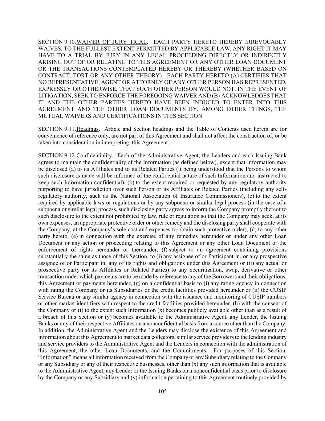 105 WAIVER OF JURY TRIAL. EACH PARTY HERETO HEREBY IRREVOCABLY WAIVES, TO THE FULLEST EXTENT PERMITTED BY APPLICABLE LAW, ANY RIGHT IT MAY HAVE TO A TRIAL BY JURY IN ANY LEGAL PROCEEDING DIRECTLY OR INDIRECTLY ARISING OUT OF OR RELATING TO THIS AGREEMENT OR ANY OTHER LOAN DOCUMENT OR THE TRANSACTIONS CONTEMPLATED HEREBY OR THEREBY (WHETHER BASED ON CONTRACT, TORT OR ANY OTHER THEORY). EACH PARTY HERETO (A) CERTIFIES THAT NO REPRESENTATIVE, AGENT OR ATTORNEY OF ANY OTHER PERSON HAS REPRESENTED, EXPRESSLY OR OTHERWISE, THAT SUCH OTHER PERSON WOULD NOT, IN THE EVENT OF LITIGATION, SEEK TO ENFORCE THE FOREGOING WAIVER AND (B) ACKNOWLEDGES THAT IT AND THE OTHER PARTIES HERETO HAVE BEEN INDUCED TO ENTER INTO THIS AGREEMENT AND THE OTHER LOAN DOCUMENTS BY, AMONG OTHER THINGS, THE MUTUAL WAIVERS AND CERTIFICATIONS IN THIS SECTION. Headings. Article and Section headings and the Table of Contents used herein are for convenience of reference only, are not part of this Agreement and shall not affect the construction of, or be taken into consideration in interpreting, this Agreement. Confidentiality. Each of the Administrative Agent, the Lenders and each Issuing Bank agrees to maintain the confidentiality of the Information (as defined below), except that Information may be disclosed (a) to its Affiliates and to its Related Parties (it being understood that the Persons to whom such disclosure is made will be informed of the confidential nature of such Information and instructed to keep such Information confidential), (b) to the extent required or requested by any regulatory authority purporting to have jurisdiction over such Person or its Affiliates or Related Parties (including any self- regulatory authority, such as the National Association of Insurance Commissioners), (c) to the extent required by applicable laws or regulations or by any subpoena or similar legal process (in the case of a subpoena or similar legal process, such disclosing party agrees to inform the Company promptly thereof to such disclosure to the extent not prohibited by law, rule or regulation so that the Company may seek, at its own expenses, an appropriate protective order or other remedy and the disclosing party shall cooperate with the Company, at the Company’s sole cost and expenses to obtain such protective order), (d) to any other party hereto, (e) in connection with the exercise of any remedies hereunder or under any other Loan Document or any action or proceeding relating to this Agreement or any other Loan Document or the enforcement of rights hereunder or thereunder, (f) subject to an agreement containing provisions substantially the same as those of this Section, to (i) any assignee of or Participant in, or any prospective assignee of or Participant in, any of its rights and obligations under this Agreement or (ii) any actual or prospective party (or its Affiliates or Related Parties) to any Securitization, swap, derivative or other transaction under which payments are to be made by reference to any of the Borrowers and their obligations, this Agreement or payments hereunder, (g) on a confidential basis to (i) any rating agency in connection with rating the Company or its Subsidiaries or the credit facilities provided hereunder or (ii) the CUSIP Service Bureau or any similar agency in connection with the issuance and monitoring of CUSIP numbers or other market identifiers with respect to the credit facilities provided hereunder, (h) with the consent of the Company or (i) to the extent such Information (x) becomes publicly available other than as a result of a breach of this Section or (y) becomes available to the Administrative Agent, any Lender, the Issuing Banks or any of their respective Affiliates on a nonconfidential basis from a source other than the Company. In addition, the Administrative Agent and the Lenders may disclose the existence of this Agreement and information about this Agreement to market data collectors, similar service providers to the lending industry and service providers to the Administrative Agent and the Lenders in connection with the administration of this Agreement, the other Loan Documents, and the Commitments. For purposes of this Section, “Information” means all information received from the Company or any Subsidiary relating to the Company or any Subsidiary or any of their respective businesses, other than (x) any such information that is available to the Administrative Agent, any Lender or the Issuing Banks on a nonconfidential basis prior to disclosure by the Company or any Subsidiary and (y) information pertaining to this Agreement routinely provided by