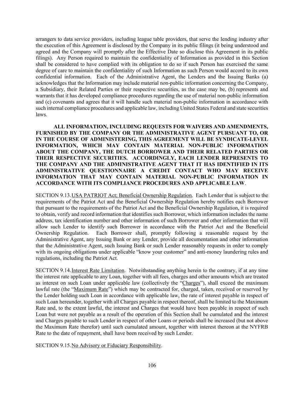 106 arrangers to data service providers, including league table providers, that serve the lending industry after the execution of this Agreement is disclosed by the Company in its public filings (it being understood and agreed and the Company will promptly after the Effective Date so disclose this Agreement in its public filings). Any Person required to maintain the confidentiality of Information as provided in this Section shall be considered to have complied with its obligation to do so if such Person has exercised the same degree of care to maintain the confidentiality of such Information as such Person would accord to its own confidential information. Each of the Administrative Agent, the Lenders and the Issuing Banks (a) acknowledges that the Information may include material non-public information concerning the Company, a Subsidiary, their Related Parties or their respective securities, as the case may be, (b) represents and warrants that it has developed compliance procedures regarding the use of material non-public information and (c) covenants and agrees that it will handle such material non-public information in accordance with such internal compliance procedures and applicable law, including United States Federal and state securities laws. ALL INFORMATION, INCLUDING REQUESTS FOR WAIVERS AND AMENDMENTS, FURNISHED BY THE COMPANY OR THE ADMINISTRATIVE AGENT PURSUANT TO, OR IN THE COURSE OF ADMINISTERING, THIS AGREEMENT WILL BE SYNDICATE-LEVEL INFORMATION, WHICH MAY CONTAIN MATERIAL NON-PUBLIC INFORMATION ABOUT THE COMPANY, THE DUTCH BORROWER AND THEIR RELATED PARTIES OR THEIR RESPECTIVE SECURITIES. ACCORDINGLY, EACH LENDER REPRESENTS TO THE COMPANY AND THE ADMINISTRATIVE AGENT THAT IT HAS IDENTIFIED IN ITS ADMINISTRATIVE QUESTIONNAIRE A CREDIT CONTACT WHO MAY RECEIVE INFORMATION THAT MAY CONTAIN MATERIAL NON-PUBLIC INFORMATION IN ACCORDANCE WITH ITS COMPLIANCE PROCEDURES AND APPLICABLE LAW. USA PATRIOT Act; Beneficial Ownership Regulation. Each Lender that is subject to the requirements of the Patriot Act and the Beneficial Ownership Regulation hereby notifies each Borrower that pursuant to the requirements of the Patriot Act and the Beneficial Ownership Regulation, it is required to obtain, verify and record information that identifies such Borrower, which information includes the name address, tax identification number and other information of such Borrower and other information that will allow such Lender to identify such Borrower in accordance with the Patriot Act and the Beneficial Ownership Regulation. Each Borrower shall, promptly following a reasonable request by the Administrative Agent, any Issuing Bank or any Lender, provide all documentation and other information that the Administrative Agent, such Issuing Bank or such Lender reasonably requests in order to comply with its ongoing obligations under applicable “know your customer” and anti-money laundering rules and regulations, including the Patriot Act. Interest Rate Limitation. Notwithstanding anything herein to the contrary, if at any time the interest rate applicable to any Loan, together with all fees, charges and other amounts which are treated as interest on such Loan under applicable law (collectively the “Charges”), shall exceed the maximum lawful rate (the “Maximum Rate”) which may be contracted for, charged, taken, received or reserved by the Lender holding such Loan in accordance with applicable law, the rate of interest payable in respect of such Loan hereunder, together with all Charges payable in respect thereof, shall be limited to the Maximum Rate and, to the extent lawful, the interest and Charges that would have been payable in respect of such Loan but were not payable as a result of the operation of this Section shall be cumulated and the interest and Charges payable to such Lender in respect of other Loans or periods shall be increased (but not above the Maximum Rate therefor) until such cumulated amount, together with interest thereon at the NYFRB Rate to the date of repayment, shall have been received by such Lender. No Advisory or Fiduciary Responsibility.
