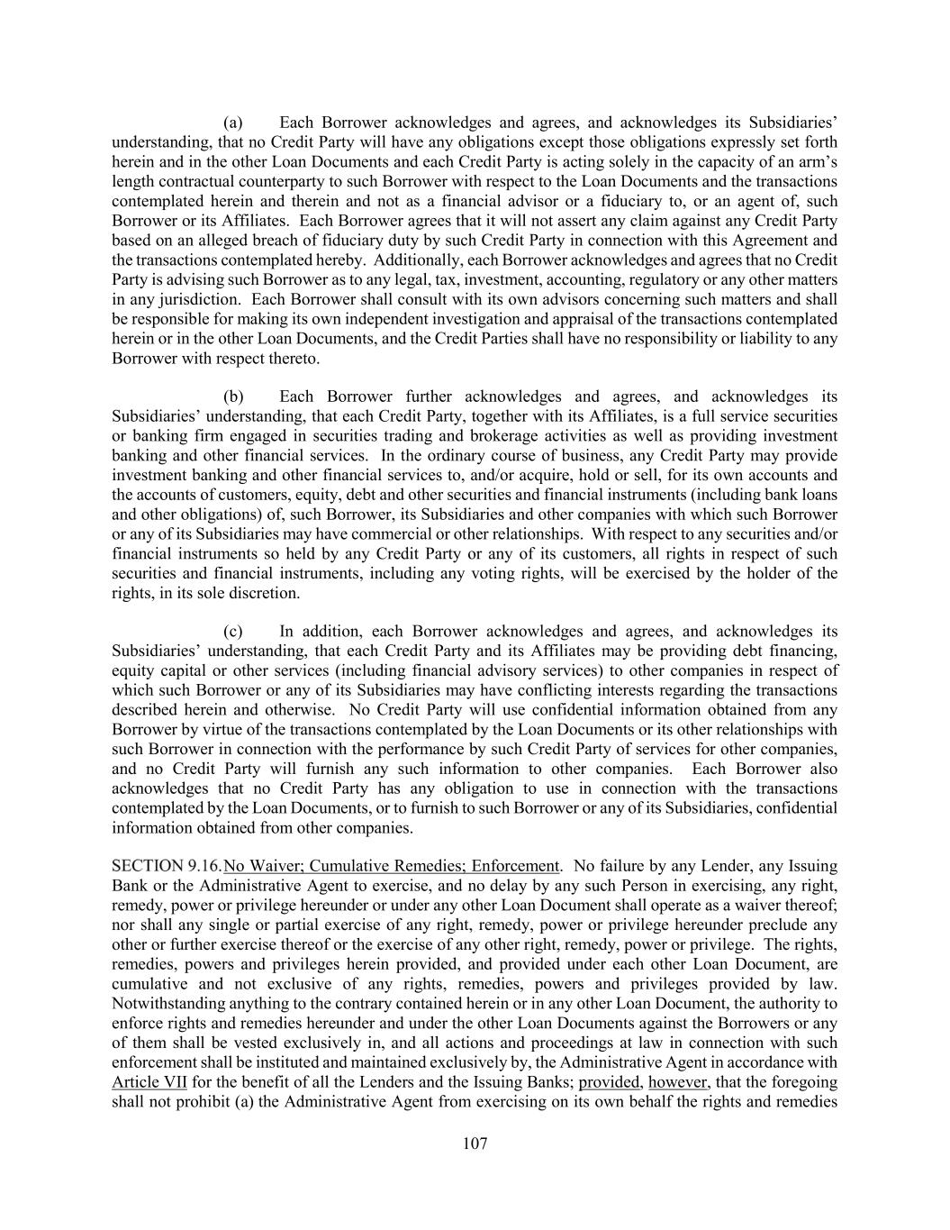107 (a) Each Borrower acknowledges and agrees, and acknowledges its Subsidiaries’ understanding, that no Credit Party will have any obligations except those obligations expressly set forth herein and in the other Loan Documents and each Credit Party is acting solely in the capacity of an arm’s length contractual counterparty to such Borrower with respect to the Loan Documents and the transactions contemplated herein and therein and not as a financial advisor or a fiduciary to, or an agent of, such Borrower or its Affiliates. Each Borrower agrees that it will not assert any claim against any Credit Party based on an alleged breach of fiduciary duty by such Credit Party in connection with this Agreement and the transactions contemplated hereby. Additionally, each Borrower acknowledges and agrees that no Credit Party is advising such Borrower as to any legal, tax, investment, accounting, regulatory or any other matters in any jurisdiction. Each Borrower shall consult with its own advisors concerning such matters and shall be responsible for making its own independent investigation and appraisal of the transactions contemplated herein or in the other Loan Documents, and the Credit Parties shall have no responsibility or liability to any Borrower with respect thereto. (b) Each Borrower further acknowledges and agrees, and acknowledges its Subsidiaries’ understanding, that each Credit Party, together with its Affiliates, is a full service securities or banking firm engaged in securities trading and brokerage activities as well as providing investment banking and other financial services. In the ordinary course of business, any Credit Party may provide investment banking and other financial services to, and/or acquire, hold or sell, for its own accounts and the accounts of customers, equity, debt and other securities and financial instruments (including bank loans and other obligations) of, such Borrower, its Subsidiaries and other companies with which such Borrower or any of its Subsidiaries may have commercial or other relationships. With respect to any securities and/or financial instruments so held by any Credit Party or any of its customers, all rights in respect of such securities and financial instruments, including any voting rights, will be exercised by the holder of the rights, in its sole discretion. (c) In addition, each Borrower acknowledges and agrees, and acknowledges its Subsidiaries’ understanding, that each Credit Party and its Affiliates may be providing debt financing, equity capital or other services (including financial advisory services) to other companies in respect of which such Borrower or any of its Subsidiaries may have conflicting interests regarding the transactions described herein and otherwise. No Credit Party will use confidential information obtained from any Borrower by virtue of the transactions contemplated by the Loan Documents or its other relationships with such Borrower in connection with the performance by such Credit Party of services for other companies, and no Credit Party will furnish any such information to other companies. Each Borrower also acknowledges that no Credit Party has any obligation to use in connection with the transactions contemplated by the Loan Documents, or to furnish to such Borrower or any of its Subsidiaries, confidential information obtained from other companies. No Waiver; Cumulative Remedies; Enforcement. No failure by any Lender, any Issuing Bank or the Administrative Agent to exercise, and no delay by any such Person in exercising, any right, remedy, power or privilege hereunder or under any other Loan Document shall operate as a waiver thereof; nor shall any single or partial exercise of any right, remedy, power or privilege hereunder preclude any other or further exercise thereof or the exercise of any other right, remedy, power or privilege. The rights, remedies, powers and privileges herein provided, and provided under each other Loan Document, are cumulative and not exclusive of any rights, remedies, powers and privileges provided by law. Notwithstanding anything to the contrary contained herein or in any other Loan Document, the authority to enforce rights and remedies hereunder and under the other Loan Documents against the Borrowers or any of them shall be vested exclusively in, and all actions and proceedings at law in connection with such enforcement shall be instituted and maintained exclusively by, the Administrative Agent in accordance with Article VII for the benefit of all the Lenders and the Issuing Banks; provided, however, that the foregoing shall not prohibit (a) the Administrative Agent from exercising on its own behalf the rights and remedies