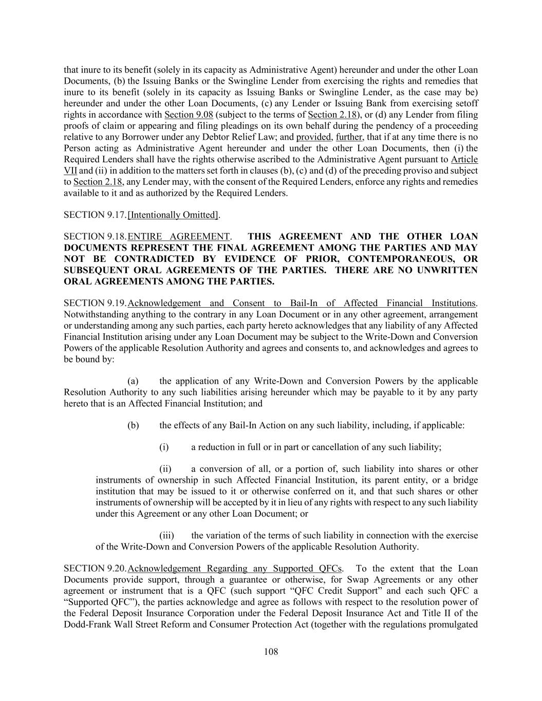 108 that inure to its benefit (solely in its capacity as Administrative Agent) hereunder and under the other Loan Documents, (b) the Issuing Banks or the Swingline Lender from exercising the rights and remedies that inure to its benefit (solely in its capacity as Issuing Banks or Swingline Lender, as the case may be) hereunder and under the other Loan Documents, (c) any Lender or Issuing Bank from exercising setoff rights in accordance with Section 9.08 (subject to the terms of Section 2.18), or (d) any Lender from filing proofs of claim or appearing and filing pleadings on its own behalf during the pendency of a proceeding relative to any Borrower under any Debtor Relief Law; and provided, further, that if at any time there is no Person acting as Administrative Agent hereunder and under the other Loan Documents, then (i) the Required Lenders shall have the rights otherwise ascribed to the Administrative Agent pursuant to Article VII and (ii) in addition to the matters set forth in clauses (b), (c) and (d) of the preceding proviso and subject to Section 2.18, any Lender may, with the consent of the Required Lenders, enforce any rights and remedies available to it and as authorized by the Required Lenders. [Intentionally Omitted]. ENTIRE AGREEMENT. THIS AGREEMENT AND THE OTHER LOAN DOCUMENTS REPRESENT THE FINAL AGREEMENT AMONG THE PARTIES AND MAY NOT BE CONTRADICTED BY EVIDENCE OF PRIOR, CONTEMPORANEOUS, OR SUBSEQUENT ORAL AGREEMENTS OF THE PARTIES. THERE ARE NO UNWRITTEN ORAL AGREEMENTS AMONG THE PARTIES. Acknowledgement and Consent to Bail-In of Affected Financial Institutions. Notwithstanding anything to the contrary in any Loan Document or in any other agreement, arrangement or understanding among any such parties, each party hereto acknowledges that any liability of any Affected Financial Institution arising under any Loan Document may be subject to the Write-Down and Conversion Powers of the applicable Resolution Authority and agrees and consents to, and acknowledges and agrees to be bound by: (a) the application of any Write-Down and Conversion Powers by the applicable Resolution Authority to any such liabilities arising hereunder which may be payable to it by any party hereto that is an Affected Financial Institution; and (b) the effects of any Bail-In Action on any such liability, including, if applicable: (i) a reduction in full or in part or cancellation of any such liability; (ii) a conversion of all, or a portion of, such liability into shares or other instruments of ownership in such Affected Financial Institution, its parent entity, or a bridge institution that may be issued to it or otherwise conferred on it, and that such shares or other instruments of ownership will be accepted by it in lieu of any rights with respect to any such liability under this Agreement or any other Loan Document; or (iii) the variation of the terms of such liability in connection with the exercise of the Write-Down and Conversion Powers of the applicable Resolution Authority. Acknowledgement Regarding any Supported QFCs. To the extent that the Loan Documents provide support, through a guarantee or otherwise, for Swap Agreements or any other agreement or instrument that is a QFC (such support “QFC Credit Support” and each such QFC a “Supported QFC”), the parties acknowledge and agree as follows with respect to the resolution power of the Federal Deposit Insurance Corporation under the Federal Deposit Insurance Act and Title II of the Dodd-Frank Wall Street Reform and Consumer Protection Act (together with the regulations promulgated