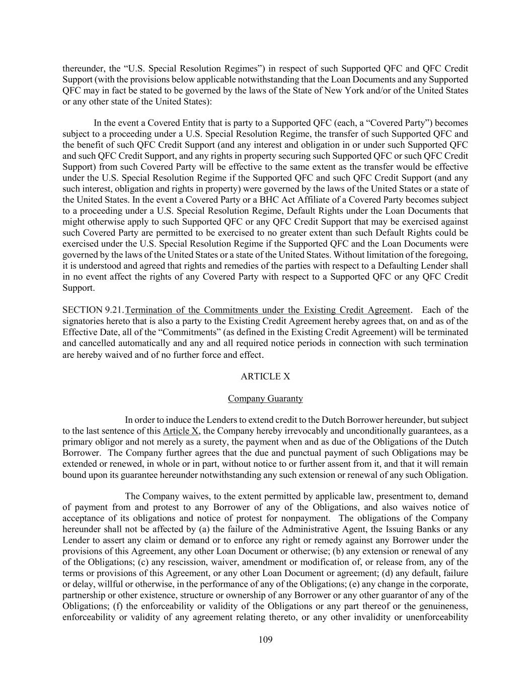 109 thereunder, the “U.S. Special Resolution Regimes”) in respect of such Supported QFC and QFC Credit Support (with the provisions below applicable notwithstanding that the Loan Documents and any Supported QFC may in fact be stated to be governed by the laws of the State of New York and/or of the United States or any other state of the United States): In the event a Covered Entity that is party to a Supported QFC (each, a “Covered Party”) becomes subject to a proceeding under a U.S. Special Resolution Regime, the transfer of such Supported QFC and the benefit of such QFC Credit Support (and any interest and obligation in or under such Supported QFC and such QFC Credit Support, and any rights in property securing such Supported QFC or such QFC Credit Support) from such Covered Party will be effective to the same extent as the transfer would be effective under the U.S. Special Resolution Regime if the Supported QFC and such QFC Credit Support (and any such interest, obligation and rights in property) were governed by the laws of the United States or a state of the United States. In the event a Covered Party or a BHC Act Affiliate of a Covered Party becomes subject to a proceeding under a U.S. Special Resolution Regime, Default Rights under the Loan Documents that might otherwise apply to such Supported QFC or any QFC Credit Support that may be exercised against such Covered Party are permitted to be exercised to no greater extent than such Default Rights could be exercised under the U.S. Special Resolution Regime if the Supported QFC and the Loan Documents were governed by the laws of the United States or a state of the United States. Without limitation of the foregoing, it is understood and agreed that rights and remedies of the parties with respect to a Defaulting Lender shall in no event affect the rights of any Covered Party with respect to a Supported QFC or any QFC Credit Support. Termination of the Commitments under the Existing Credit Agreement. Each of the signatories hereto that is also a party to the Existing Credit Agreement hereby agrees that, on and as of the Effective Date, all of the “Commitments” (as defined in the Existing Credit Agreement) will be terminated and cancelled automatically and any and all required notice periods in connection with such termination are hereby waived and of no further force and effect. ARTICLE X Company Guaranty In order to induce the Lenders to extend credit to the Dutch Borrower hereunder, but subject to the last sentence of this Article X, the Company hereby irrevocably and unconditionally guarantees, as a primary obligor and not merely as a surety, the payment when and as due of the Obligations of the Dutch Borrower. The Company further agrees that the due and punctual payment of such Obligations may be extended or renewed, in whole or in part, without notice to or further assent from it, and that it will remain bound upon its guarantee hereunder notwithstanding any such extension or renewal of any such Obligation. The Company waives, to the extent permitted by applicable law, presentment to, demand of payment from and protest to any Borrower of any of the Obligations, and also waives notice of acceptance of its obligations and notice of protest for nonpayment. The obligations of the Company hereunder shall not be affected by (a) the failure of the Administrative Agent, the Issuing Banks or any Lender to assert any claim or demand or to enforce any right or remedy against any Borrower under the provisions of this Agreement, any other Loan Document or otherwise; (b) any extension or renewal of any of the Obligations; (c) any rescission, waiver, amendment or modification of, or release from, any of the terms or provisions of this Agreement, or any other Loan Document or agreement; (d) any default, failure or delay, willful or otherwise, in the performance of any of the Obligations; (e) any change in the corporate, partnership or other existence, structure or ownership of any Borrower or any other guarantor of any of the Obligations; (f) the enforceability or validity of the Obligations or any part thereof or the genuineness, enforceability or validity of any agreement relating thereto, or any other invalidity or unenforceability