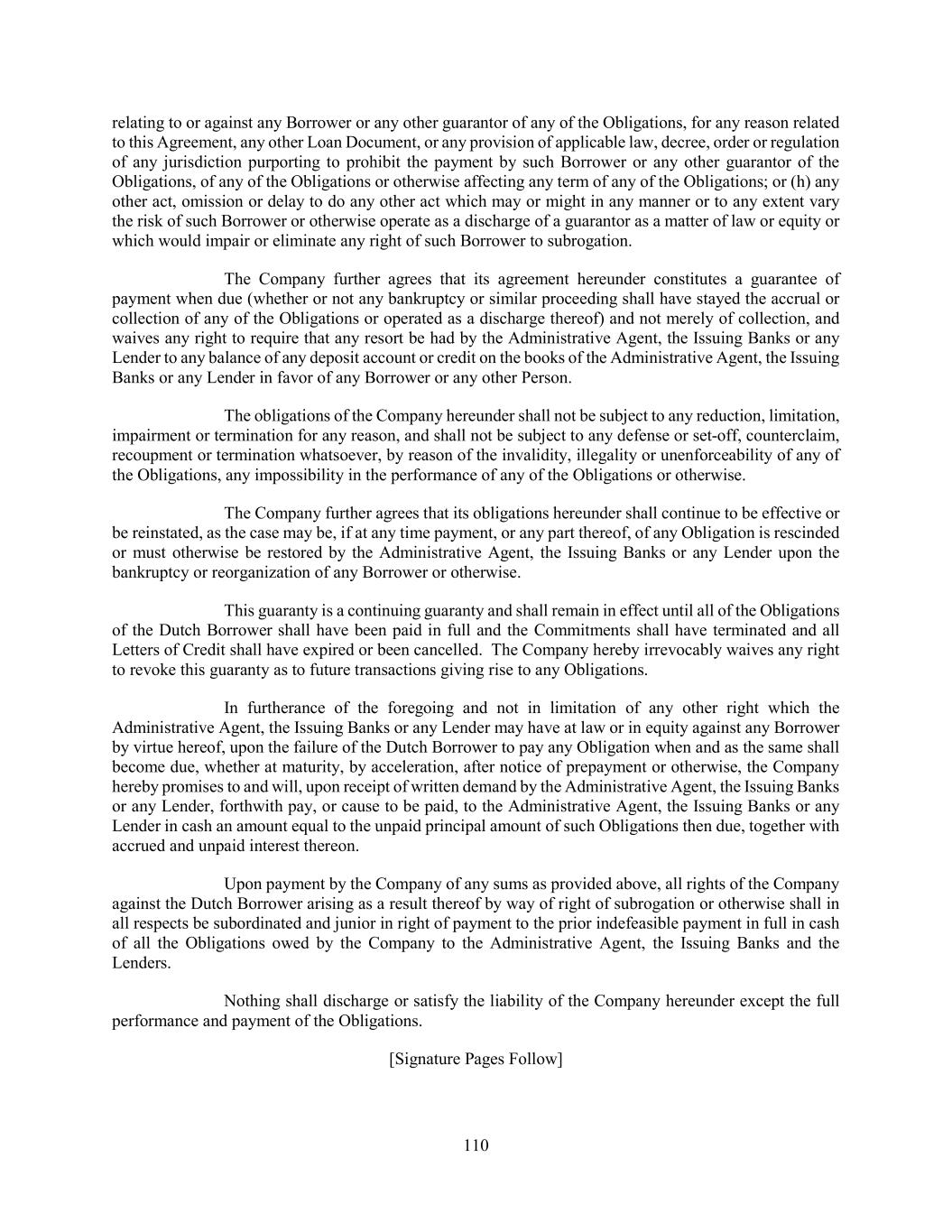 110 relating to or against any Borrower or any other guarantor of any of the Obligations, for any reason related to this Agreement, any other Loan Document, or any provision of applicable law, decree, order or regulation of any jurisdiction purporting to prohibit the payment by such Borrower or any other guarantor of the Obligations, of any of the Obligations or otherwise affecting any term of any of the Obligations; or (h) any other act, omission or delay to do any other act which may or might in any manner or to any extent vary the risk of such Borrower or otherwise operate as a discharge of a guarantor as a matter of law or equity or which would impair or eliminate any right of such Borrower to subrogation. The Company further agrees that its agreement hereunder constitutes a guarantee of payment when due (whether or not any bankruptcy or similar proceeding shall have stayed the accrual or collection of any of the Obligations or operated as a discharge thereof) and not merely of collection, and waives any right to require that any resort be had by the Administrative Agent, the Issuing Banks or any Lender to any balance of any deposit account or credit on the books of the Administrative Agent, the Issuing Banks or any Lender in favor of any Borrower or any other Person. The obligations of the Company hereunder shall not be subject to any reduction, limitation, impairment or termination for any reason, and shall not be subject to any defense or set-off, counterclaim, recoupment or termination whatsoever, by reason of the invalidity, illegality or unenforceability of any of the Obligations, any impossibility in the performance of any of the Obligations or otherwise. The Company further agrees that its obligations hereunder shall continue to be effective or be reinstated, as the case may be, if at any time payment, or any part thereof, of any Obligation is rescinded or must otherwise be restored by the Administrative Agent, the Issuing Banks or any Lender upon the bankruptcy or reorganization of any Borrower or otherwise. This guaranty is a continuing guaranty and shall remain in effect until all of the Obligations of the Dutch Borrower shall have been paid in full and the Commitments shall have terminated and all Letters of Credit shall have expired or been cancelled. The Company hereby irrevocably waives any right to revoke this guaranty as to future transactions giving rise to any Obligations. In furtherance of the foregoing and not in limitation of any other right which the Administrative Agent, the Issuing Banks or any Lender may have at law or in equity against any Borrower by virtue hereof, upon the failure of the Dutch Borrower to pay any Obligation when and as the same shall become due, whether at maturity, by acceleration, after notice of prepayment or otherwise, the Company hereby promises to and will, upon receipt of written demand by the Administrative Agent, the Issuing Banks or any Lender, forthwith pay, or cause to be paid, to the Administrative Agent, the Issuing Banks or any Lender in cash an amount equal to the unpaid principal amount of such Obligations then due, together with accrued and unpaid interest thereon. Upon payment by the Company of any sums as provided above, all rights of the Company against the Dutch Borrower arising as a result thereof by way of right of subrogation or otherwise shall in all respects be subordinated and junior in right of payment to the prior indefeasible payment in full in cash of all the Obligations owed by the Company to the Administrative Agent, the Issuing Banks and the Lenders. Nothing shall discharge or satisfy the liability of the Company hereunder except the full performance and payment of the Obligations. [Signature Pages Follow]